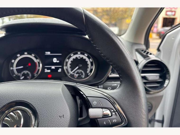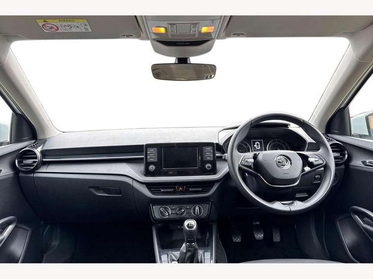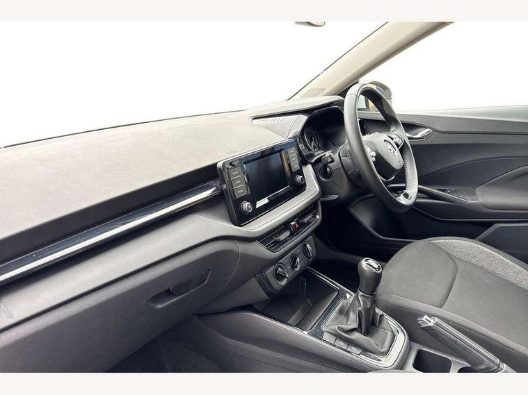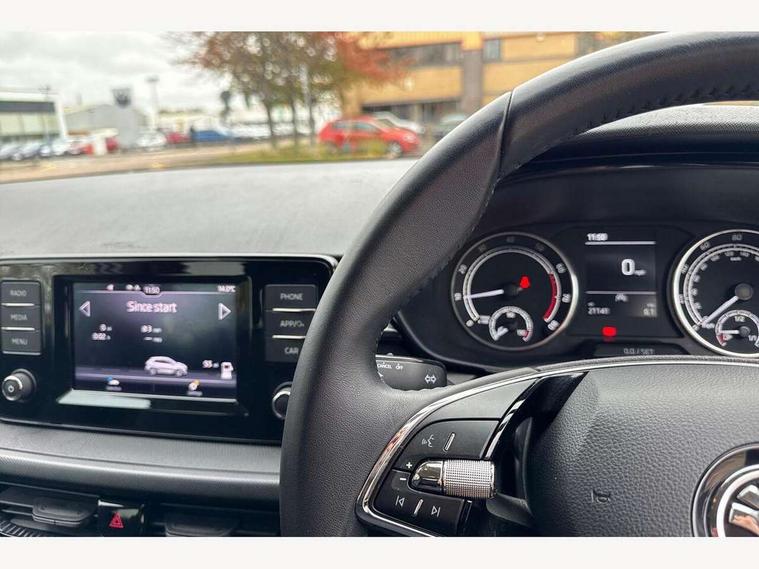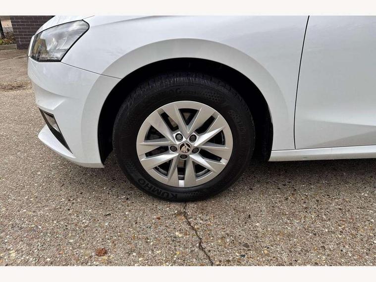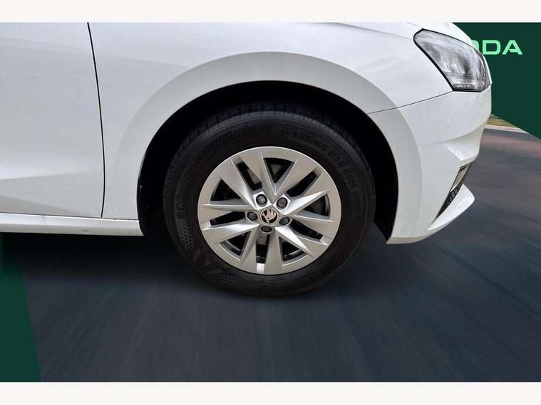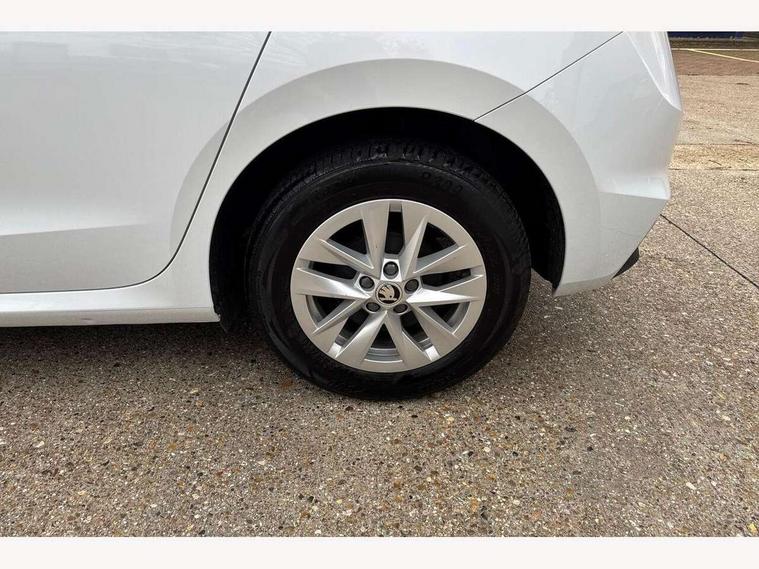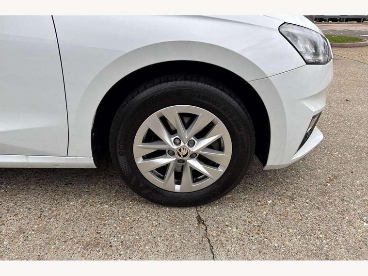 Bluetooth connection, Driver alert system - DAS, Electromechanical power steering, Exterior temperature gauge, Lane assist including road edge detection, Multifunction trip computer in black and white, Service interval indicator, Speed limiter, 2x USB-C in the front (for data transmission and charging), 4 speakers in front, Auxiliary socket for external MP3 player, DAB digital radio reception, Radio Swing with 6.5" colour display, Basic LED Headlights, Basic rear lights, Body colour door mirrors, Body coloured bumpers, Dimming rear view mirror with black frame, Door mirror integrated indicators, Electrically adjustable and heated door mirrors, Electrically adjustable front windows with function auto up/down, Front fog lights, Front window wiper intermittent control, Headlight range control - Automatic, Ice scraper in fuel cap, LED daytime running lights with coming and leaving home feature, Mechanical adjustable rear windows, Rain sensor, Rear LED fog light, Rear side wing doors, Rear window wiper with washing nozzles, Roof mounted spoiler, SKODA tailgate lettering in chrome, Third brake light, 2 reading lights in front and 2 reading lights in rear, 2 spoke leather multifunction steering wheel, 3 rear headrests, Backrest split and folding, Central console with fixed cup holder and storage box, Chrome handbrake release button, Fabric upholstery, Gearshift knob/handle in leather, Grain satin black interior door handles, Hand brake lever handle in leather, Height adjustable front headrests, Height adjustable front seats, Height adjustable steering wheel, ISOFIX and TopTether anchorage points to the outer rear seats, ISOFIX and TopTether on the front passenger seat, Luggage compartment lighting, Manual air conditioning, Manually adjustable lumbar support in front seats, Pollen filter, Rear seat bench unsplit, Single front passenger seat, Storm grey headlining, Sun visors with mirror and airbag label on passenger side, Ticket holder, 3-point height adjustable front seats belts with pretensioner and force limiter, Automatic warning lights in case of crash, Driver and passengers airbag with switch off function, e-Call+, ESC including ABS, MSR, ASR, EDS, HBA and XDS, Front and rear seat belt warning, FRONT ASSIST (AEB City and AEB Inter Urban), Front side airbags, Head airbags, One tone horn, Pedestrian protection, Three rear 3-points safety seat belts with pretensioner and force limiter including stop function for outer rear seat belts, Tyre pressure monitoring system, Anti-theft alarm system including immobiliser, interior monitoring, backup horn, and towing protection, Central locking with radio remote control, interior controls, SAFE function and 2 foldable keys, Black painted air vents, Glossy black decorative trim, Grain satin black central console cover, Grain satin black lower decorative trim, Satin black door and side trim panel in front, Anti-theft wheel bolts protection, Super-low rolling resistance tyres,