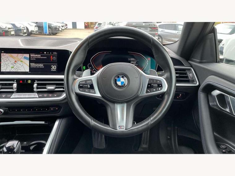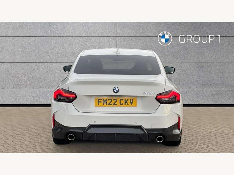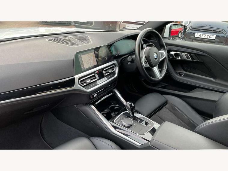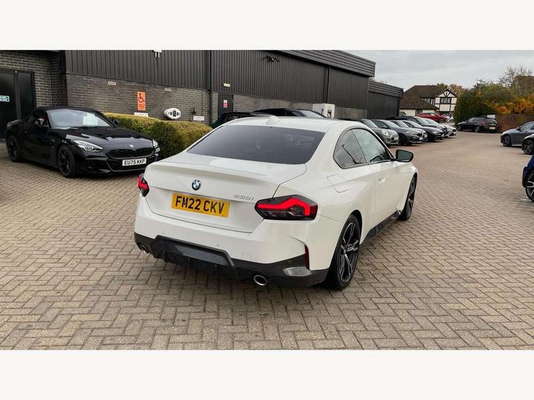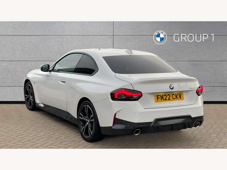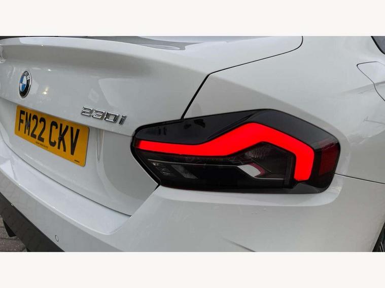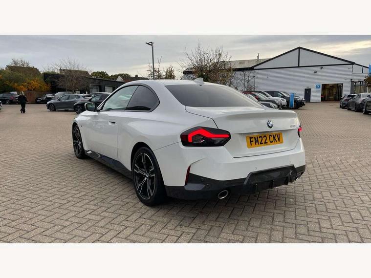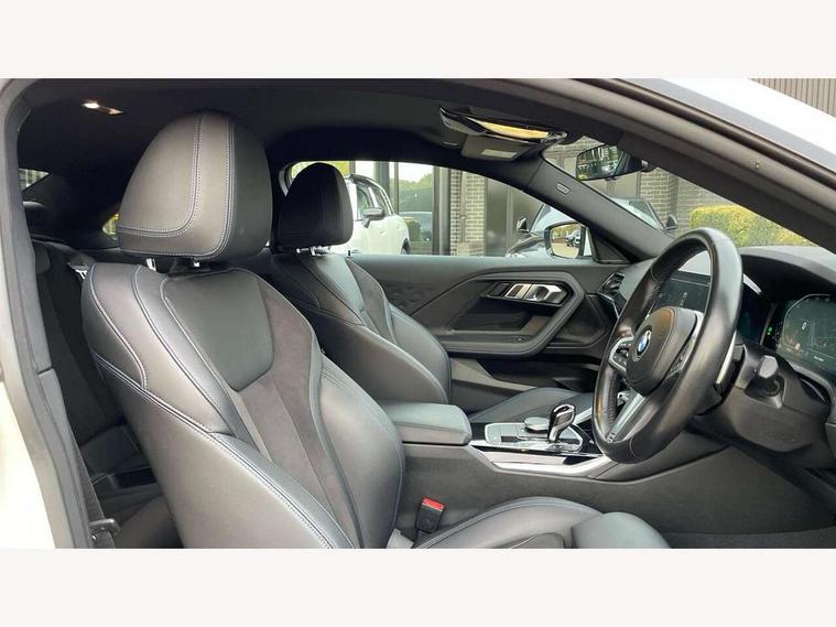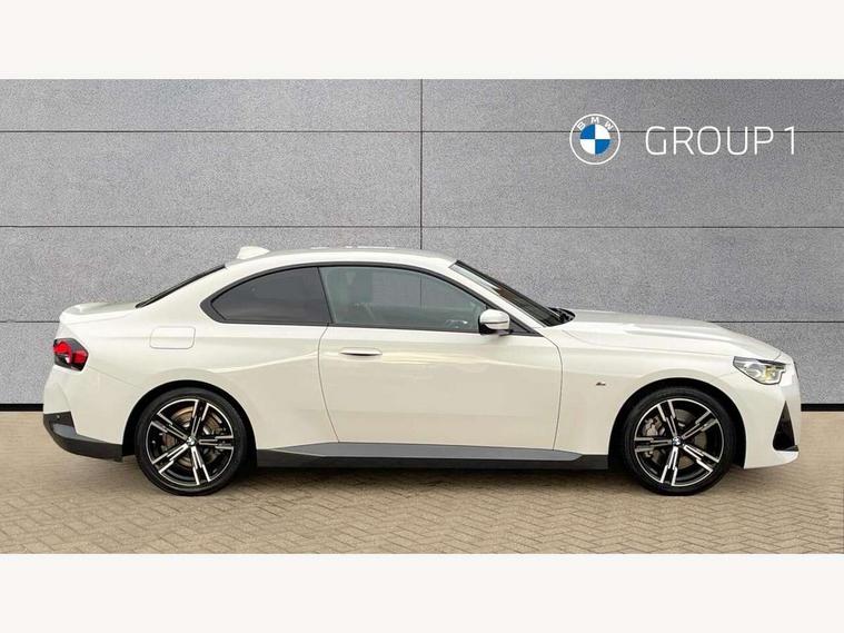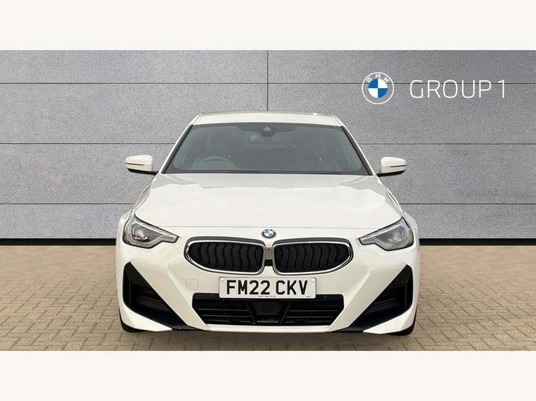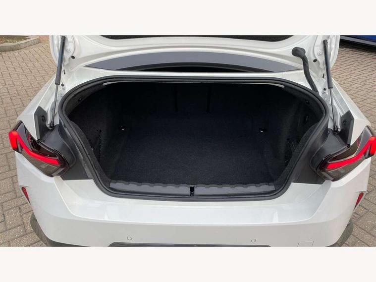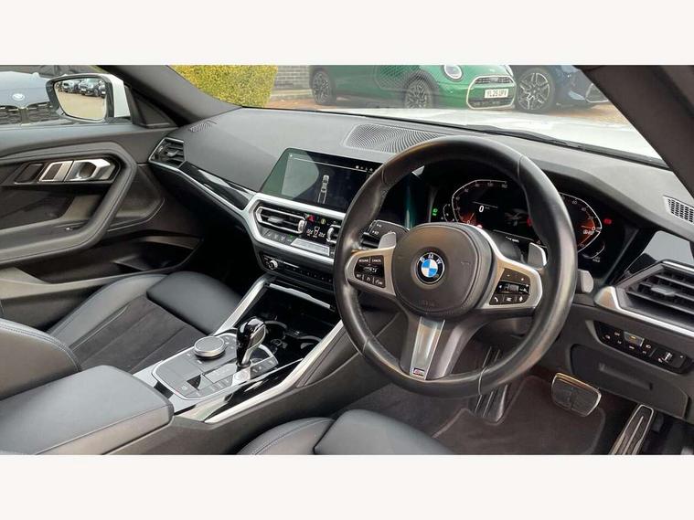 Attentiveness assist, Auto start-stop, Bluetooth, BMW ConnectedDrive online services, BMW Teleservices, Check Control warning system for monitoring of lights and door/luggage compartment open warning, Direct selection buttons, Drive off assistant, Eco pro mode, Electric power steering, Front/rear Parking distance control, iDrive controller with turn and press function, Integrated owners handbook, Intelligent functions, Live cockpit plus with nav function 12.3" instrument cluster and 14.9" centre display, Oil sensor for level and grade, Optimum shift indicator, Personal Profile, Touch operation on control display, Variable sport steering, Widescreen multi-media display, Aluminium lightweight construction, Balancer shaft, BMW TwinPower Turbo four-cylinder petrol engine, Double VANOS, Drive performance control with ECO PRO comfort + sport mode, Electronic differential lock, High precision injection, M sport suspension, Petrol Particulate Filter, Sport automatic steptronic transmission with gearshift paddles, manual gearshift time display, launch control, coasting idle ECO PRO/COMFORT modes, Twin scroll turbocharger with Valvetronic, DAB tuner, Acoustic windscreen wipers for reduced driving noise, Adaptive LED Headlights, Automatic windscreen wipers and automatic headlight, Automatically dimming rear view mirror, Body colour door handles flush with door surface, Body colour door mirrors, Body colour front and rear bumpers, Daytime running lights, Electric windows - front and rear, with open/close fingertip control and trap release, Exhaust tailpipes x2 - 90mm in left and right, Fading support, Front and rear bumper system with replaceable deformation elements, Front door sill finishers in black plastic with BMW designation, Front windscreen wipers with integrated washer jets, Green tinted heat protection glazing, High beam assistant, High gloss shadowline exterior trim in mirror triangle cover, mirror cover panel, mirror bezel and window border, High level third brake light, Indicators integrated int mirror housing, LED registration plate light, LED technology rear tail lights, brake lights and turn indicators, Lightweight engineering, Model designation on right side of tailgate, One piece kidney grille with hight gloss chrome surround, Rear boot, Rear fog lights, Reversing light in rear light cluster, Shark fin antenna, Single part LED rear lights with smoked glass components, Trailer stabilisation logic, Visible VIN plate, 12V power socket in front centre console with blanking plug, 2 cupholders in front centre console, 3 zone automatic air conditioning, Ambient lighting, Compartment in front of cupholder, Conditioned based service, Driver seat backrest width adjustment, Front and rear side armrests integrated into door trim, Front armrest, Front door pockets, Front head restraints, Front sport seats, Heated front seats, Illuminated glove compartment with separate small compartment, M headliner Anthracite, M sport leather steering wheel, Manually adjustment steering wheel column, Rear seat backrest with manual 40:20:40 split folding, Rear seat centre foldable armrest with integrated cup holder, Single front passenger seat, Storage compartment between rear seats, Storage tray and compartment with cover in centre console, Sun visors with vanity mirrors and insert tab, Through loading system with 40/20/40 split folding 2 rear seat in 2nd row, Two folding rear seat headrests, Velour floor mats, Additional storage compartment pack without USB - 2 Series Coupe, Connected pack professional - 2 Series Coupe, Interior and exterior mirror pack - 2 Series Coupe, M Sport exterior styling aerodynamics pack - 2 Series Coupe, 2 tone horn, Anti lock braking system (ABS) with cornering brake control, Automatic Stability Control (ASC), BMW emergency call, Brake drying, Child seat ISOFIX attachment for the two outer rear seats, Crash sensor activating of airbags, Unlocking doors, hazard warning lights, interior light, safety battery terminal, Deactivation of fuel pump in the event of a crash, Driver and front passenger airbags, Driver and front passenger side airbags, integrated in the door side seat backrest bolsters for all seat variants, Dynamic brake control, Dynamic stability control + (DSC+), Dynamic Traction Control - DTC, Electrically operated hand brake including automatic hold function and automatic release when driving off, Front and rear disc brakes, Front passenger airbag deactivation, Head airbags for all 4 outer seats, Manual deactivation of front passenger airbag, Seat belt security check for driver and front passenger, Seatbelt warning, Side impact protection, Three point seat belts on 4 seats including front belt stopper, pyrotechnic belt tensioners and belt force limiters, Tyre pressure sensor, Warning triangle and first aid kit, Alarm system (Thatcham 1) with remote control and electronic engine immobiliser, Central locking switch for all doors, fuel filler cap and luggage compartment, Deadlocking function system to all doors, Drive away locking system on all doors and luggage compartment, Locking wheel bolts, Start/Stop button (illuminated) in centre console with keyless engine start and Auto Start-Stop deactivation button, Two remote control key with integrated key - one button for open and close doors/fuel flap/tailgate and separate button for unlock luggage compartment, BMW mobility tyre sealing system, Electrically powered 12V compressor, Reduced rolling resistance tyres,