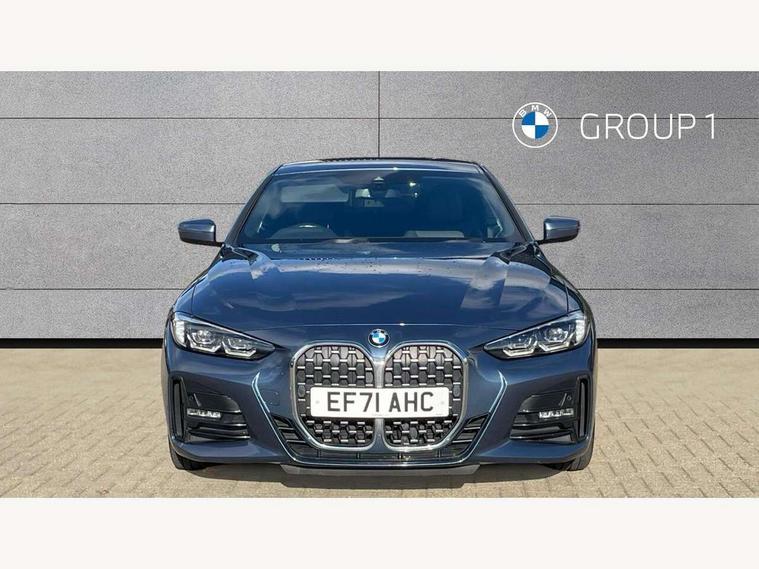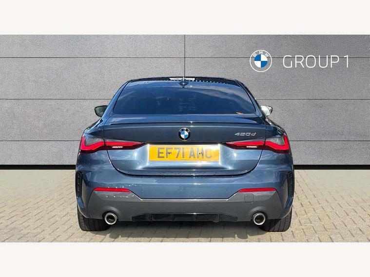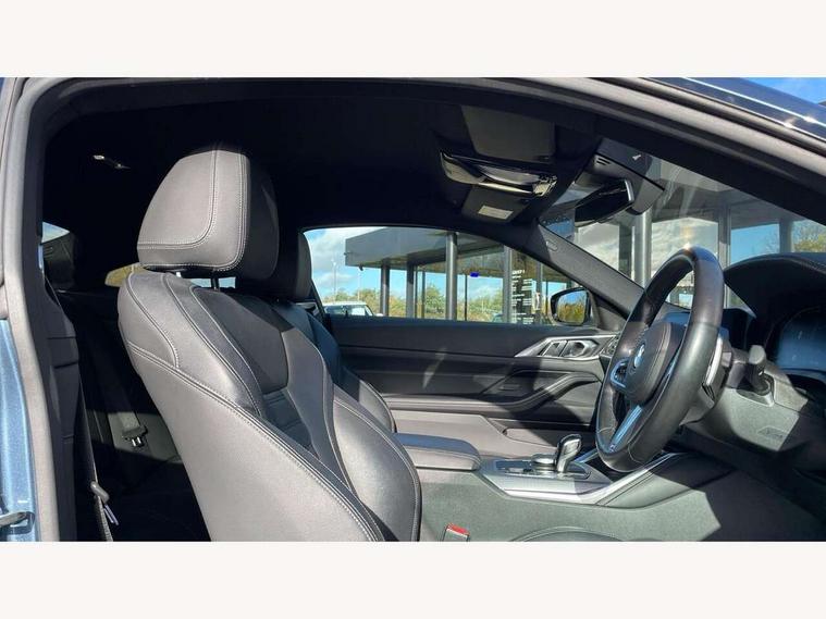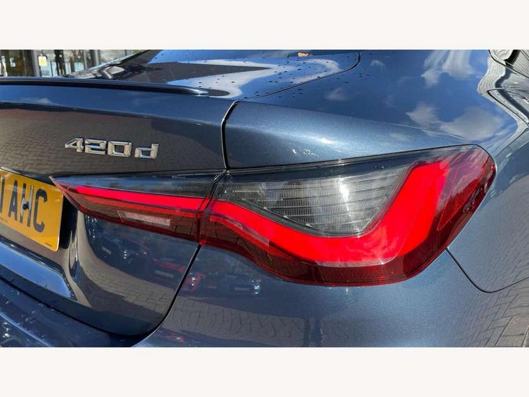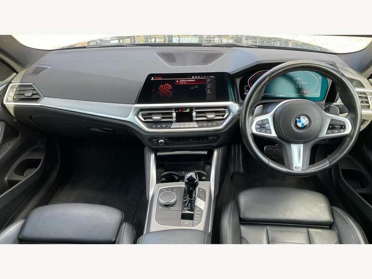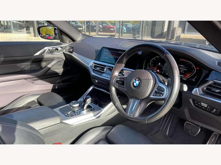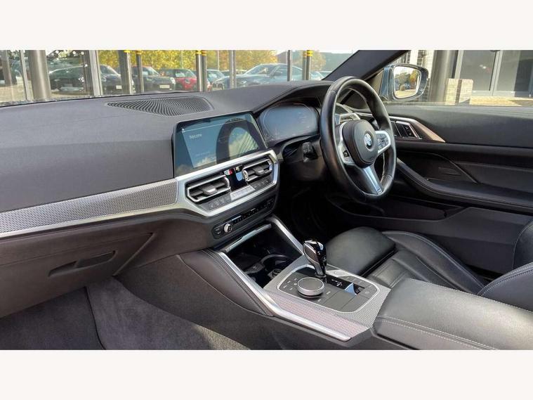 Active guard plus, Attentiveness assist, Auto start-stop, Bluetooth hands free facility with USB audio interface with audio streaming, BMW ConnectedDrive online services, BMW iDrive controller on centre console, BMW Live Cockpit Professional Nav with 12.3" instrument display + 10.25" display, Intelligent Voice Assist, BMW OS 7, HDD, 2USB, 4G LTE connect, BMW service history, BMW Teleservices, Brake pad wear indicator in front and rear, Check Control warning system for monitoring of lights and door/luggage compartment open warning, Condition based service, Cruise control with brake assist, Electric power steering with Servotronic steering optimised at all speed ranges, Gearshift time display in manual mode, Instrument cluster with speedometer with mph readout, tachometer, fuel gauge and oil temperature gauge, Integrated owners handbook, Oil sensor for level and grade, warning by check control system, On board computer - average speed, fuel consumption, outside temp display with acoustic warning, clock/date, service interval, odometer/trip meter, Optimum shift indicator, Reverse Assistant functionality for BMW Live Cockpit Professional Nav, Touch control functionality for BMW Live Cockpit Professional Nav, Variable sport steering, 48V Mild hybrid technology, 8 speed automatic steptronic transmission with gearshift paddles, Balanced 50/50 weight distribution, Diesel particulate filter, Drive performance control - ECO PRO, comfort and sport modes, Incorrect fuelling protection, Low centre of gravity, M sport suspension, Stroke dependent dampers, DAB tuner, Electronic service booklet, 3rd brake light, Acoustic glazing, Automatic headlight beam throw control with load dependent regulating reaction, dynamic compensation of braking dive and acceleration squat, Automatic windscreen wipers and automatic headlight, Automatically dimming electrochromatic rear view mirror, BMW emblem on engine compartment lid and tailgate, BMW kidney grille with mesh grille front side of the nuggets in matt aluminium and frame in chrome high gloss, Body colour fuel filler flap, Body colour M sport rear spoiler, Body colour roof fin, Brushed aluminium inserts in the front door sill finishers with BMW designation, Daytime running lights, Dynamic brake lights, Electric windows - front and rear, with open/close fingertip control, anti trap facility and comfort closing function all round, Exhaust tailpipe - split left and right, Exterior mirrors - electrically folding with anti-dazzle, Fading support, Front and rear bumper system, Front apron plastic in body colour, Green tinted heat protection glazing, High gloss shadow line exterior trim, Illuminated bow type door handles in body colour drivers side with door lock, Interior rear view electrochromatic mirror with automatic anti dazzle function, LED front fog lights, Licence plate panel integrated into front bumper and tailgate, Lightweight engineering, M designation on front side panels, left and right, Model designation on right side of tailgate, One piece front bumper cover including towing eye cover in body colour, Preparation for high beam assistant, Rear boot, Side frame decorative moulding black matt, Two part LED tailights in L-shape with components in smoked glass, brake light, LED turn indicator and rear fog light, Visible VIN plate, Welcome lights in interior and door handle area, Widened track and increased camber values for max transverse dynamics, agility and steering precision, Window recess cover black high gloss, Windscreen wipers with integrated washing jets, 12V power socket in front centre console, 2 front cupholder in centre console with clamping elements and matt black inlay, 2 Rear seat headrests, 2 seat bench in second row, 3 spoke M sport leather multifunction steering wheel, 3 zone automatic air conditioning, 4 pieces lashing eyelets in luggage compartment, 40:20:40 split folding rear seat and rear centre armrest with two cupholders, Ambient lighting with welcome carpet light, Anthracite headlining, Armrest integrated in front and rear door trim + front centre console armrest, Four grab handles integrated in roof lining, Front and rear door exit lighting (left / right), Front and rear door pockets, Front and rear footwell lights, Front and rear reading lights, Front headrests, Front passenger seat, Front seat backrest width adjustment, Front sport seats, Heated driver and front passenger seats, Height adjustable mechanically and infinitely variable steering column, Illuminated armrest storage compartment, Illuminated glove compartment with separate small compartment, Luggage compartment light, Make-up mirror lights, Storage compartment in rear centre console, Sunvisors with vanity mirrors and ticket pocket, Toolkit located in luggage compartment, Velour front floor mats, Vernasca leather upholstery, Connected professional package - 4 Series, M sport exterior styling pack - 4 Series, Park assist pack - 4 Series, 2 x 3-point rear seatbelts, Battery safety cut-off, BMW emergency call, Brake energy regeneration, Braking pre-tensioning, Child seat ISOFIX attachment for the two outer rear seats, Coasting in idle in ECO PRO mode, Cornering brake control (CBC), Crash sensor activating of airbags, Unlocking doors, hazard warning lights, interior light, safety battery terminal, Driver and front passenger side airbags, integrated in the door side seat backrest bolsters for all seat variants, Driver/Front Passenger airbags, Dry braking, Dynamic brake control, Dynamic stability control + (DSC+) - Anti-lock Braking System (ABS) with brake assist and cornering brake control + Automatic Stability Control (ASC), Dynamic Traction Control - DTC, Electric parking brake including automatic hold function and automatic release of the parking brake when driving off, Electronic differential lock control (EDLC), Front and rear ventilated brake disc, Front passenger manual airbag deactivation, Head airbags for all 4 outer seats, Hill start assistant, Seat belt security che