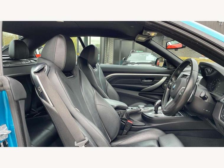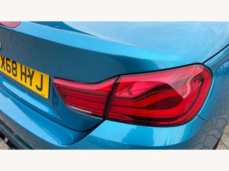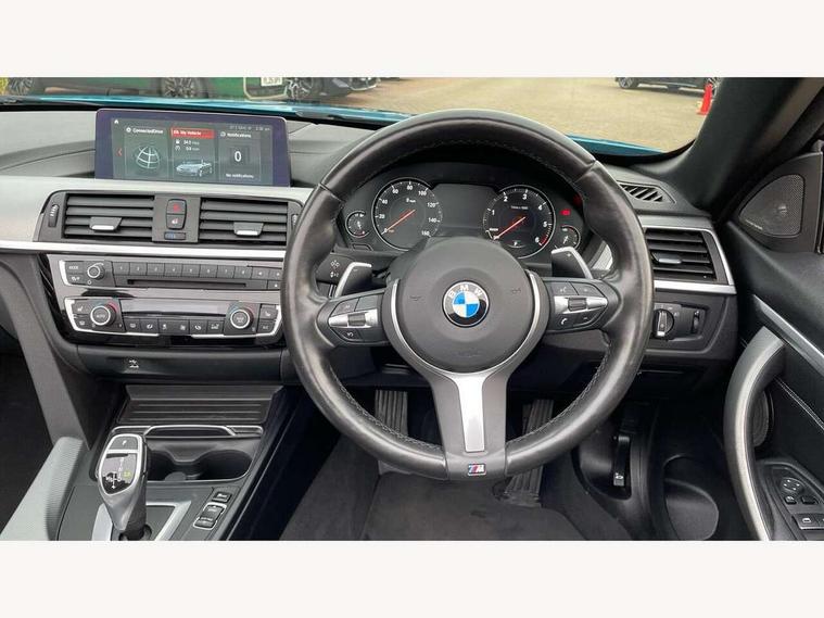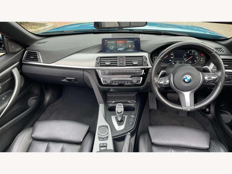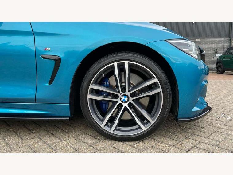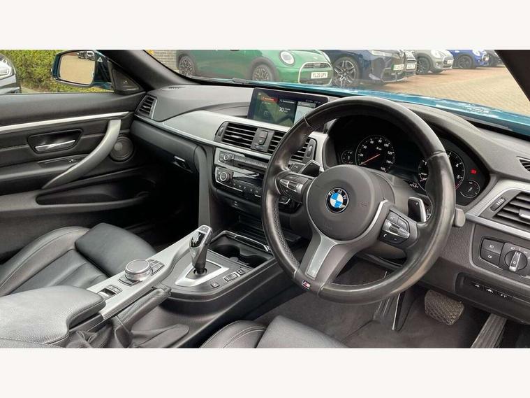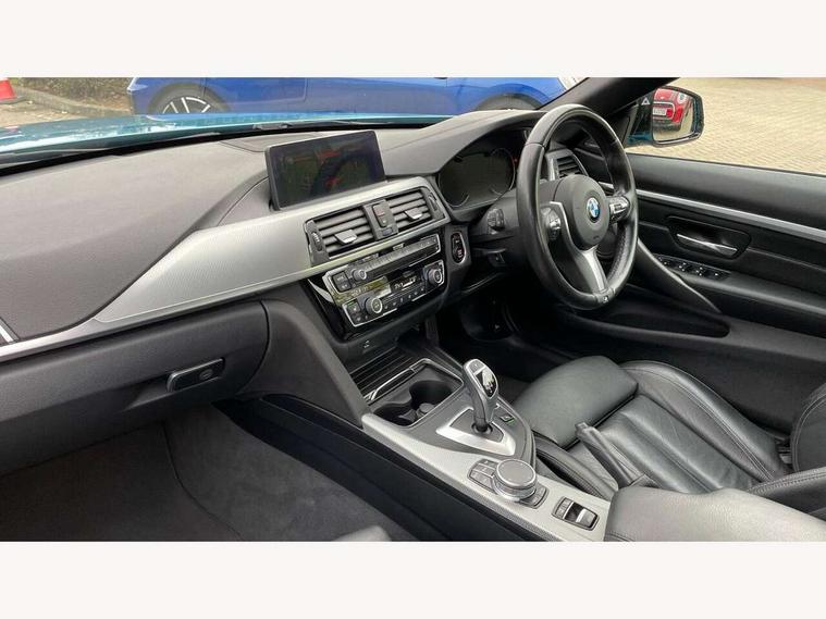 Auto start-stop, BMW Online services, BMW remote services, BMW Teleservices, Boot lid lock with soft close function, Brake pad wear indicator warning light, Check Control warning system for monitoring of lights and door/luggage compartment open warning, Control display - 6.5" colour display screen, Front/rear park distance control (PDC), iDrive Controller with 8 favourite buttons, Instrument cluster with speedometer with mph readout, tachometer, fuel gauge and oil temperature gauge, Lights on warning by audio warning signal when ignition is switched off, M Sport instrument cluster, On board computer - average speed, fuel consumption, outside temp display with acoustic warning, clock/date, service interval, odometer/trip meter, Optimum shift indicator, Personal Profile - automatic lock when driving away selectable, Run flat indicator, Aluminium front suspension, Diesel particulate filter, Drive performance control with ECO PRO comfort + sport mode, Electronic differential lock, Five link rear suspension, Incorrect fuelling protection, Sport automatic transmission with steering-wheel mounted gearshift paddles and launch control, DAB tuner, Auto dimming rear view mirror, Body colour door handles, Body colour front bumper, Body colour mirror caps, Body colour roof mouldings, Chrome kidney grille with extra wide black, high gloss black vertical slats, Direction indicator, side repeaters, integrated in exterior mirrors, Door sill finishers with M designation, Dual exhaust tailpipes in left with chrome finisher, Dynamic brake lights, Electric front windows with fingertip open/close + anti-trap facility, Follow me home headlights, Front air inlet with high gloss black finish, Front and rear bumper system, Green tinted heat protection glazing, Heated windscreen washer jets, Heated, electrically adjustable exterior mirror aspheric on driver side, convex on passenger side, High gloss black rear bumper insert, High gloss shadow line, High level third brake light, LED daytime running lights, LED direction indicator lenses, LED eyebrow light, LED front fog lights, LED tail lights with 3D L-shaped LED light design, Lightweight engineering, M aerodynamic bodystyling, M designation side badges, Rain sensor including auto headlights activation, Retractable hard top, Shark fin antenna, Two speed adjustable intervals windscreen wipers, Visible VIN plate, Welcome lighting, Windscreen with grey shadeband, 12V sockets in front centre console and passenger footwell, 2 Rear seat headrests, 3 spoke leather M sport multifunction sports steering wheel, Air conditioning and radio control panel in high gloss black, Automatic air conditioning with two zone control, Chrome centre console panel highlight, Driver and front passenger seat heating, Folding front centre armrest with storage compartment, Folding storage compartment with glasses holder + coin tray, Front and rear side armrests integrated into door trim, Front door storage with bottle holder, Front head restraints, Front sports seats with electric side bolster adjustment, Glove compartment, Interior lighting, front centre over interior mirror and rear centre automatic interior light activation when door is opened, ISOFIX child seat preparation+airbag deactivation, Load lashing eyes in luggage compartment, Loading aid luggage compartment when hard top is retracted, Reach + rake adjustable steering column, Rear centre armrest, Rear coded belt buckles, Storage compartment behind rear seat, Storage compartment in centre rear seat base, Sunvisors with vanity mirrors and ticket pocket, Toolkit located in luggage compartment, Two front cup holders with a sliding lid, Velour floor mats, Extended lighting package - 4 Series, Media pack - Professional - 4 Series M Sport, Airbag - Front driver and passenger, front and rear head, front side, curtain head protection, manual deactivation of front passenger airbag possible, Anti lock braking system (ABS) with brake assist, Automatic Stability Control (ASC), Battery safety cut-off, BMW emergency call, Brake drying, Brake energy regeneration, Brake pretensioning, Cornering brake control (CBC), Crash sensor activating central locking release, hazard warning lights, Dynamic brake control, Dynamic stability control + (DSC+), Dynamic Traction Control - DTC, Front and rear ventilated brake disc, Front seatbelt force limiters, Hill start assistant, Pyrotechnically pre-tensioned front seatbelts, Roll over protection, Seat belt security check for driver, Side impact protection, Twin horns, Tyre pressure monitoring with three level warning strategy, Variable torque distribution, Warning triangle and first aid kit, Central locking switch for all doors, fuel filler cap and luggage compartment, Electronic engine immobiliser, Remote control integrated key with blue inset, Start/stop button with Comfort Go keyless engine start and auto Start/stop deactivation button, Thatcham category 1 alarm, Reduced rolling resistance tyres, Run flat tyres,