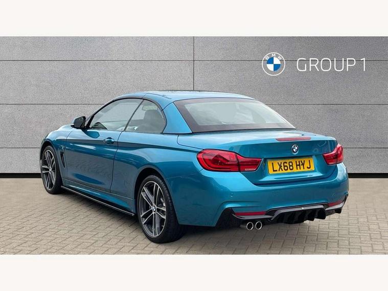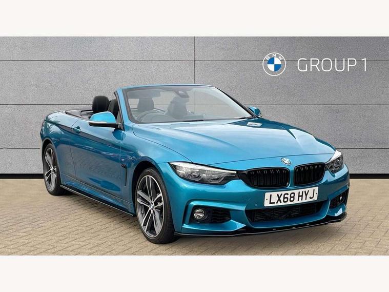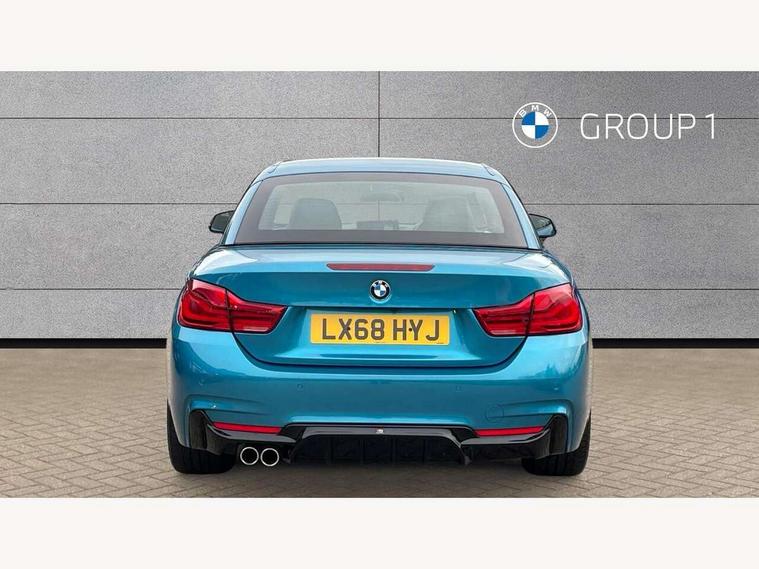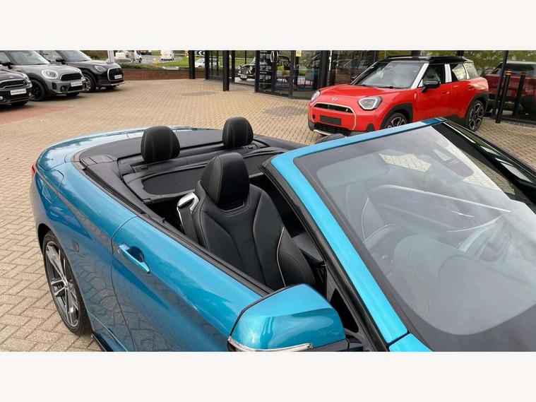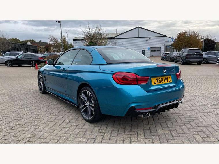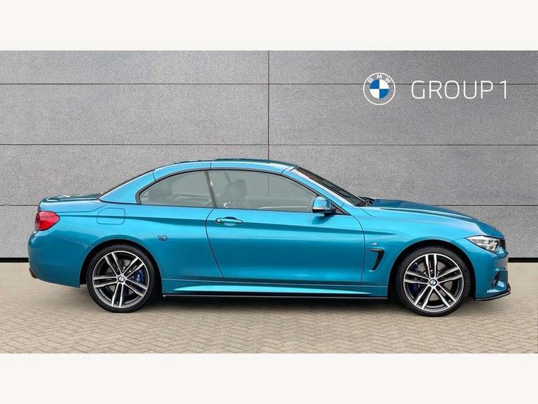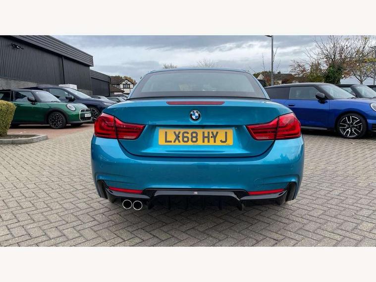 Auto start-stop, BMW Online services, BMW remote services, BMW Teleservices, Boot lid lock with soft close function, Brake pad wear indicator warning light, Check Control warning system for monitoring of lights and door/luggage compartment open warning, Control display - 6.5" colour display screen, Front/rear park distance control (PDC), iDrive Controller with 8 favourite buttons, Instrument cluster with speedometer with mph readout, tachometer, fuel gauge and oil temperature gauge, Lights on warning by audio warning signal when ignition is switched off, M Sport instrument cluster, On board computer - average speed, fuel consumption, outside temp display with acoustic warning, clock/date, service interval, odometer/trip meter, Optimum shift indicator, Personal Profile - automatic lock when driving away selectable, Run flat indicator, Aluminium front suspension, Diesel particulate filter, Drive performance control with ECO PRO comfort + sport mode, Electronic differential lock, Five link rear suspension, Incorrect fuelling protection, Sport automatic transmission with steering-wheel mounted gearshift paddles and launch control, DAB tuner, Auto dimming rear view mirror, Body colour door handles, Body colour front bumper, Body colour mirror caps, Body colour roof mouldings, Chrome kidney grille with extra wide black, high gloss black vertical slats, Direction indicator, side repeaters, integrated in exterior mirrors, Door sill finishers with M designation, Dual exhaust tailpipes in left with chrome finisher, Dynamic brake lights, Electric front windows with fingertip open/close + anti-trap facility, Follow me home headlights, Front air inlet with high gloss black finish, Front and rear bumper system, Green tinted heat protection glazing, Heated windscreen washer jets, Heated, electrically adjustable exterior mirror aspheric on driver side, convex on passenger side, High gloss black rear bumper insert, High gloss shadow line, High level third brake light, LED daytime running lights, LED direction indicator lenses, LED eyebrow light, LED front fog lights, LED tail lights with 3D L-shaped LED light design, Lightweight engineering, M aerodynamic bodystyling, M designation side badges, Rain sensor including auto headlights activation, Retractable hard top, Shark fin antenna, Two speed adjustable intervals windscreen wipers, Visible VIN plate, Welcome lighting, Windscreen with grey shadeband, 12V sockets in front centre console and passenger footwell, 2 Rear seat headrests, 3 spoke leather M sport multifunction sports steering wheel, Air conditioning and radio control panel in high gloss black, Automatic air conditioning with two zone control, Chrome centre console panel highlight, Driver and front passenger seat heating, Folding front centre armrest with storage compartment, Folding storage compartment with glasses holder + coin tray, Front and rear side armrests integrated into door trim, Front door storage with bottle holder, Front head restraints, Front sports seats with electric side bolster adjustment, Glove compartment, Interior lighting, front centre over interior mirror and rear centre automatic interior light activation when door is opened, ISOFIX child seat preparation+airbag deactivation, Load lashing eyes in luggage compartment, Loading aid luggage compartment when hard top is retracted, Reach + rake adjustable steering column, Rear centre armrest, Rear coded belt buckles, Storage compartment behind rear seat, Storage compartment in centre rear seat base, Sunvisors with vanity mirrors and ticket pocket, Toolkit located in luggage compartment, Two front cup holders with a sliding lid, Velour floor mats, Extended lighting package - 4 Series, Media pack - Professional - 4 Series M Sport, Airbag - Front driver and passenger, front and rear head, front side, curtain head protection, manual deactivation of front passenger airbag possible, Anti lock braking system (ABS) with brake assist, Automatic Stability Control (ASC), Battery safety cut-off, BMW emergency call, Brake drying, Brake energy regeneration, Brake pretensioning, Cornering brake control (CBC), Crash sensor activating central locking release, hazard warning lights, Dynamic brake control, Dynamic stability control + (DSC+), Dynamic Traction Control - DTC, Front and rear ventilated brake disc, Front seatbelt force limiters, Hill start assistant, Pyrotechnically pre-tensioned front seatbelts, Roll over protection, Seat belt security check for driver, Side impact protection, Twin horns, Tyre pressure monitoring with three level warning strategy, Variable torque distribution, Warning triangle and first aid kit, Central locking switch for all doors, fuel filler cap and luggage compartment, Electronic engine immobiliser, Remote control integrated key with blue inset, Start/stop button with Comfort Go keyless engine start and auto Start/stop deactivation button, Thatcham category 1 alarm, Reduced rolling resistance tyres, Run flat tyres,