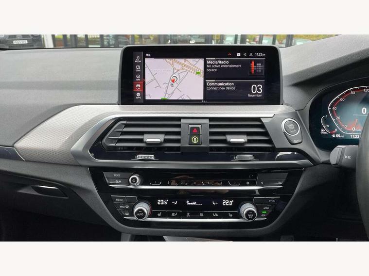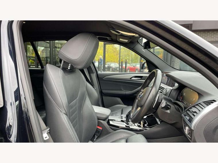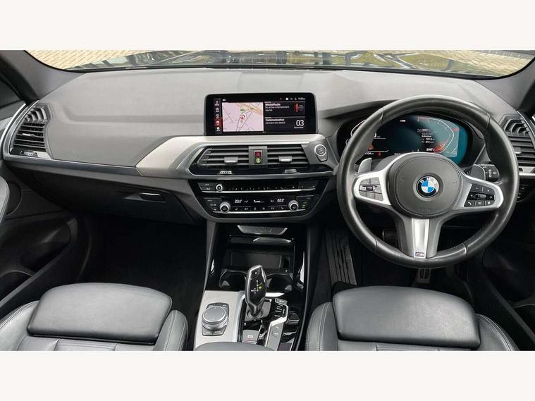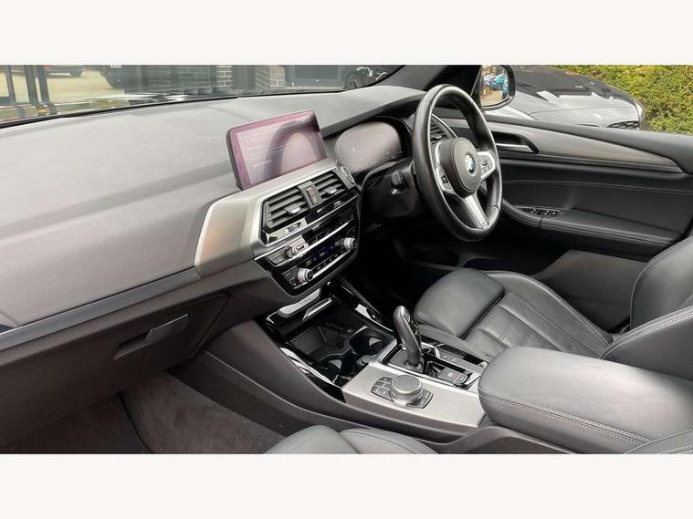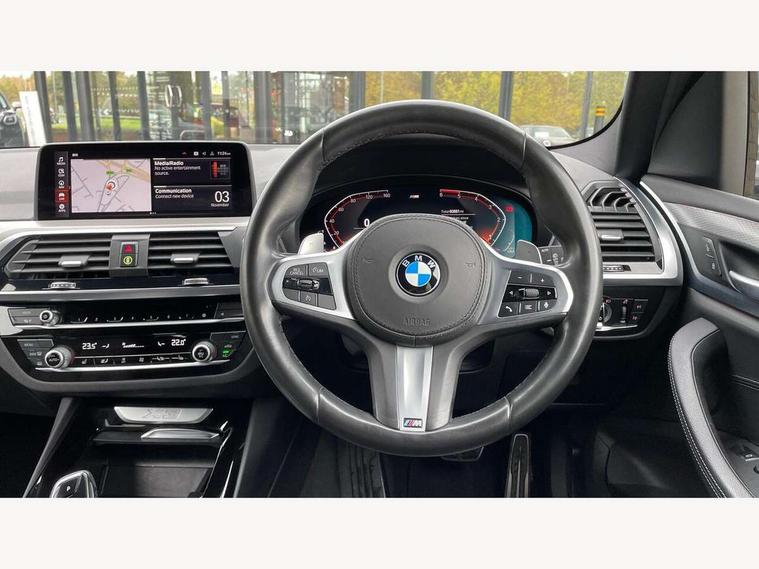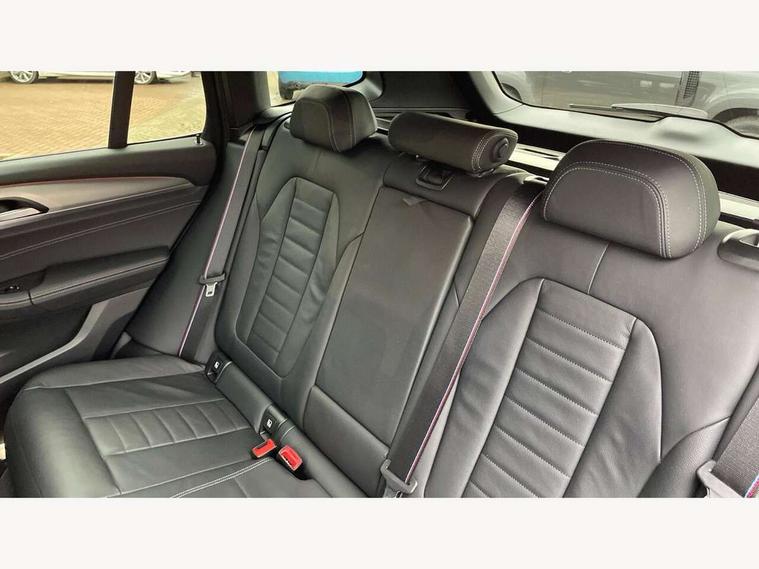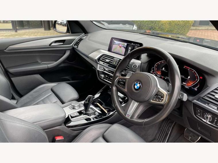 Active Guard incl speed limiting and lane departure functions with auto steering, and front collision warning with brake intervention, Attentiveness assist, Automatic tailgate operation, BMW Live Cockpit Professional sat nav system including 10.25" high resolution display and Intelligent Voice Assistant, BMW Online services, BMW Teleservices, Brake pad wear indicator in front and rear, Check Control warning system for monitoring of lights and door/luggage compartment open warning, Control display - 6.5" colour display screen, Electric Power Steering (EPS) with Servotronic, Front/rear Parking distance control, iDrive Controller with 8 favourite buttons, Lights on warning by audio warning signal when ignition is switched off, Navigation system - BMW Professional multimedia with Hard disc drive (HDD) and 10.25" touch display, Oil sensor for level and grade, warning by check control system, On board computer - average speed+fuel consumption, service interval, clock/date, odometer/trip meter, outside temperature display and ice warning, Optimum shift indicator, Personal Profile - automatic lock when driving away selectable, Real time traffic information, Semi digital instrument cluster, Stop/start system, Automatic transmission with gearshift paddles, Diesel particulate filter, Incorrect fuelling protection, Larger capacity fuel tank, Multi-link rear suspension, Performance Control, Auxiliary socket for external MP3 player, BMW professional radio/CD/MP3, DAB Digital radio, Acoustic glazing, Black finish on B pillars, Body colour door handles, Body colour electric adjust heated aspherical door mirrors, Body colour roof mouldings, Body coloured bumpers, Chrome kidney grille with high gloss black vertical slats, Direction indicator, side repeaters, integrated in exterior mirrors, Dual chrome exhaust, Dynamic brake lights, Exterior mirrors - electrically folding with anti-dazzle, Fingertip control / anti-trap function on electric window, Follow me home headlights, Front and rear bumper system with replaceable deformation elements, Front and rear electric windows, Green tinted heat insulating glass, Heated windscreen washer jets, Height adjustable headlamps, High gloss black door sill finishers, High gloss black shadow line roof rails, High gloss shadowline exterior trim in decorative moulding side frame/recess cover/guide rail/B, C pillars/mirror frame and triangle with mirror base, High level 3rd brake light incorporating LED Technology, Interior rear view electrochromatic mirror with automatic anti dazzle function, LED front fog lights, LED tail lights, Lightweight engineering, M aerodynamic bodystyling, Model designation, Rain sensor including auto headlights activation, Rear wiper, Shark fin antenna, Visible VIN plate, Welcome lighting, Windscreen wipers with adjustable interval, 12V socket in centre console and luggage area, 3 rear headrests, 3 zone automatic air conditioning, 4 lashing points to secure luggage, Ambient lighting, Anthracite headlining, Anthracite Velour floor mats, Driver/passenger sunvisors with ticket holders + illuminated vanity mirrors, Foldable boot floor with storage compartment, Four grab handles integrated in roof lining, Front and rear bottle holders integrated into door trim storage compartments, Front and rear side armrests integrated into door trim, Front centre armrest with storage compartment, Front footwell lights, Front sports seats, Front/rear courtesy lights with soft on/off dimming, Front/rear reading lights, Height adjustable front/rear head restraints, Isofix rear child seat preparation, Leather gear knob, Luggage area underfloor compartment, Luggage compartment lighting, M Sport multifunction leather steering wheel, Parcel shelf removeable and storable under boot floor, Reach and rake adjustable steering column, Rear centre armrest with 2 cupholders, Rear seat centre armrest with two cupholders, Removable / retractable luggage cover, Slope adjustable rear seats, Storage compartment in rear centre console and front/rear door trims, Through loading system with 40/20/40 split folding rear seat, Toolkit located in luggage compartment, Two front cupholders with removable oddments tray/lid, Vernasca leather upholstery, Connected pack professional - X3, ABS/EBD, ADB - Automatic Differential Brake, Automatic Stability Control (ASC), Battery safety cut-off, BMW emergency call, Brake assist, Brake assist function, Brake drying, Brake energy regeneration, Braking pre-tensioning, Child locks on rear doors, Cornering brake control (CBC), Crash Sensor - activation of central locking release, hazard warning light and interior lighting, Deactivation of fuel pump in the event of a crash, Driver and front passenger front and side airbags with passenger deactivation and ITS front and rear head airbags, DSC+, Dynamic brake control, Dynamic Traction Control - DTC, Electromechanical parking brake, Front seat belts warning, Hill descent control, Hill start assist, Seatbelt security check for front seats, Side impact protection, Three point seatbelts to all seats with front and outer rear pyrotechnic belt tensioners and seat belt force limiters, Two tone horn, Tyre pressure monitoring system, Ventilated front and rear disc brakes, Warning triangle and first aid kit, Central locking switch for all doors, fuel filler cap and luggage compartment, Electronic engine immobiliser, Locking wheel nuts, Remote control including two integrated key - one button for open/close all lockable content, windows and separate button for open luggage compartment, Remote control Thatcham category 1 alarm, Start/stop button with Comfort Go keyless engine start and auto Start/stop deactivation button, Low rolling resistance tyres,
