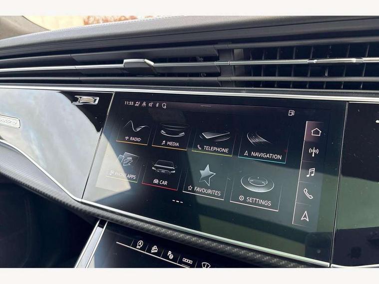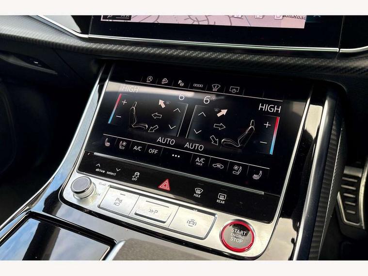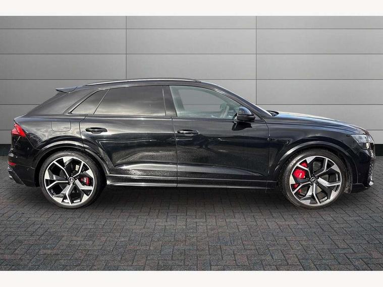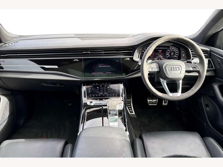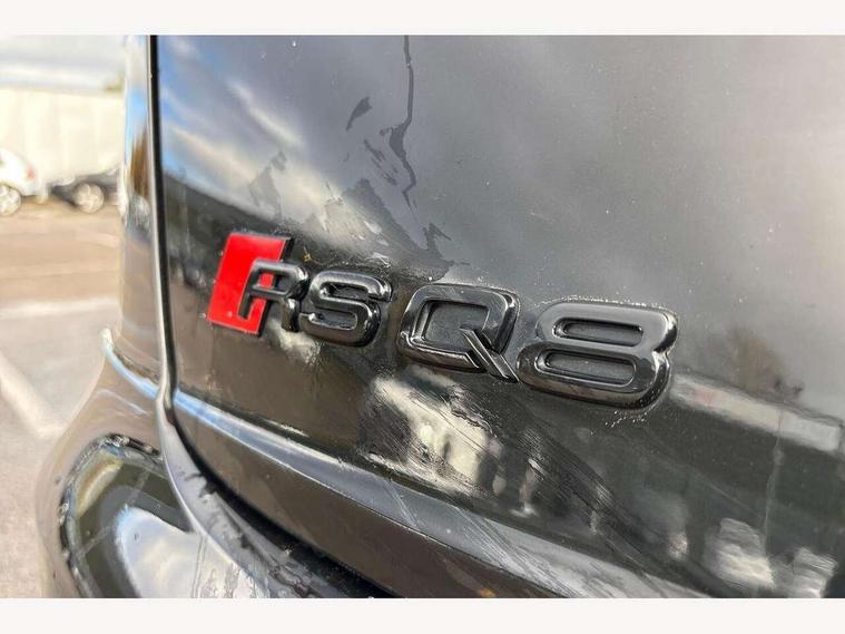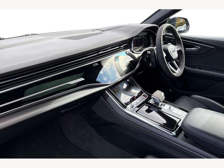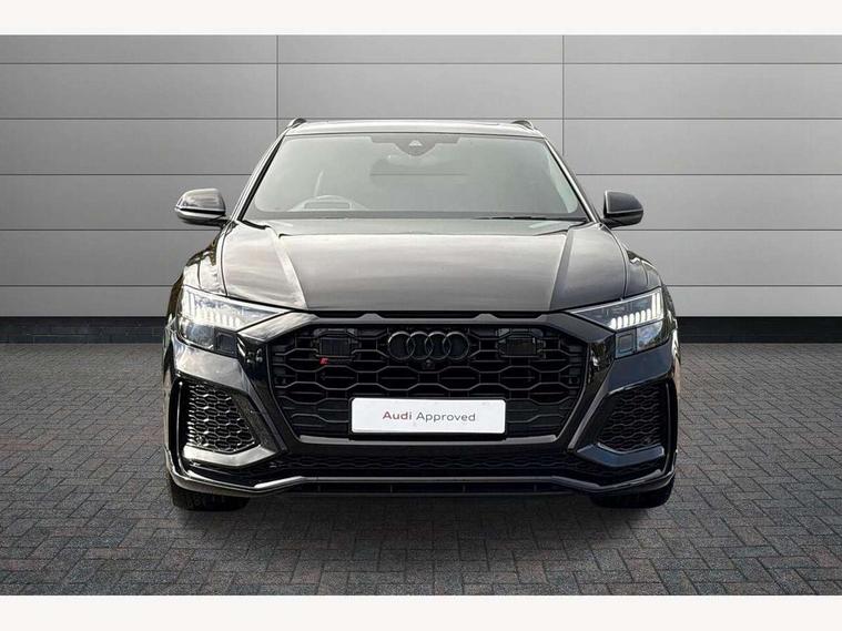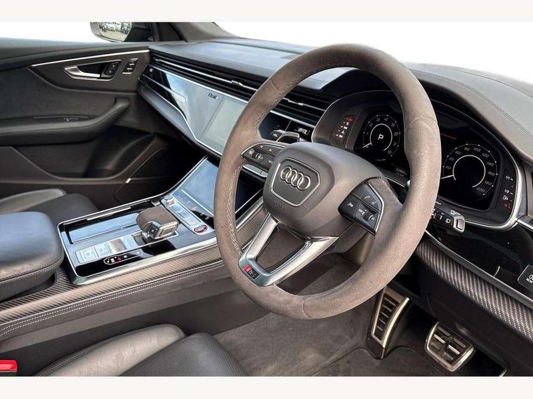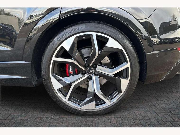 10.1" and 8.6" Dual colour touchscreens, 2 USB ports with charge and data functions in the rear, All wheel steering, Audi connect safety and service (e-call), Audi connect with Amazon Alexa Integration, Audi smartphone interface includes wireless Apple carplay/Android Auto, Audi virtual cockpit - 12.3" high resolution LCD display with fully customisable instrument cluster and RS specific menus and options, Automatic start/stop system, Bluetooth interface, Electro-mechanical PAS, Head up Display, MMI navigation plus with MMI touch, Natural voice recognition, On board computer, Operating buttons in black, glass look with haptic feedback, Power door closure, Power operated tailgate, RS Audi drive select, Service interval indicator, 48V Mild hybrid technology, Electromechanical active roll stabilisation, Quattro all wheel drive with sport differential, RS specific Adaptive air suspension, Audi music interface in rear - 2 USB ports with charger and data functions in rear, Aux-in socket, DAB Digital radio, Adaptive windscreen wipers with integrated washer jets, Audi Beam uses LEDs to project Vorsprung logo, Audi HD Matrix LED headlights in RS specific design with dynamic front and rear indicators, Auto dimming frameless rear view mirror, Electric front+rear windows, Electric panoramic glass sunroof, Electrically folding auto dimming/adjustable/heated door mirrors with memory function, LED side indicators and kerb view function for passenger side, Gloss black finish for exterior Audi rings and RS Q8 logo, Headlight washers, Heat insulating glass in windshield, Illuminated door sill trims with RS logo, LED 3rd brake light, LED signature daytime running lights, Privacy glass - dark tinted rear and rear side windows from B-pillar backwards, Rain and light sensors, Rear side wing doors, Rear wiper, RS badges on front wings, RS coming/leaving home animations in front and rear, RS manhattan grey front spoiler lip and rear diffuser insert, RS manhattan grey grille surround with honeycomb grille insert in black, RS specific bumpers in full body colour paint finish, RS sport exhaust system with black exhaust tips, 3 bench rear seats in 2nd row, 4 zone automatic climate control, 4-way lumbar support for front seats, 40:20:40 split folding rear bench seat, Black dinamica headlining, Comfort front centre armrest, Double sun visor with illuminated vanity mirror on driver and passenger side extendable, Driver and front passenger seat memory function for electrically adjustable front seats, Electric adjustable steering column with memory functionality, Electric sunblind for the rear side windows and manual sunblind for the rear window, Front head restraints, ISOFIX child seat mounting for front passenger seat and 2 outer rear seats with top tether child seat mounting for all 3 rear seats, Luggage compartment sill protection in stainless steel, Massage and ventilation function for front seats, Perforated Valcona leather upholstery + RS front super sports seats + honeycomb pattern with RS embossed logo, Rear headrests, Rear seat bench plus, Single front passenger seat, Stainless steel pedals, Tool kit, Air quality package - RS Q8, Anthracite black styling pack - RS Q8, City assist pack - Q8, Comfort and sound pack - RS SQ8, Multi-coloured extended LED interior lighting pack - RS Q8, RS specific styling pack - RS Q8, Tour pack - Q8, 3 point seatbelts on all seats, Audi pre sense front, Child locks on rear doors, Driver and front passenger, front side and curtain airbags, Electromechanical parking brake, Electronic Stability Control (ESC) including ABS, ASR and EDL, Front passenger airbag deactivation, Hill descent control, Hill hold assist, Predictive pedestrian protection, Seatbelt monitoring, Tyre pressure loss indicator, Warning triangle and first aid kit, Advanced key, Anti theft alarm with tow away protection, Anti-theft wheel bolts and wheel loosening detection, Immobiliser, 23" x 10.5J 5 Y spoke rotor design Audi sport alloy wheels in gloss anthracite black with diamond finish, Tyre repair kit,