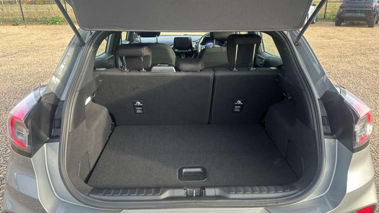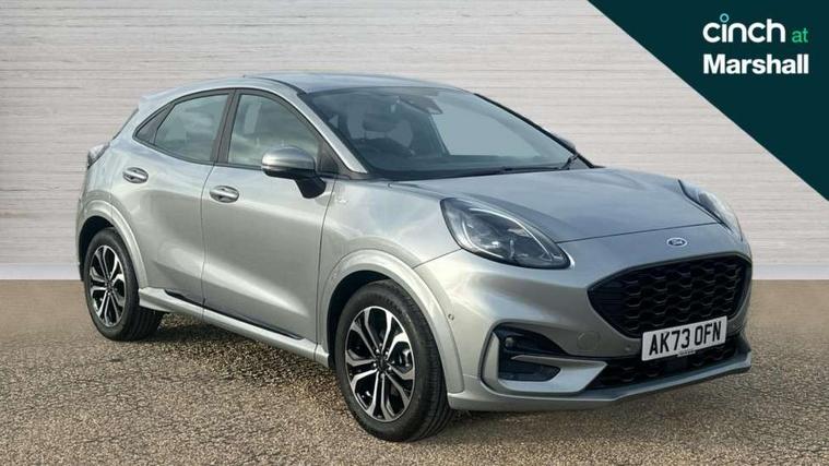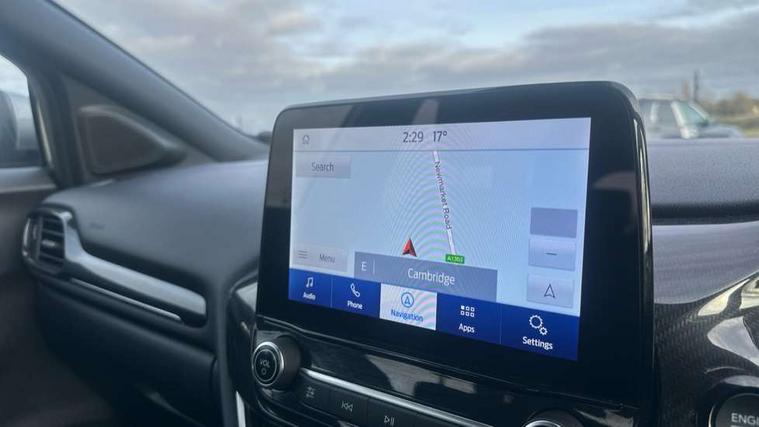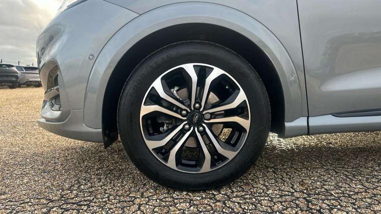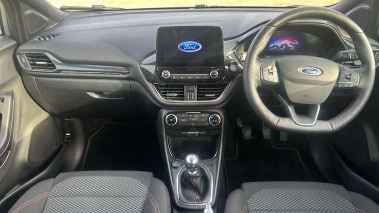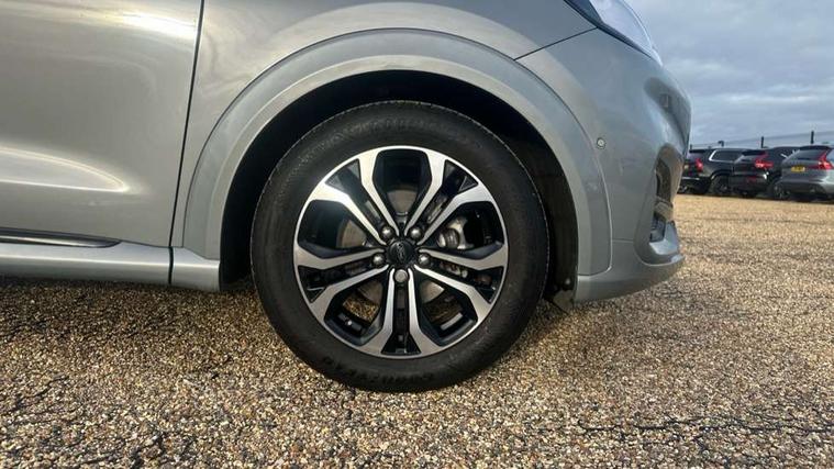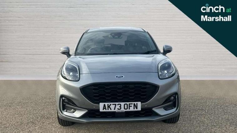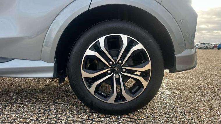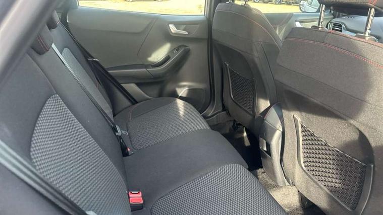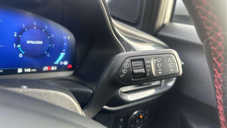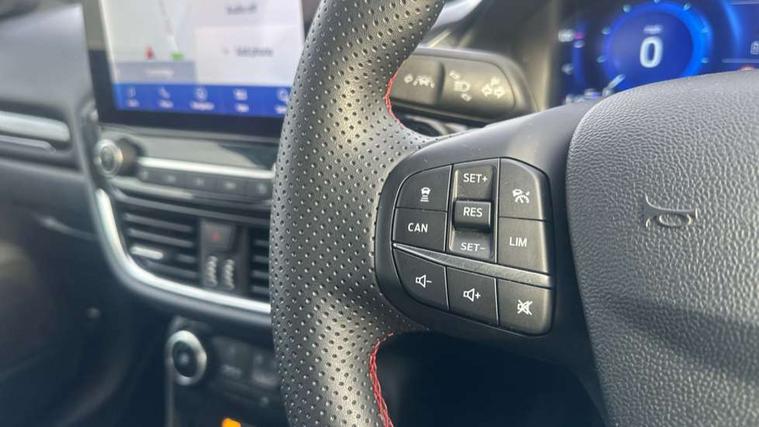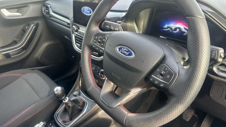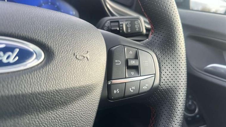 Driver impairment monitor, Emergency call service, Ford easy fuel, Full digital 12.3" instrument cluster, Lane keeping aid with lane departure warning, Power assist steering, Power start button, Rear parking sensor, Selectable drive modes(Normal, sport, Eco, trail, slippery), Speed sign recognition, Sport suspension, Automatic headlights with auto high beam, Automatic rain sensing wipers, LED rear lamps, Power foldable heated door mirrors with puddle lamps, Projector headlamps with LED day time running lights and front fog lamps, Quickclear heated windscreen, Rear side wing doors, Rear wiper, ST-Line body styling kit with unique grille, Third brake light, 3 seat bench in 2nd row, Centre console with armrest and stowage, Ford megabox extended bootspace, Front and rear head restraints, Front floor mats, Manual 2 way passenger seat adjustment, Manual 4 way driver seat adjust with lumbar adjustment, Single front passenger seat, ST- Line cloth trim with red stitching, ST-Line flat bottomed sensico leather steering wheel with leather handbrake and aluminium gear knob, Ford SYNC 3 navigation pack - Puma, 3 rear seatbelts, Child safety lock, Electronic stability control (ESC) and hill start assist, Pedestrian/cyclist detection & post-collision braking, Pre collision assist system, Tyre pressure monitoring system (TPMS), Thatcham alarm,