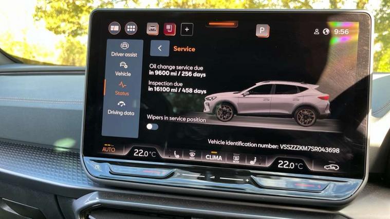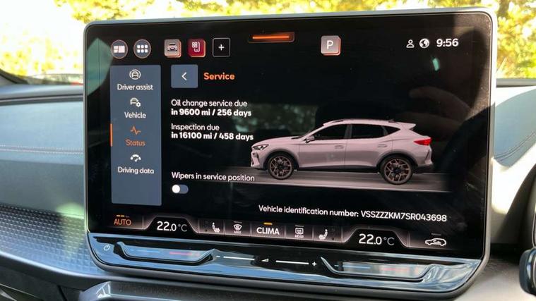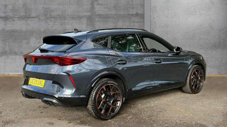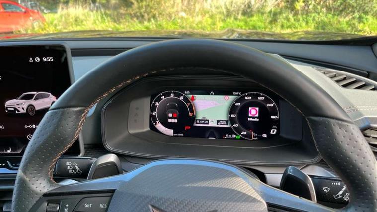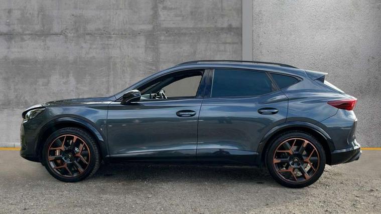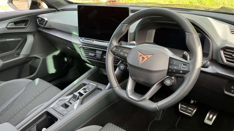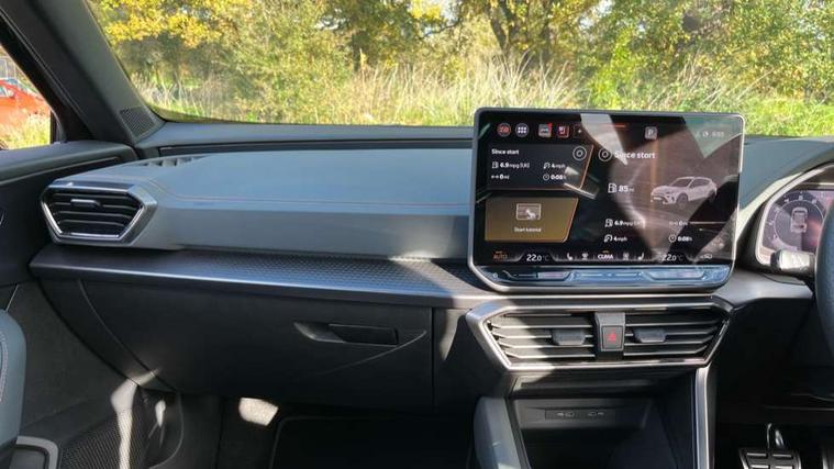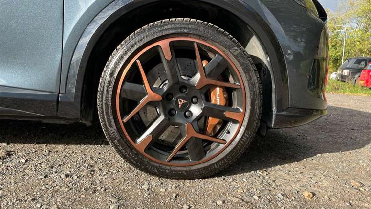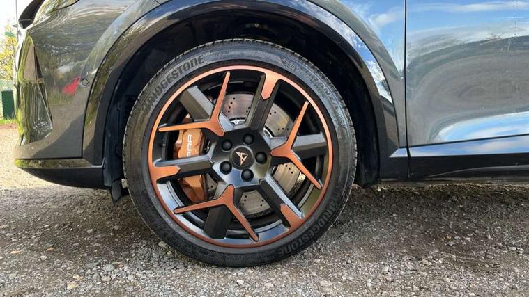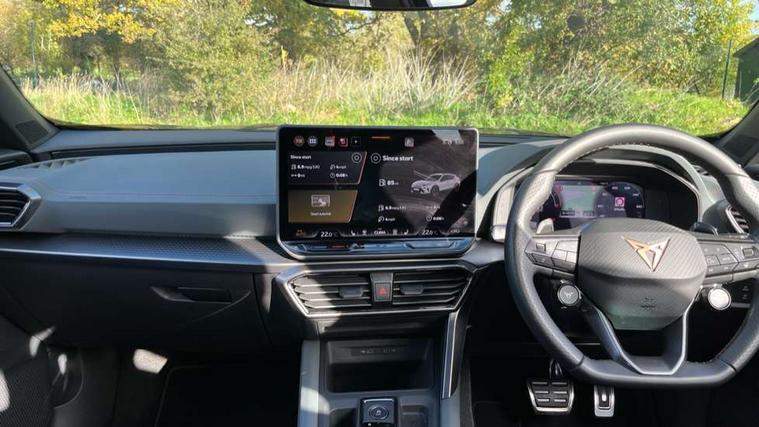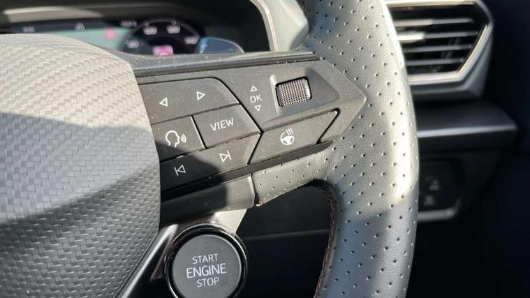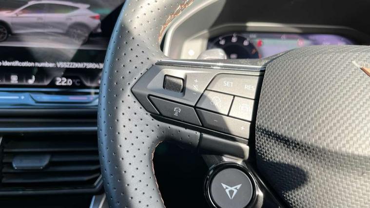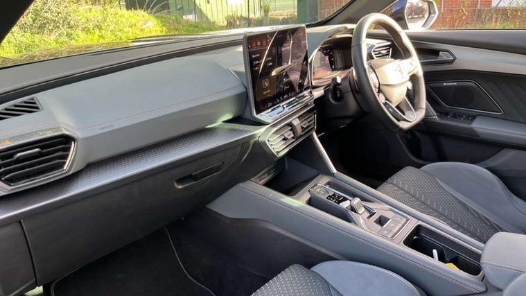 10.25" digital cockpit and configurable dashboard, Adaptive cruise control with follow-to-stop and speed limiter, Advanced driver alert system, Advanced lane assist with semi-automatic vehicle control in a medical emergency and traffic jam assist, Dynamic chassis control with driving profile selection (Comfort, Sport, CUPRA, Individual), Dynamic road sign display, Emergency steering support with turn assist, Forward collision warning with automatic braking, Full link phone integration, Intelligent park assist, RPM, trip computer, outside temp gauge, instrument light brightness, low fuel warning light, lights on reminder, gearshift indicator, Service interval indicator, Side and exit assist, Speed sensitive power steering, Start/stop system with regenerative braking, Top view camera, Virtual pedal and electric tailgate, Voice control system, Wired Android Auto, Wireless apple carplay, Wireless phone charger, Adaptive chassis control with continuous operation, CUPRA sport suspension, Electronic locking differential and dynamic traction support, 2 front and 2 rear USB type C sockets, Immersive by Sennheiser TM - 10 speakers, 1 central speaker, 1 subwoofer, Media system with navigation, 12.9" touchscreen display, voice control, DAB, steering wheel mounted controls, Auto dimming rear view mirror, Black roof spoiler, Body colour door handles, Body coloured bumpers, Dark grey wing mirror, Daytime running light with automatic headlight control and coming home feature, Door panel ambient lighting, Dynamic headlight range control, Electric front/rear windows, Electrically adjustable heated and folding door mirrors with memory function, Gloss black roof rails and window surrounds, High beam assist, LED 3rd brake light, LED front fog lamps with cornering function, LED Taillights with dynamic indicator, Matrix LED headlights with multifunction camera, Rain sensing wipers, Rear diffuser with twin exhaust pipe on each side, Rear fog lights, Rear side wing doors, Rear wash/wipe, Side skirts, Tinted rear windows, Welcome lights (within exterior mirror housing), 12V socket, 2 front and 2 rear reading lights, 3 seat bench in 2nd row, 60/40 split rear bench seat with armrest and mechanical seat release, Black headlining, Black interior roof lining, Cupra sports pedals, Dust/pollen filter, Electrically adjustable front seats with lumbar support and memory function, Front and rear head restraints, Front centre armrest, Heated front seats, Heated supersports multifunction leather steering wheel with satellite buttons and gear shift paddles, Height/reach adjust steering wheel, Illuminated aluminium doorsteps, Illuminated interior front door sills, Illuminated sunvisor with mirror, Isofix, Leather dashboard, door insert and side trim panel, LED smart wraparound lighting, PVC/Textile upholstery + cup bucket seats, Satellite steering wheel, Single front passenger seat, Three zone climate control with control panel in rear, Variable luggage/load compartment floor, 3 point seatbelts on all rear seats, ABS, Akebono brakes, Brake control system - ESC and brake booster, Child proof door locks, Driver and front passenger airbags with front passenger airbag de-activation, Driver and front passenger knee airbag, Electronic parking brake, Hill hold control, Performance brakes with front brembo calipers, Pre-crash front and rear seat belt tensioner, window closure and hazard lights, Public e-call, Seat belt reminder for front and rear seats, Side airbag for front and rear with curtain airbags, Tyre pressure monitoring system, Anti theft alarm system, KESSY Advanced - Keyless start, keyless entry with SAFELOCK, Locking wheel bolts, Copper and aluminium interior detailing, 19" Hailstorm forged machined R black and copper alloy wheels, Breakdown and tool kit,