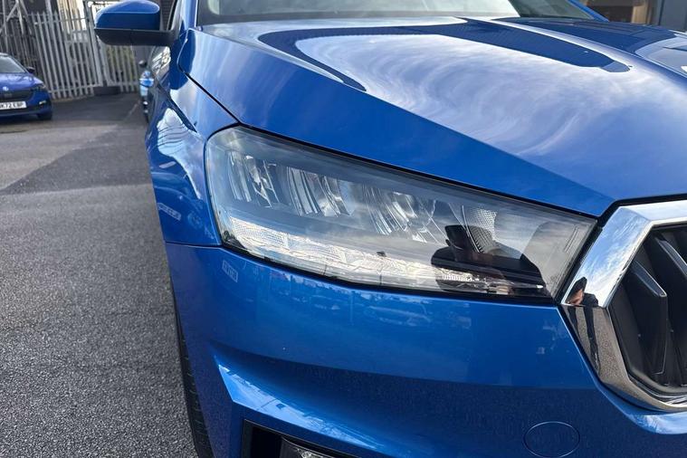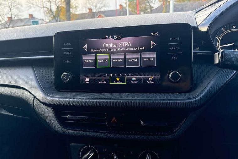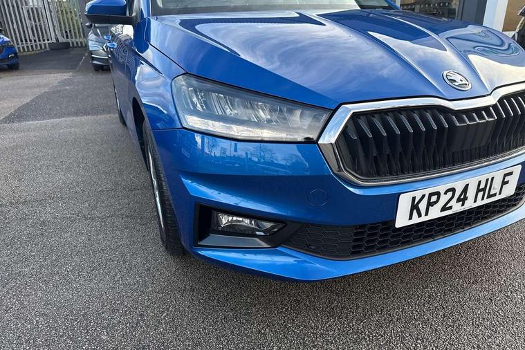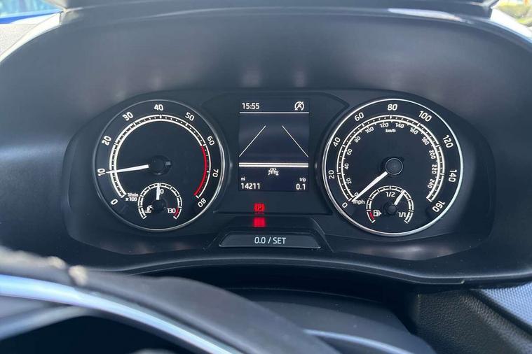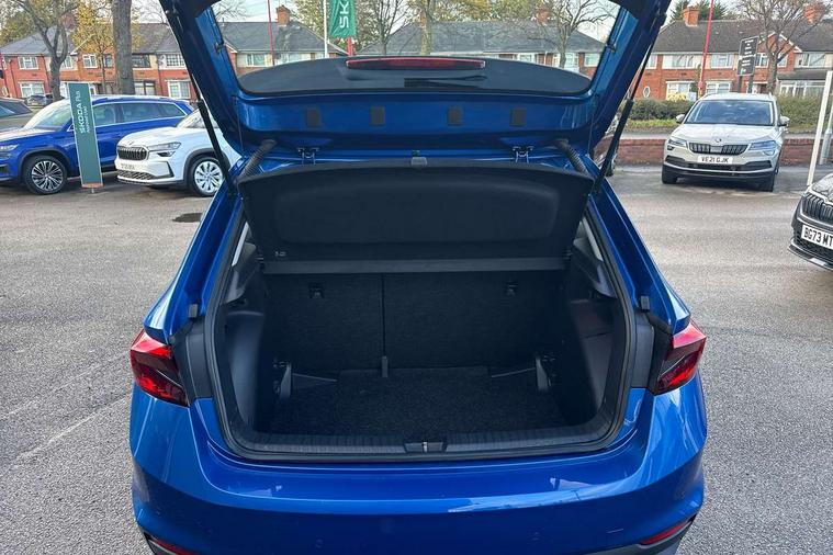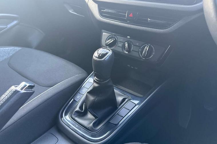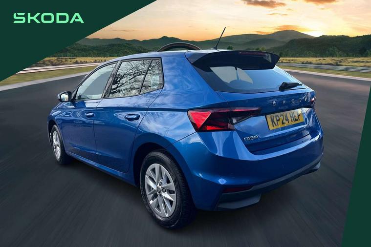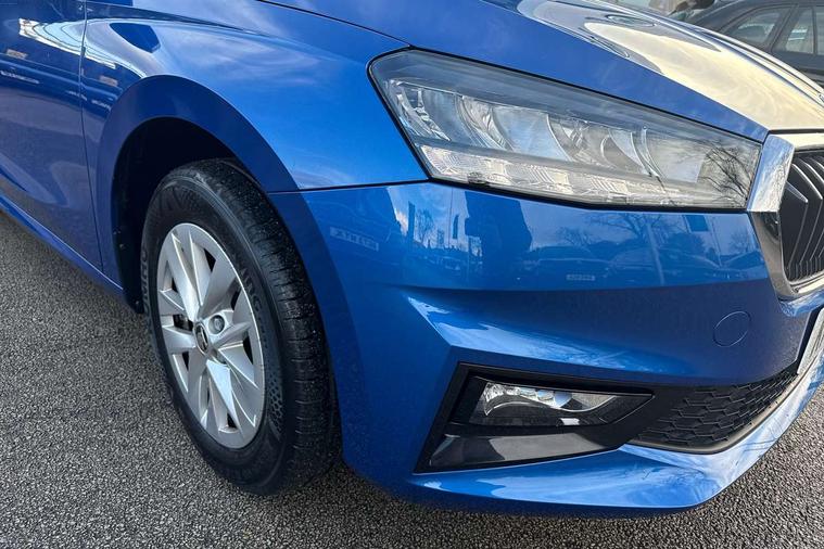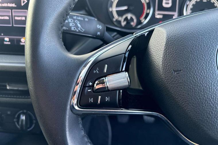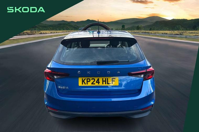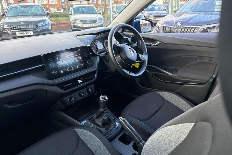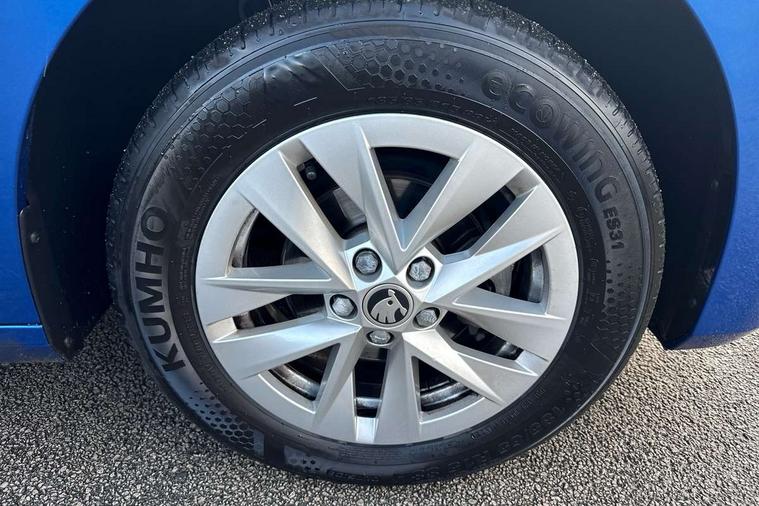 8" Digital instrument display, Advanced driver attention and drowsiness monitor, Bluetooth connection, Electromechanical power steering, Exterior temperature gauge, Lane assist including road edge detection, Rear parking sensors, Service interval indicator, Speed limiter, Traffic sign recognition, Wireless SmartLink for Apple CarPlay and Android Auto, 2x USB-C in the front (for data transmission and charging), 6 speakers (4 speakers/2 tweeters), 8.25" Skoda infotainment touchscreen display, Auxiliary socket for external MP3 player, DAB digital radio reception, Basic LED Headlights, Basic rear lights, Body colour door mirrors, Body coloured bumpers, Dimming rear view mirror with black frame, Door mirror integrated indicators, Electrically adjustable and heated door mirrors, Electrically adjustable front windows with function auto up/down, Front fog lights, Front window wiper intermittent control, Headlight range control - Automatic, Ice scraper in fuel cap, LED daytime running lights with coming and leaving home feature, Mechanical adjustable rear windows, Rain sensor, Rear LED fog light, Rear side wing doors, Rear window wiper with washing nozzles, Roof mounted spoiler, SKODA tailgate lettering in chrome, Third brake light, 2 reading lights in front and 2 reading lights in rear, 2 spoke leather multifunction steering wheel, 3 rear headrests, Backrest split and folding, Central console with removable cup holder and storage box, Chrome handbrake release button, Fabric upholstery, Front centre armrest, Gearshift knob/handle in leather, Grain satin black interior door handles, Hand brake lever handle in leather, Height adjustable driver seat, Height adjustable front headrests, Height adjustable steering wheel, ISOFIX and TopTether anchorage points to the outer rear seats, ISOFIX and TopTether on the front passenger seat, Luggage compartment lighting, Manual air conditioning, Pollen filter, Rear seat bench unsplit, Single front passenger seat, Storm grey headlining, Sun visors with mirror and airbag label on passenger side, Textile floor mats, Ticket holder, 3-point height adjustable front seats belts with pretensioner and force limiter, Automatic warning lights in case of crash, Driver and passengers airbag with switch off function, e-Call+, ESC including ABS, MSR, ASR, EDS, HBA and XDS, Front and rear seat belt warning, FRONT ASSIST (AEB City and AEB Inter Urban), Front side airbags, Head airbags, One tone horn, Pedestrian protection, Three rear 3-points safety seat belts with pretensioner and force limiter including stop function for outer rear seat belts, Tyre pressure monitoring system, Anti-theft alarm system including immobiliser, interior monitoring, backup horn, and towing protection, Central locking with radio remote control, interior controls, SAFE function and 2 foldable keys, Black painted air vents, Glossy black decorative trim, Grain satin black central console cover, Grain satin black lower decorative trim, Satin black door and side trim panel in front, Anti-theft wheel bolts protection, Super-low rolling resistance tyres,