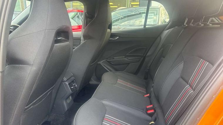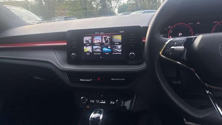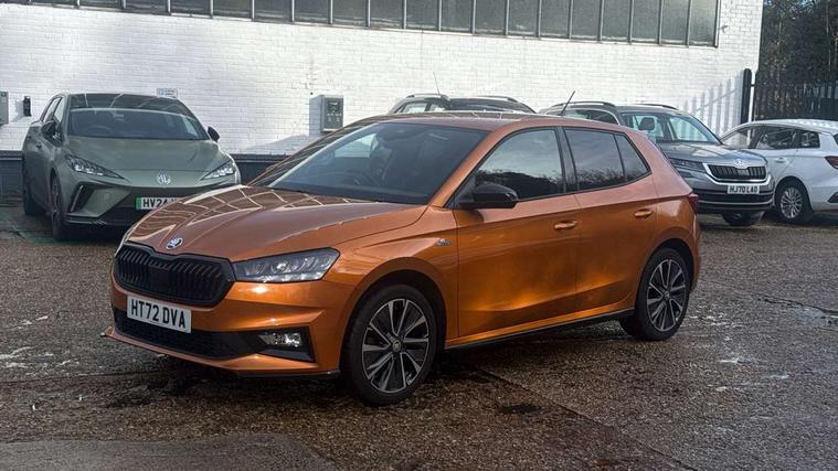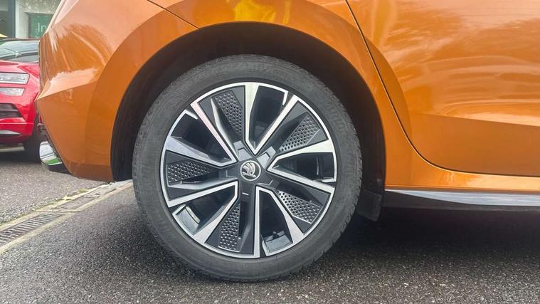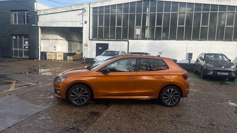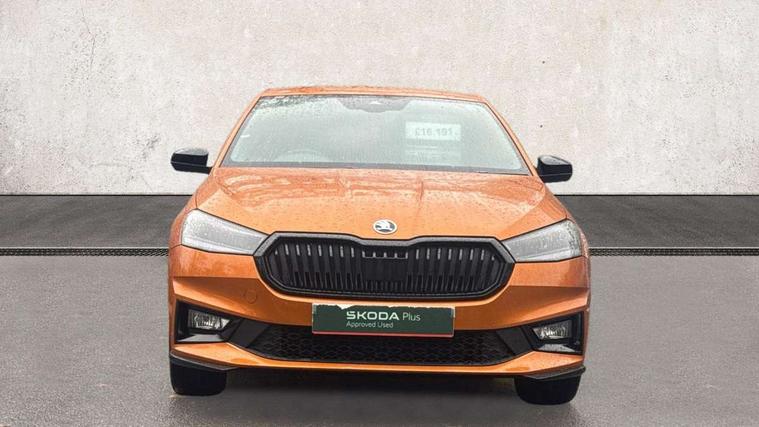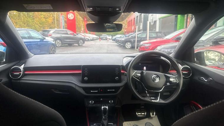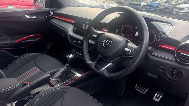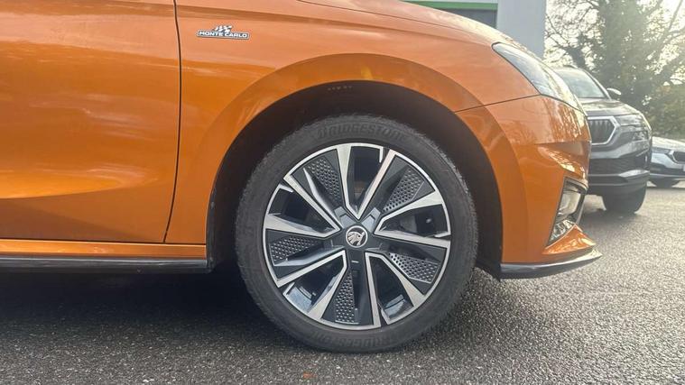 Bluetooth connection, Driver alert system - DAS, Electromechanical power steering, Exterior temperature gauge, Service interval indicator, 2x USB-C in the front (for data transmission and charging), 6 Speakers (4 in front and 2 in rear), Auxiliary socket for external MP3 player, Bolero radio with 8" colour display, DAB digital radio reception, Auto dimming rear view mirror, Basic rear lights, Black radiator grille, Body coloured bumpers, Door mirror integrated indicators, Electrically adjustable and heated door mirrors, Front and rear electric windows, Front window wiper intermittent control, Headlight range control - Automatic, Ice scraper in fuel cap, LED daytime running lights with coming and leaving home feature, Monte Carlo badging, Privacy glass, Rear LED fog light, Rear side wing doors, Rear window wiper with washing nozzles, Roof mounted spoiler, SKODA tailgate lettering in black, Sports bumpers, Third brake light, 3 rear headrests, Aluminium pedals, Backrest split and folding, Black headlining, Central console with removable cup holder and storage box, Chrome handbrake release button, Fabric/artificial leather upholstery, Front sports seats, Gearshift knob/handle in leather, Hand brake lever handle in leather, Height adjustable front headrests, Height adjustable steering wheel, ISOFIX and TopTether anchorage points to the outer rear seats, ISOFIX and TopTether on the front passenger seat, Luggage compartment lighting, Metallic painted red central console cover, Metallic red interior door handles, Monte Carlo door sills, Pollen filter, Rear seat bench unsplit, Single front passenger seat, Sun visors with mirror and airbag label on passenger side, Textile floor mats, Ticket holder, Umbrella in drivers door, Ambient lighting pack 2 - Fabia Hatchback, 3-point height adjustable front seats belts with pretensioner and force limiter, Automatic warning lights in case of crash, Driver and passengers airbag with switch off function, e-Call+, ESC including ABS, MSR, ASR, EDS, HBA and XDS, Front and rear seat belt warning, FRONT ASSIST (AEB City and AEB Inter Urban), Front side airbags, Head airbags, Hill hold assist, One tone horn, Pedestrian protection, Three rear 3-points safety seat belts with pretensioner and force limiter including stop function for outer rear seat belts, Tyre pressure monitoring system, Anti-theft alarm system including immobiliser, interior monitoring, backup horn, and towing protection, Carbon effect door and side trim panels, Carbon effect lower decorative trim with white stitching, Red metallic upper decorative trim, Anti-theft wheel bolts protection, Super-low rolling resistance tyres,