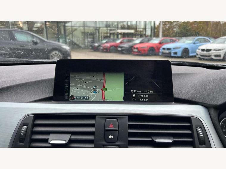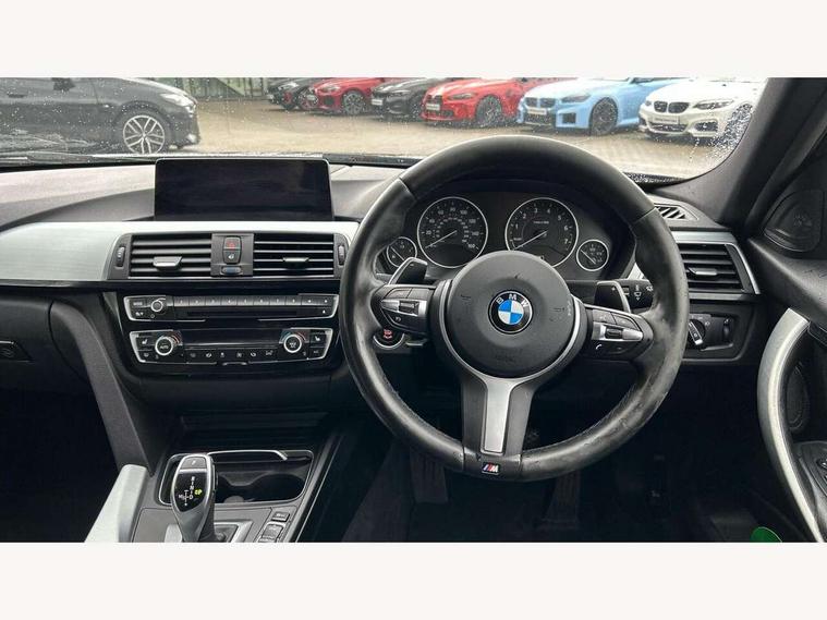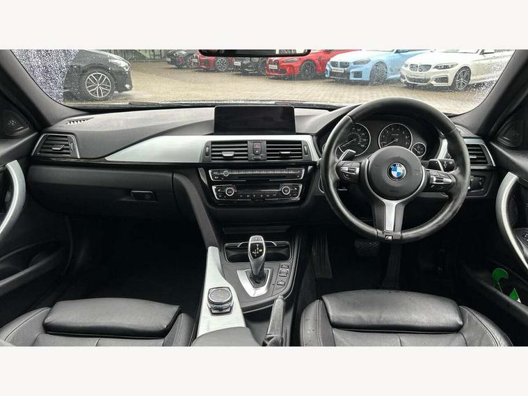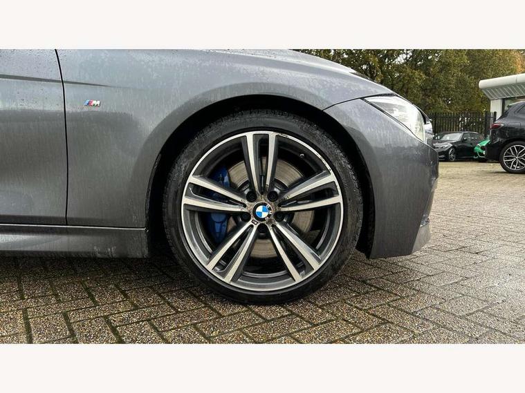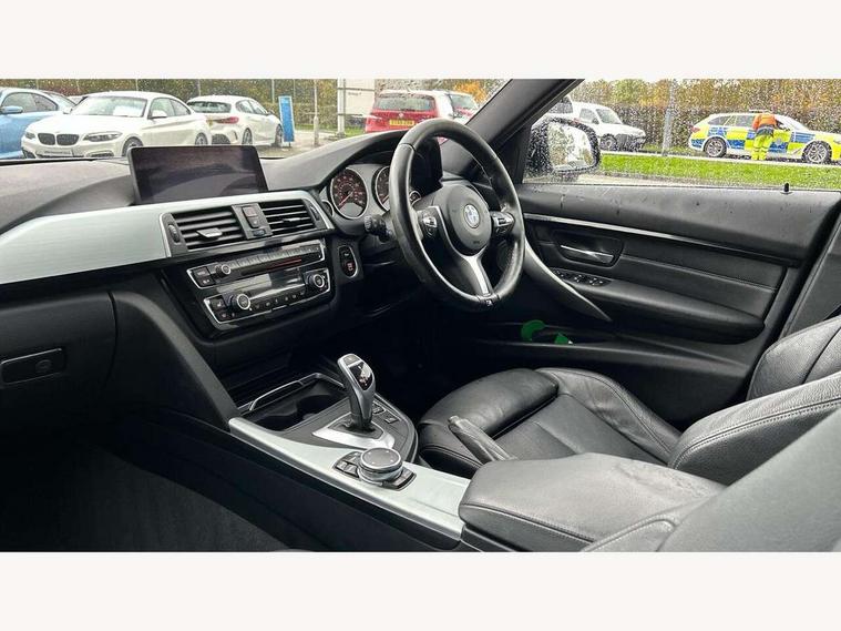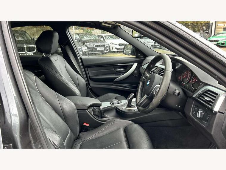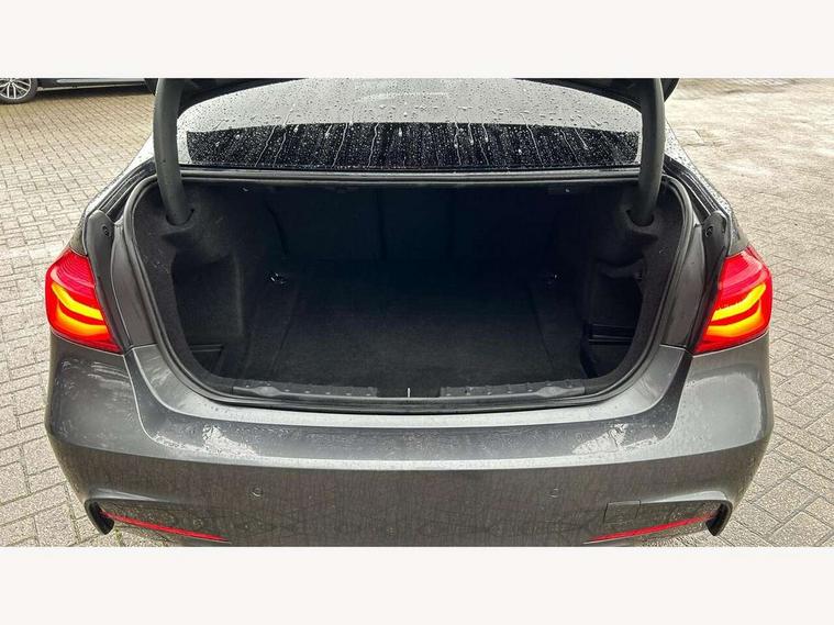 BMW Teleservices, Brake force display, Brake pad wear indicator warning light, Check control system, Digital clock, Door/boot open warning light, Front/rear park distance control, Lights on warning, Oil temperature gauge, On board computer, On board diagnostics, Operation warning of all exterior lights, Outside temperature display, Push button starter, Run flat tyre indicator, Service interval indicator, Traffic message channel (TMC), Drive Performance Control, Electronic differential lock, Auxiliary point for auxiliary devices, BMW professional radio/CD/MP3, CD Changer preparation, DAB Digital radio, 'Guide me home' headlamps, 2 speed adjustable intermittent wipers with wash/wipe function, Auto dimming rear view mirror, Automatic headlight beam throw control, Body colour bumpers, Body colour door handles, Body colour electric adjustable door mirrors, Body colour roof mouldings, Chromed finished twin exhaust, Clear indicator lenses, Door sill finishers, Dynamic brake lights, Electric front and rear windows with one touch/convenient open/close function, Front ornamental grille with chrome plated kidney bars and chrome bezel, Green tinted heat insulating glass, Heated rear window with automatic switch off, Heated windscreen washer jets, High gloss shadow line, LED daytime running lights, Rain sensor + automatic driving lights control, Shark fin roof aerial, 12V sockets in front centre console and passenger footwell, 2 x folding cupholders in instrument panel above glovebox, 3 rear seat head restraints, 4 foldable grab handles - rear with clothes hook, 4 lashing points to secure luggage, Automatic interior light soft on/soft off system, Driver and passenger sunvisors with vanity mirrors + slide cover, Dual zone automatic air conditioning, Folding front centre armrest + storage, Front and rear door armrests, Front and rear velour floor mats, Front door storage bins with bottle holder, Front sports seats with electric side bolster adjustment, Glovebox light, Height adjustable front headrests, Indirect front interior illumination - soft-light function, Individual anthracite headlining, Isofix system on outer rear seats, Leather gear knob, Leather gear selector lever handle, Leather handbrake grip, Lockable glovebox, Luggage compartment lighting, M sports leather steering wheel, Multi-function controls for steering wheel, Reach + rake adjustable steering column, Rear centre armrest with 2 cupholders, Rear storage compartment in multifunction centre console with sliding cover, Storage compartment in rear doors, Toolkit located in luggage compartment, Extended lighting package - 3 Series, 3 point inertia reel seatbelts + pre-tensioners on outer rear seats, ABS, Automatic Stability Control (ASC), BMW emergency call, Cornering brake control (CBC), Crash sensor, Driver and passenger airbags, DSC+, Dynamic brake control, Dynamic Traction Control - DTC, Front and rear head airbags, Front passenger airbag deactivation, Front seat side impact airbags, Front seatbelt pretensioners + load limiters, Hill start assist, Rear child proof door locks, Seatbelt warning, Three 3 point rear seatbelts, Twin horns, Tyre pressure monitor, Warning triangle and first aid kit, Automatic drive away locking facility, Central locking fuel filler cap, Centre lock switch, Electronic immobiliser, Key integrated remote control central locking, Remote control alarm, Low rolling resistance tyres, Run-flat tyres,