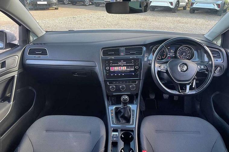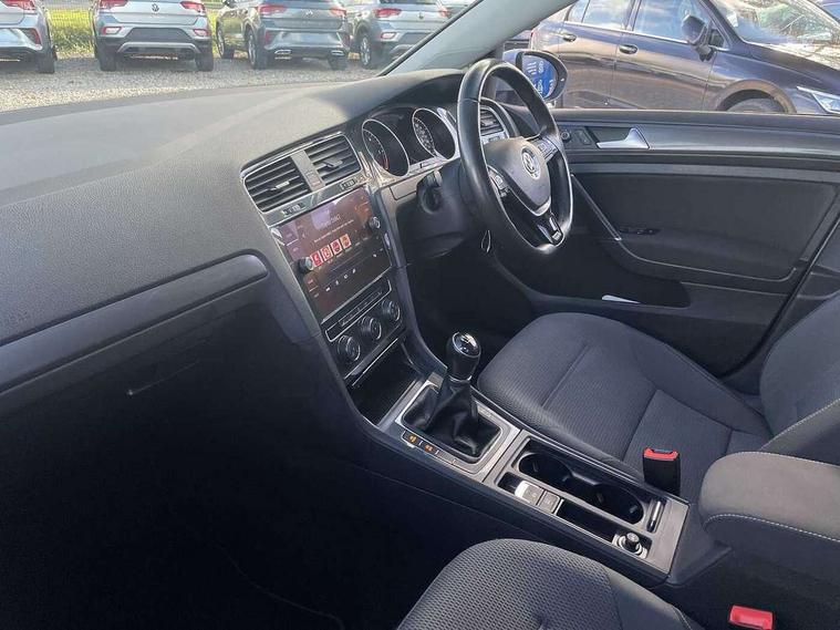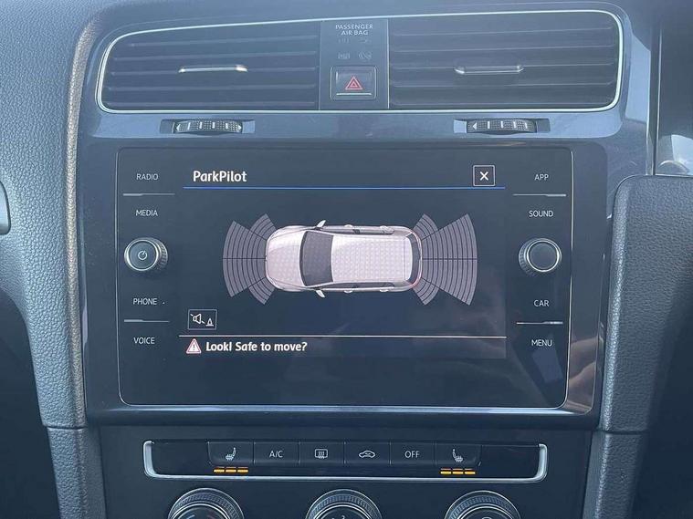 App-Connect, 'Lights On' Reminder warning buzzer, 8" touch screen, Adaptive Cruise Control with pedestrian detection and speed limiter, Bluetooth hands free telephone connection, Brake pad wear indicator warning light, Driver alert system, Driver profile selection, Exterior temperature gauge, Front assistant collision mitigation, Instrument cluster in white, Multifunction computer, PAS - speed related, Rev counter, Trip and service interval display, Ultrasonic front and rear optical and audible parking sensors, Warning buzzer and light for front seatbelts unfastened, Diesel particulate filter, XDS electronic differential lock, CD/MP3/WMA, USB and SD card reader, aux-in, Composition media system, DAB Digital radio, Auto dimming rear view mirror, Automatic coming/leaving home lighting function, Automatic headlights, Black front air intake and radiator grille with chrome insert, Black rear diffuser, Body colour bumpers, Body colour door handles, Body colour door mirrors, Electric front windows, Electric rear windows, Electrically adjustable and heated door mirrors, Heated rear windscreen, LED daytime running lights, LED rear lights, Rain sensor, Rear roof spoiler, Rear windscreen washer and wiper with interval delay, 12V socket in luggage compartment, 3 rear headrests, 3 spoke steering wheel, 60/40 split folding rear seat, Bag hook in luggage compartment, Boot lashing points, Cooled glovebox, Courtesy light delay, Cover for storage compartment in centre, Dust/pollen filter, Front and rear reading lights, Front centre armrest with storage box and rear air vents, Front passenger drawer stowage, Front passenger seat height adjust, Front seat back storage pockets, Grab handles, Height adjustable driver's seat, Height/reach adjust steering wheel, Illuminated vanity mirrors, Isofix preparation for 2 rear child seats, Load through provision with rear centre armrest and cupholders x2, Luggage compartment cover, Luggage compartment lighting, Multifunction leather steering wheel with leather gear knob/handbrake grip, Overhead storage box, Pearl grey headlining, Storage box in luggage compartment, Storage compartments in doors, Sun visors, Variable boot floor, height adjustable and removable, Mirror pack - Golf, 3 point height adj front seatbelts + pretensioners, 3 rear 3 point seatbelts, ABS, Automatic post collision braking, Child locks on rear doors, Driver/Front Passenger airbags, Driver/Passenger whiplash optimised head restraints, Drivers knee airbag, Electronic parking brake with auto hold, ESP with EDL + ASR, Front and rear curtain airbags, Front passenger airbag deactivation, Front side airbags, Pre crash system, Tyre pressure monitor, Alarm with interior protection, Electronic engine immobiliser, Remote central locking with 2 remote folding keys, Brushed dark metal decorative inserts, Chrome-plated light switch surround, Polar night black centre console, Steel space saver spare wheel,