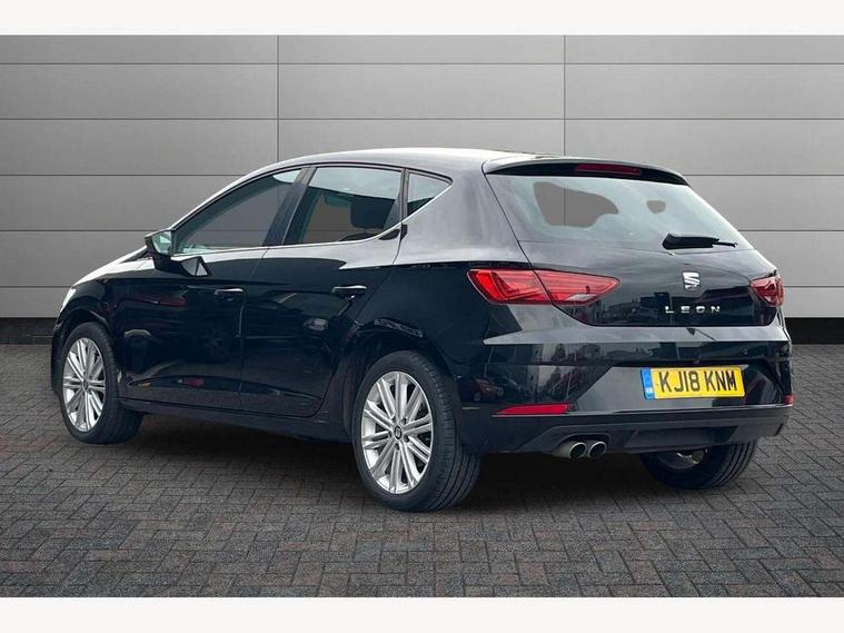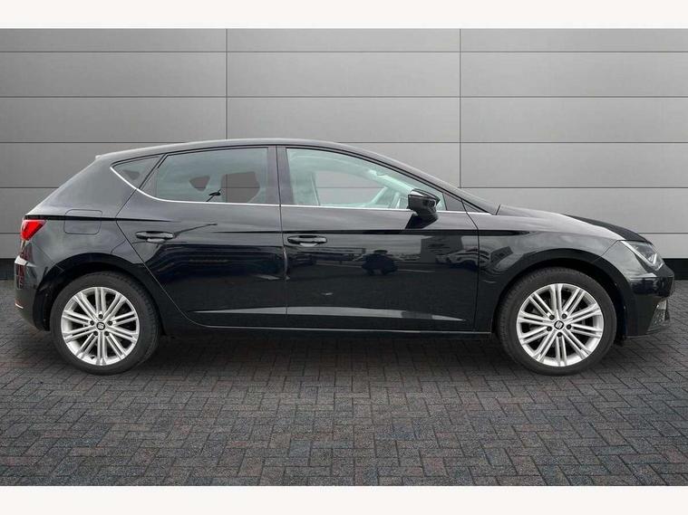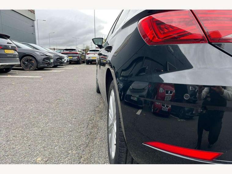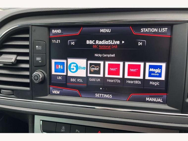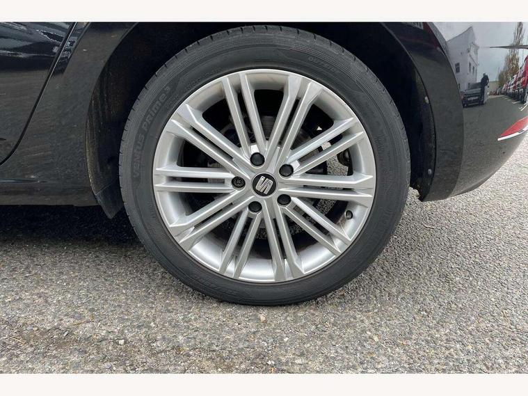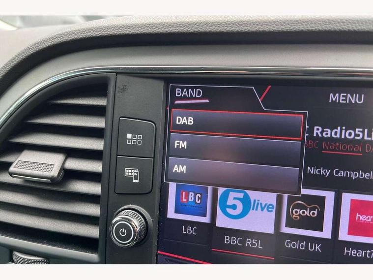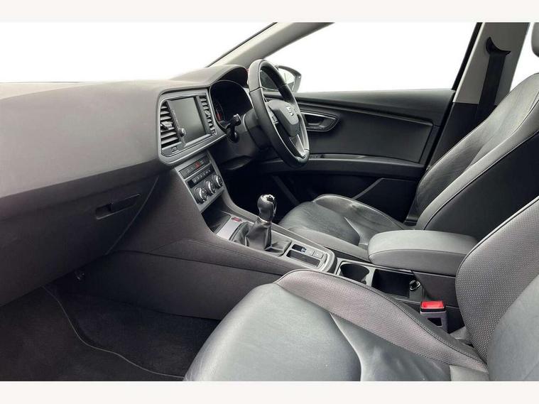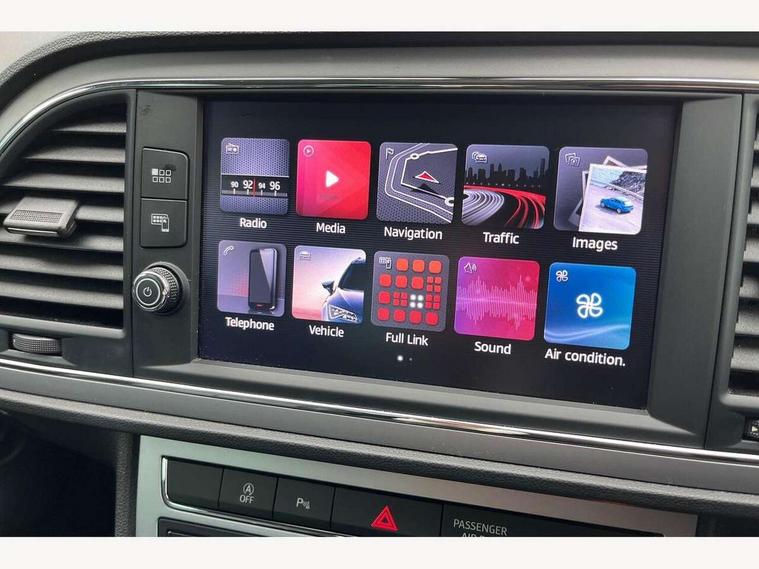'Lights On' Reminder warning buzzer, 8" touch screen, Bluetooth Handsfree Phone Connection, Front parking sensors, Low fuel warning light, Outside temperature gauge, Rear parking sensors, Remote fuel flap release, SEAT logo boot release, Service interval indicator, Touch screen display, Trip computer, Voice control system, XDS electronic differential lock, 2 USB ports, 2x SD card slot, Auxiliary input socket, Bluetooth audio streaming, Connecting box, DAB Digital radio, Radio/CD + MP3, Steering wheel mounted audio/phone controls, Aluminium front door sills, Body colour door handles, Body coloured bumpers, Body coloured door mirrors, Chrome radiator grille and surround, Chrome window surround, Dark tinted rear windows, Electric adjustable/heated/folding door mirrors, Electric front/rear windows with one touch/auto up/down, Electric headlamp adjustment, High gloss black finish B and C pillars, LED indicators in door mirrors, Rear wash/wipe, Reverse activated kerb-view adjustment on passenger's door mirror, Twin exhaust pipes, 12v power point in centre console, 3 height adjustable rear headrests, 60/40 split folding rear seat, Active head restraints, Additional heating and ventilation outlet in rear of centre console, Ambient lighting, Boot net, Driver seat lumbar adjustment, Driver/passenger sunvisors with illuminated vanity mirrors, Dual zone climate control, Dust/pollen filter, Front adjustable head restraints, Front armrest with storage box, Front cupholders x 2, Front seat and rear pockets, Front sports seats, Front/rear floor mats, Height/reach adjust steering wheel, Illuminated boot, Illuminated glovebox, Illuminated rear centre console, Instrument lighting with brightness control, Leather handbrake, Leather steering wheel and gear knob, LED reading lights, Luggage tie-down hooks, Passenger seat height adjuster, Passenger seat lumbar adjust, Rear top tether child seat ISOFIX attachment, Full LED headlight pack - Leon, 3 point seatbelts on all rear seats, ABS + traction control, Child proof door locks, Collision mitigation braking system, Curtain airbags, Driver/Front Passenger airbags, Drivers knee airbag, Electronic parking brake with auto hold, ESP+EBA, Front seatbelt pretensioners, Front Seatbelt warning, Front side airbags, Hill hold control, Passenger airbag deactivation system, Tyre pressure monitoring system, 2 folding remote keys with window open/close function, Engine immobiliser, Keyless entry, Remote central locking + deadlocks, Volumetric alarm with back up horn, Chrome interior trim,
