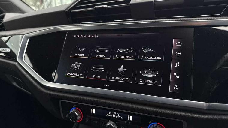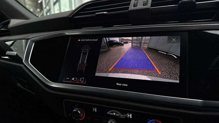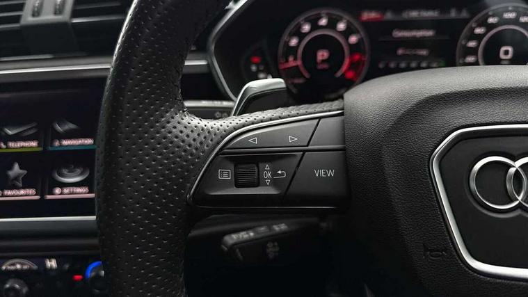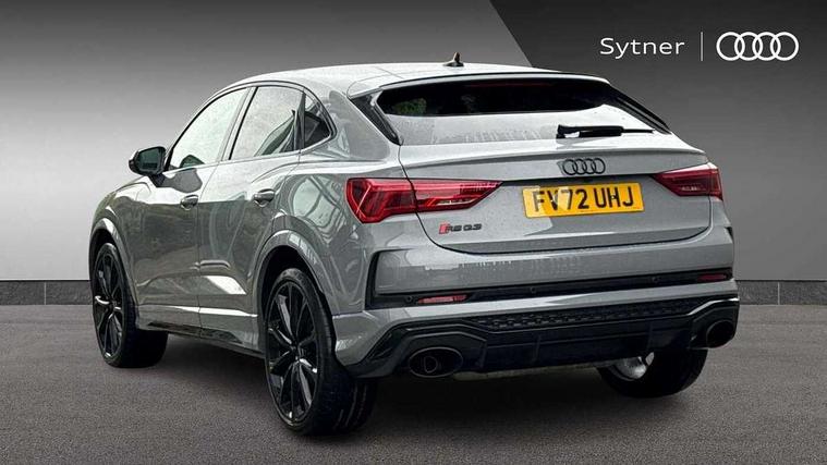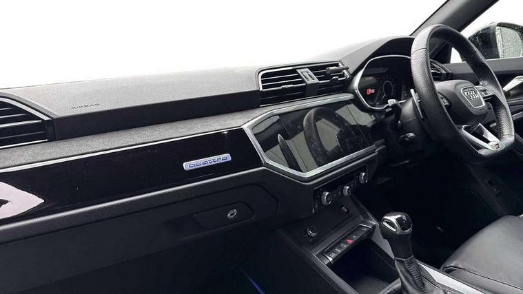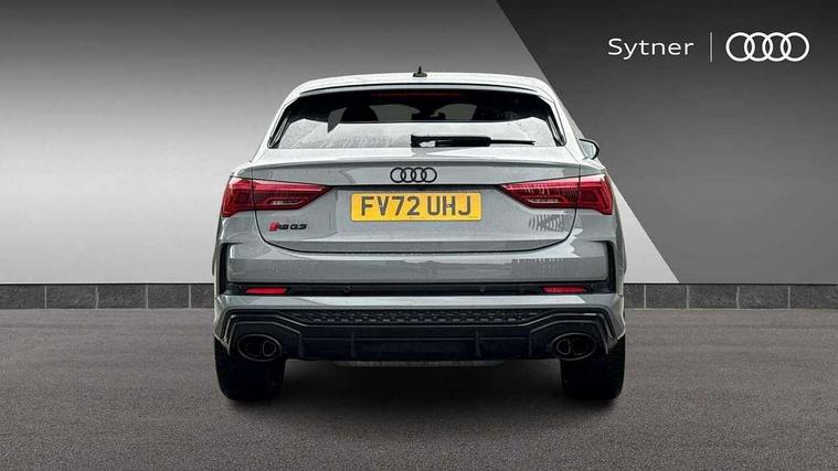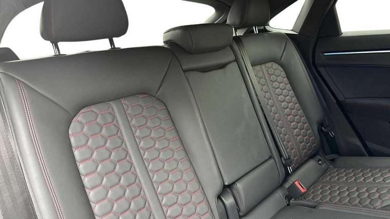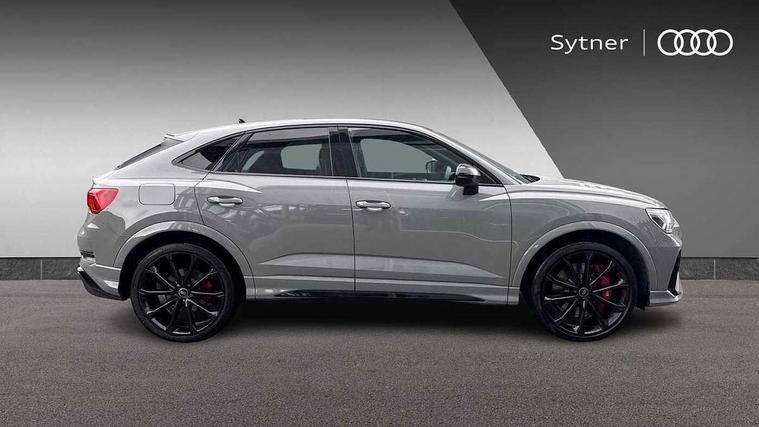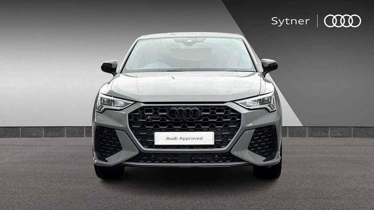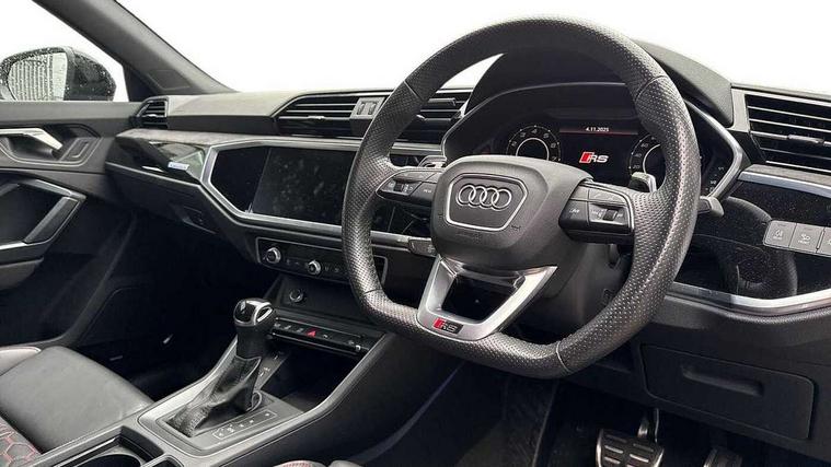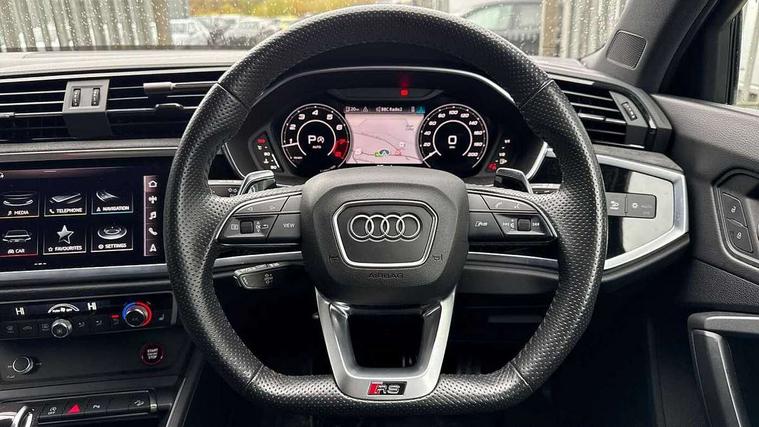 Audi drive select with new RS modes, Audi lane departure warning, Audi parking system plus with front and rear sensors, Audi virtual cockpit plus - 12.3 inch display, Bluetooth interface, Camera based traffic sign recognition, Emergency e-call, MMI Navigation Plus with high resolution 10.1 inch touchscreen colour display, Power operated tailgate, Progressive steering, Smartphone interface includes wireless Apple carplay/Android Auto, Start stop system with recuperation, Voice control system with natural language interaction, Quattro all wheel drive, 2 USB-C ports with charge and data functions, Audi sound system, DAB digital radio module, Acoustic windscreen, Audi Beam uses LEDs to project the Audi Sport logo, Auto dimming frameless rear view mirror, Body colour rear spoiler with lip in gloss black, Electrically folding, adjustable and heated door mirrors with integrated LED side indicators and kerb view function for passenger side, Flared wheel arches, Flat slits on single frame grille, Headlight washers, High gloss black finish B and C pillars, Honeycomb radiator grille in gloss black, Illuminated door sill trims with RS logo, LED headlights with LED daytime running lights and dynamic rear indicator, LED rear lights, LED third brake light, Panoramic glass sunroof, Privacy glass dark tinted rear and rear-side windows (from B-pillar backwards), Rain and light sensors, Rear side wing doors, Rear wiper, RS specific bumpers with large front air inlets in black, RS Sport exhaust system, dual branch with exhaust flap control and gloss black oval tailpipe trims, Tinted rear windows, Variable front intermittent wipers, 3 seat bench in 2nd row, 4 way electric lumbar support for driver and front passenger, Adjustable rear seat bench/backrest with centre armrest and cupholder, Black Alcantara elements - dashboard and the armrests in the front and rear doors, Black cloth headlining, Dual zone electronic climate control, Electrically adjustable front seats, Fine Nappa leather upholstery with front sports seats + honeycomb stitching and RS embossed logo, Front and rear floor mats, Front and rear head restraints, Front centre armrest, Heated front seats, ISOFIX child seat mounting for front passenger with airbag deactivation and outer rear seat including top tether attachment point for outer rear seats, Single front passenger seat, Stainless steel luggage compartment sill finisher, Stainless steel pedals, Ambient lighting pack - RS Q3, Black styling pack - RS Q3, Non smoking pack - RS Q3, 3x3 point rear seatbelts, 6 airbags - Driver, front passenger, curtain and side windows, Audi pre-sense front with pedestrain and cyclist recognition, Electrically operated child locks on rear doors, Electromechanical parking brake, Electronic stabilisation control including ABS, ASR and EDL, Front seatbelt reminder, Hill descent control, Hill hold assist, Pre sense basic, RS brake system, Seatbelt monitoring, Tyre pressure warning, Warning triangle and first aid kit, Advanced key, Anti theft alarm, Anti theft wheel bolts, Immobiliser, Aluminium look interior elements, Detail dashboard around MMI touch colour display in glass look, black with surround in aluminium look, Inlay - Black piano finish, Tool kit, Tyre repair kit,