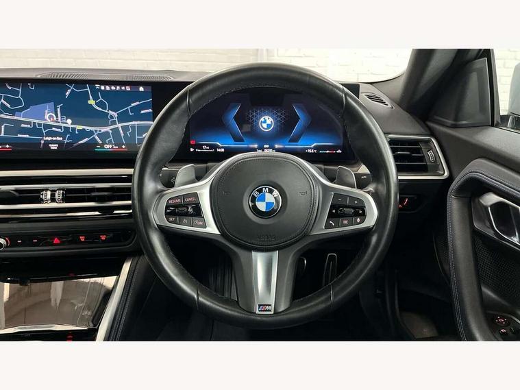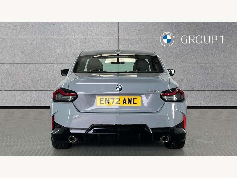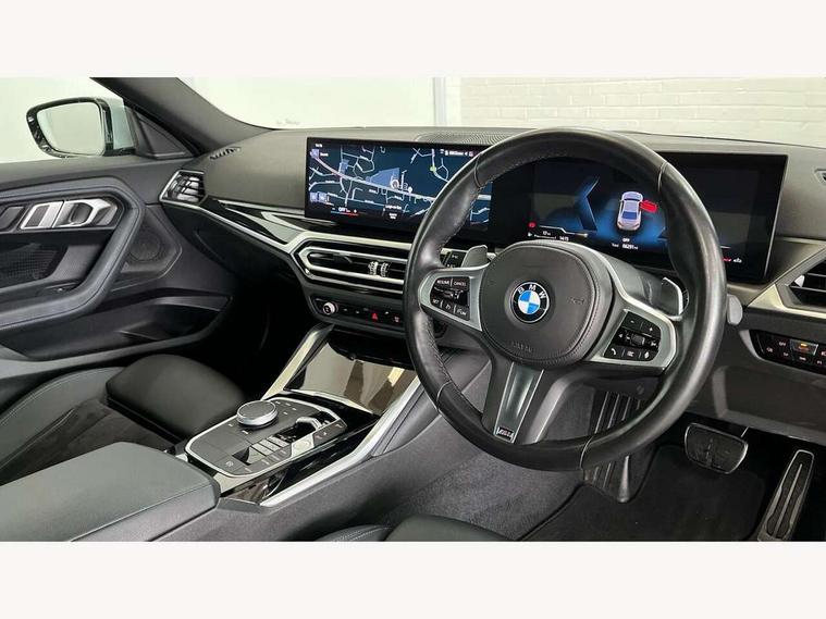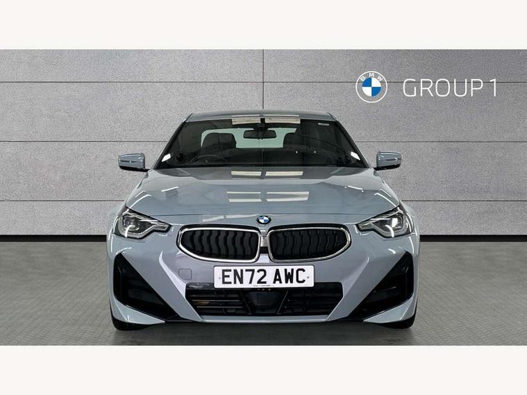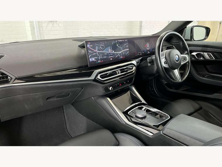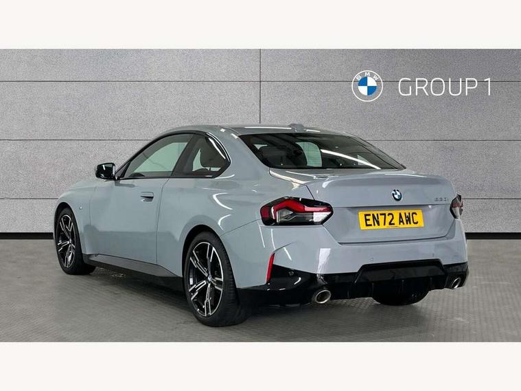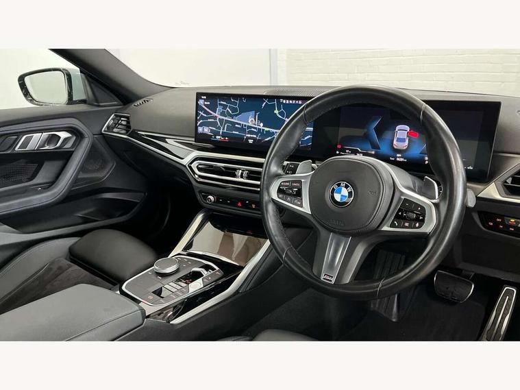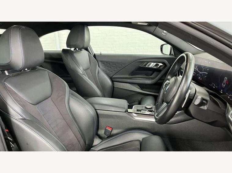 Attentiveness assist, Auto start-stop, Bluetooth, BMW ConnectedDrive online services, BMW Teleservices, Check Control warning system for monitoring of lights and door/luggage compartment open warning, Direct selection buttons, Drive off assistant, Eco pro mode, Electric power steering, Front and rear parking sensors, Front/rear Parking distance control, iDrive controller with turn and press function, Integrated owners handbook, Intelligent functions, Live cockpit plus with nav function 12.3" instrument cluster and 14.9" centre display, Oil sensor for level and grade, Optimum shift indicator, Personal Profile, Touch operation on control display, Variable sport steering, Widescreen multi-media display, Aluminium lightweight construction, Balancer shaft, BMW TwinPower Turbo four-cylinder petrol engine, Double VANOS, Drive performance control with ECO PRO comfort + sport mode, Electronic differential lock, High precision injection, M sport suspension, Petrol Particulate Filter, Sport automatic steptronic transmission with gearshift paddles, manual gearshift time display, launch control, coasting idle ECO PRO/COMFORT modes, Twin scroll turbocharger with Valvetronic, DAB tuner, Acoustic windscreen wipers for reduced driving noise, Adaptive LED Headlights, Automatic windscreen wipers and automatic headlight, Automatically dimming rear view mirror, Body colour door handles flush with door surface, Body colour door mirrors, Body colour front and rear bumpers, Daytime running lights, Electric windows - front and rear, with open/close fingertip control and trap release, Exhaust tailpipes x2 - 90mm in left and right, Fading support, Front and rear bumper system with replaceable deformation elements, Front door sill finishers in black plastic with BMW designation, Front windscreen wipers with integrated washer jets, Green tinted heat protection glazing, High beam assistant, High gloss shadowline exterior trim in mirror triangle cover, mirror cover panel, mirror bezel and window border, High level third brake light, Indicators integrated int mirror housing, LED registration plate light, LED technology rear tail lights, brake lights and turn indicators, Lightweight engineering, Model designation on right side of tailgate, One piece kidney grille with hight gloss chrome surround, Rear boot, Rear fog lights, Reversing light in rear light cluster, Shark fin antenna, Single part LED rear lights with smoked glass components, Trailer stabilisation logic, Visible VIN plate, 12V power socket in front centre console with blanking plug, 2 cupholders in front centre console, 3 zone automatic air conditioning, Ambient lighting, Compartment in front of cupholder, Conditioned based service, Driver seat backrest width adjustment, Front and rear side armrests integrated into door trim, Front armrest, Front door pockets, Front head restraints, Front sport seats, Heated front seats, Illuminated glove compartment with separate small compartment, M headliner Anthracite, M sport leather steering wheel, Manually adjustment steering wheel column, Rear seat backrest with manual 40:20:40 split folding, Rear seat centre foldable armrest with integrated cup holder, Single front passenger seat, Storage compartment between rear seats, Storage tray and compartment with cover in centre console, Sun visors with vanity mirrors and insert tab, Through loading system with 40/20/40 split folding 2 rear seat in 2nd row, Two folding rear seat headrests, Velour floor mats, Additional storage compartment pack without USB - 2 Series Coupe, Connected pack professional - 2 Series Coupe, Interior and exterior mirror pack - 2 Series Coupe, M Sport exterior styling aerodynamics pack - 2 Series Coupe, 2 tone horn, Anti lock braking system (ABS) with cornering brake control, Automatic Stability Control (ASC), BMW emergency call, Brake drying, Child seat ISOFIX attachment for the two outer rear seats, Crash sensor activating of airbags, Unlocking doors, hazard warning lights, interior light, safety battery terminal, Deactivation of fuel pump in the event of a crash, Driver and front passenger airbags, Driver and front passenger side airbags, integrated in the door side seat backrest bolsters for all seat variants, Dynamic brake control, Dynamic stability control + (DSC+), Dynamic Traction Control - DTC, Electrically operated hand brake including automatic hold function and automatic release when driving off, Front and rear disc brakes, Front passenger airbag deactivation, Head airbags for all 4 outer seats, Manual deactivation of front passenger airbag, Seat belt security check for driver and front passenger, Seatbelt warning, Side impact protection, Three point seat belts on 4 seats including front belt stopper, pyrotechnic belt tensioners and belt force limiters, Tyre pressure sensor, Warning triangle and first aid kit, Alarm system (Thatcham 1) with remote control and electronic engine immobiliser, Central locking switch for all doors, fuel filler cap and luggage compartment, Deadlocking function system to all doors, Drive away locking system on all doors and luggage compartment, Locking wheel bolts, Start/Stop button (illuminated) in centre console with keyless engine start and Auto Start-Stop deactivation button, Two remote control key with integrated key - one button for open and close doors/fuel flap/tailgate and separate button for unlock luggage compartment, BMW mobility tyre sealing system, Electrically powered 12V compressor, Reduced rolling resistance tyres,