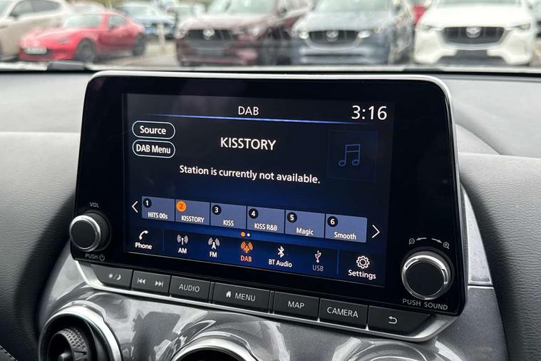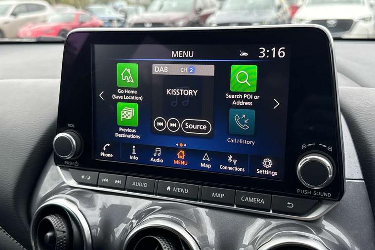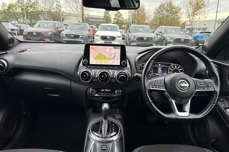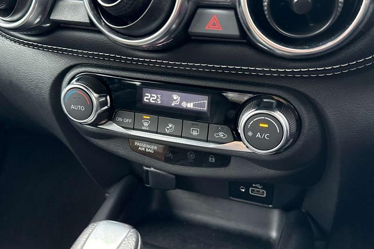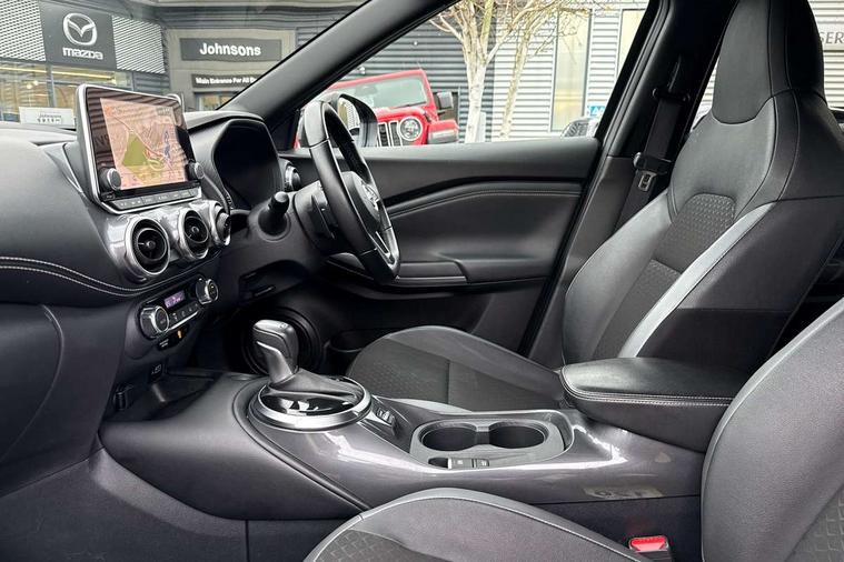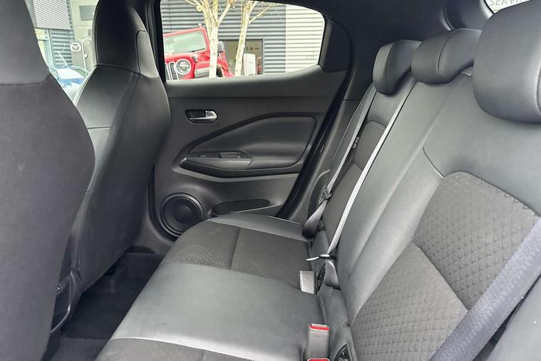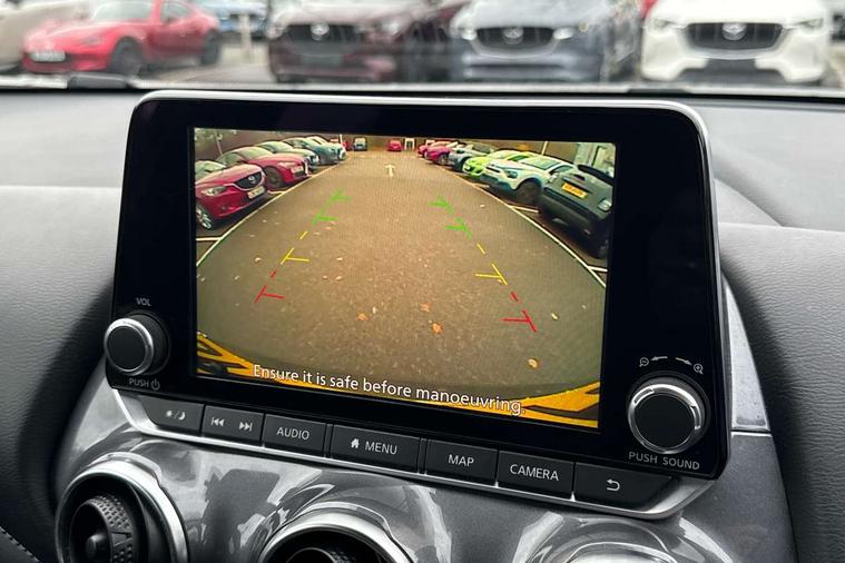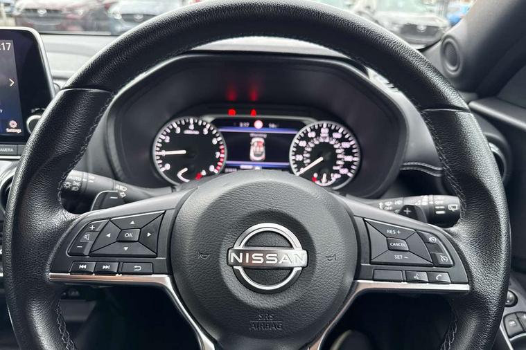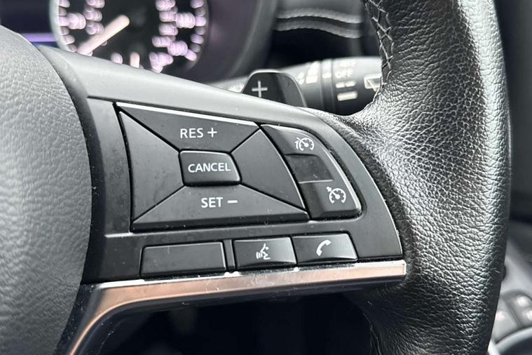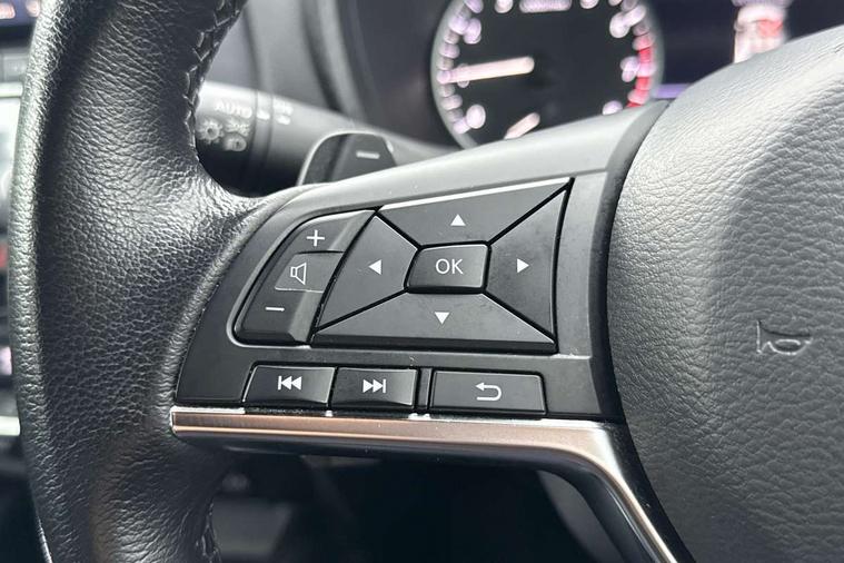 7" full colour TFT screen combimeter, Apple CarPlay and Google Android auto, Drive modes select (Eco, normal and sport), Emergency and breakdown call, Front parking sensor, Idle start/stop system, Intelligent lane intervention, Lane departure warning system, Nissan connect 8" touch screen entertainment system, Nissan connect nav with TomTom traffic, Nissan connect services and Wifi connection, Outside temperature sensor, Power Steering, Rear parking sensor, Traffic sign recognition, Trip computer, Voice recognition, Gasoline particulate filter, 6 speakers, Bluetooth system, USB, Aux-in and 12V socket, DAB Digital radio, Rear console USB port, Auto dimming interior rear view mirror, Auto headlights, Automatic hazard signal with emergency stop signal, Body colour bumpers, Body colour door handles, Electrically adjustable door mirrors with integrated indicators, Follow me home headlights, Front and rear electric window with one touch driver window, Heated and auto folding door mirrors, High beam assist, LED 3rd brake light, LED daytime running lights, LED headlamps, LED rear fog lamp, LED rear lamps, Rain sensor windscreen wipers, Rear privacy glass, Rear side wing doors, Rear wiper, Roof spoiler, Shark fin roof antenna in Pearl Black, Three blink turn signal, 3 height adjustable rear headrests, 3 seat bench in 2nd row, 60/40 split folding rear seat, Automatic climate control, Card holder on driver sunvisor, Cloth upholstery with black and metallic grey syntech leather inserts, Driver and passenger sliding and reclining seats, Driver side rear coat hanger, Driver/passenger sunvisors and vanity mirrors, Front and rear cabin lights, Front armrest, Front door pockets with bottle holders, Front head restraints, Front/rear passenger grab handles, Grey synthetic leather kneepad, Height adjustable driver's seat, Internal chrome door handles, Leather gearshift knob, Leather steering wheel, Luggage board, Luggage space lighting, Monoform sporty seats, Multifunction steering wheel, Rear door bottle holders, Single front passenger seat, Steering wheel mounted gearshift paddles, Telescopic steering wheel adjustment, Two cupholders in front centre console, Two rear isofix child seat anchorage points with top tether, Welcome light and console tray ambient lighting, ABS with EBD and brake assist, Active ride control, Active Trace Control, Driver and passenger airbags, Driver and passenger side airbags, Electric handbrake with auto hold function, Electronic Stability Programme (ESP), Front and rear curtain airbags, Height adjustable seatbelts, Hill start assist, Intelligent emergency braking with pedestrian and cyclist recognition, Rear door child safety locks, Seatbelt reminder for driver/front passenger and rear seats, Single tone horn, Three 3 point rear seatbelts, Traction control, Tyre pressure monitoring system, VDC Dynamic Vehicle Control, Ventilated rear brake discs, Alarm, Immobiliser, Intelligent key and start push button with walk away lock and approach unlock functions, Remote central locking,