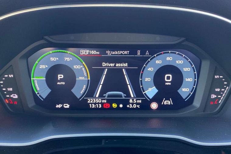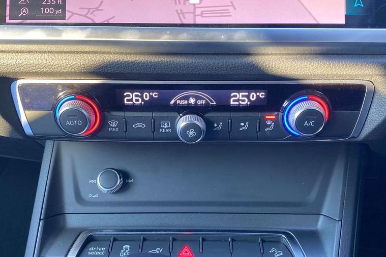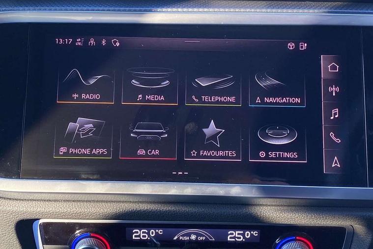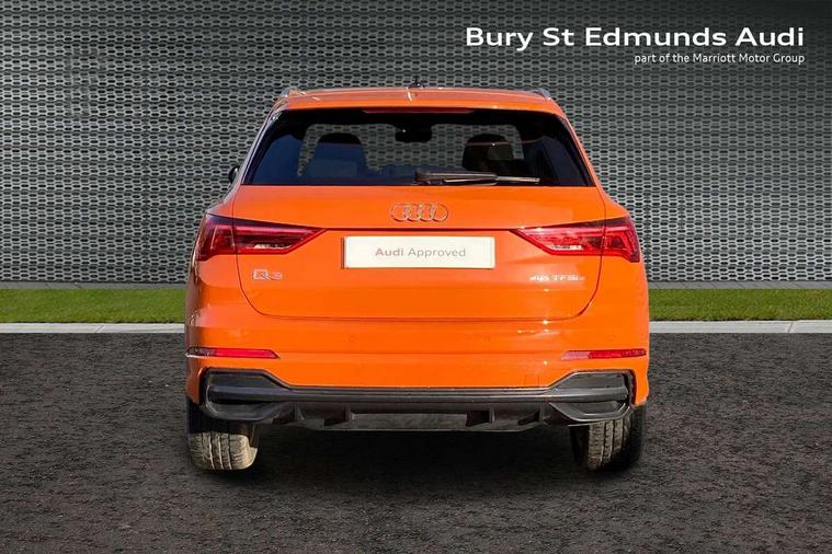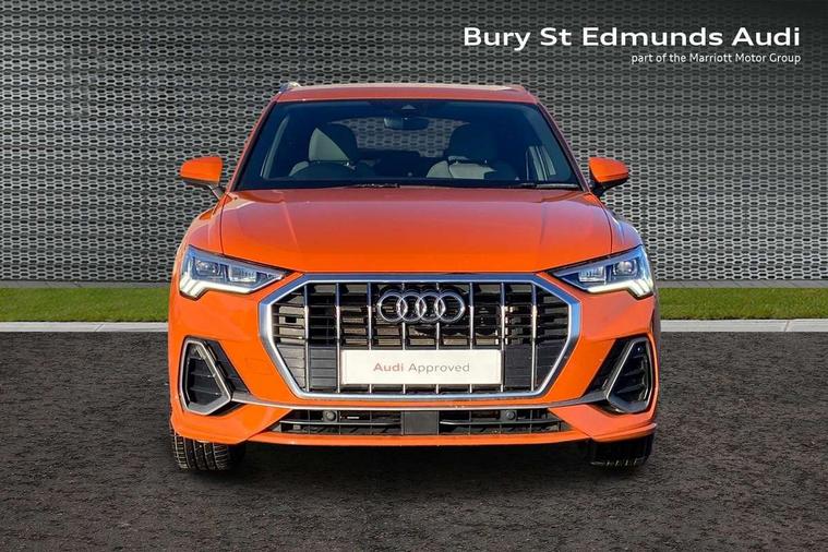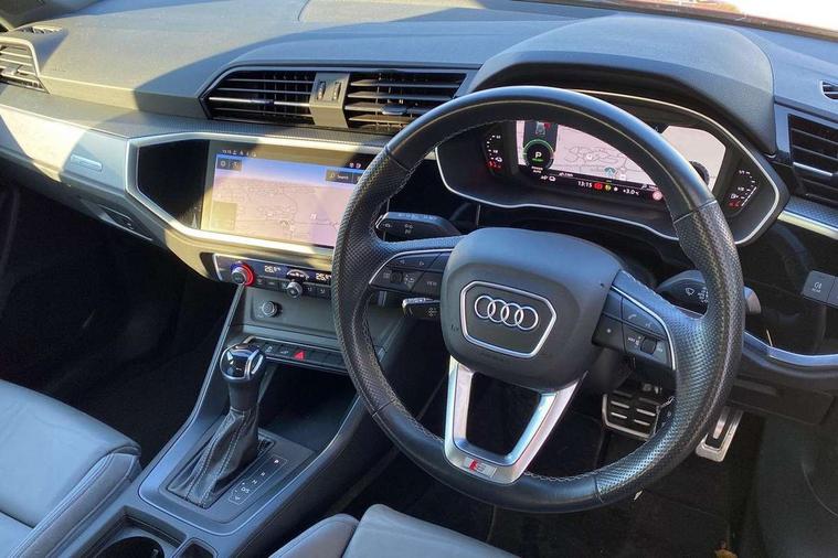 Amazon alexa Integration, Audi drive select, Audi lane departure warning, Audi Virtual Cockpit - 10.25" display, Bluetooth interface, Camera based traffic sign recognition, Legal emergency call, MMI Navigation Plus with high resolution 10.1 inch touchscreen colour display, Power operated tailgate, Progressive steering, Service interval indicator, Smartphone interface includes wireless Apple carplay/Android Auto, Start stop system with recuperation, Voice control system with natural language interaction, 3 pin 10 amp domestic charging cable, 3.6 kw On-board charger, Type 2 mode 3 32 amp charging cable, Type 2 socket for AC charging, 2 USB-C ports with charge and data functions, 6 passive loudspeakers, DAB digital radio module, Acoustic windscreen, Aluminium roof rails, Aluminium window trim, Auto dimming frameless rear view mirror, Body coloured bumpers, Electrically folding, adjustable and heated door mirrors with integrated LED side indicators and kerb view function for passenger side, Front and rear electric windows, Front fog lights, Front side air inlets in matt platinum grey, Front spoiler blade in matt platinum grey, Grille vertical bars in aluminium silver/Matt, High gloss black finish B and C pillars, LED headlights with LED daytime running lights, LED rear lights, LED third brake light, Privacy glass dark tinted rear and rear-side windows (from B-pillar backwards), Rain and light sensors, Rear diffuser grille in grained matt black, Rear diffuser strip in matt titanium black, Rear side wing doors, Rear wiper, S line badges on front wings, S Line front and rear bumpers, Side skirt insert in matt Platinium grey, Titanium black radiator grille, Variable front intermittent wipers, 12V socket in rear centre console, 3 seat bench in 2nd row, 40:20:40 folding with manual adjustment for 60:40 forwards/backwards position and backrest angle, Adjustable rear seat bench/backrest with centre armrest and cupholder, Black cloth headlining, Dual zone electronic climate control, Front and rear black floor mats with contrast stitching in rock grey, Front and rear headrests, Front and rear roof module including reading lights, Front centre armrest, Glove compartment lighting, Height and reach adjustable steering wheel, Illuminated door sill trims with S logo, ISOFIX child seat mounting for front passenger with airbag deactivation and outer rear seat including top tether attachment point for outer rear seats, Luggage compartment light, Manual front seats with height adjustment, Perforated leather gearknob, Single front passenger seat, Stainless steel luggage compartment sill finisher, Stainless steel pedals, Non smoking pack - Q3, 3x3 point rear seatbelts, 6 airbags - Driver, front passenger, curtain and side windows, Audi pre-sense front with pedestrain and cyclist recognition, Electromechanical parking brake, Electronic stabilisation control including ABS, ASR and EDL, Front seatbelt reminder, Hill descent control, Hill hold assist, Manual child lock in rear doors, Pre sense basic, Seatbelt monitoring, Tyre pressure warning, Warning triangle and first aid kit, Anti theft alarm, Anti theft wheel bolts, Immobiliser, Remote central locking, Dark matt brushed aluminium inlay, Detail dashboard around MMI touch colour display in glass look, black with surround in aluminium look, Leatherette door armrest, Tool kit, Tyre repair kit,