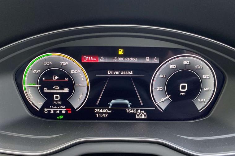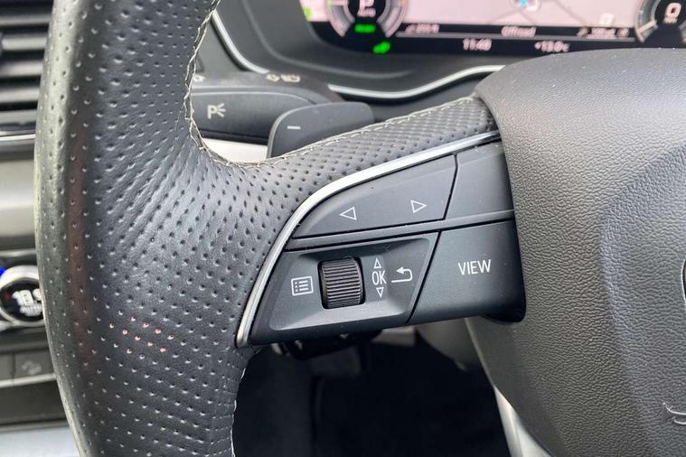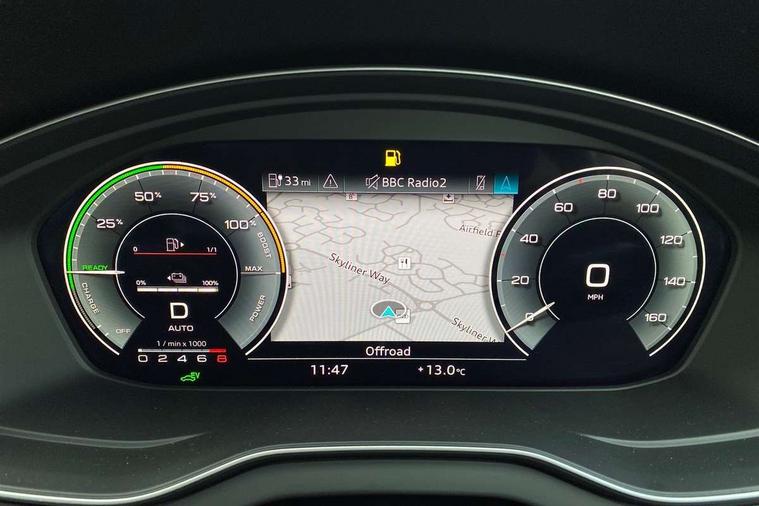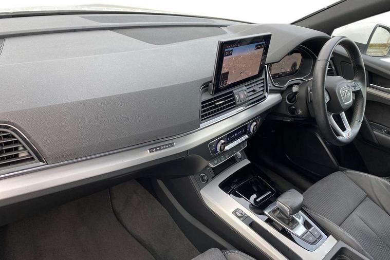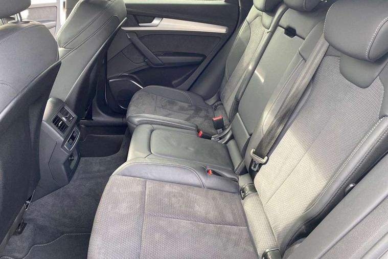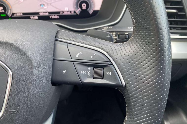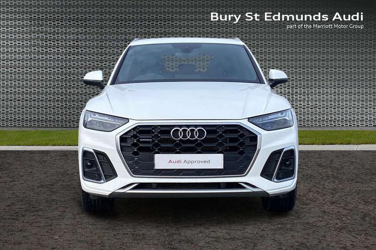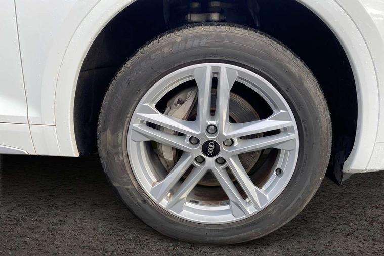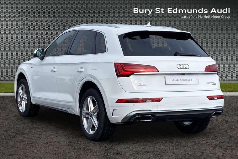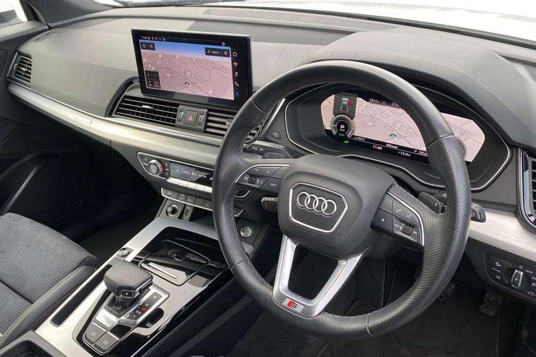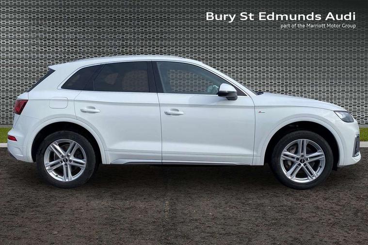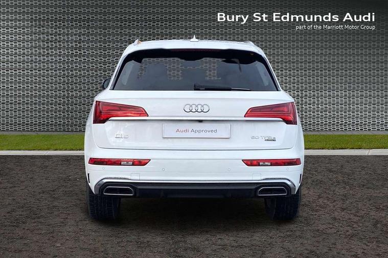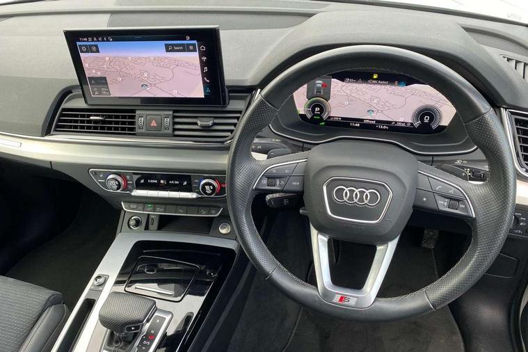Audi connect safety and service (e-call), Audi connect with Amazon Alexa Integration, Audi drive select, Audi virtual cockpit plus with 12.3" screen and three different layout designs, Audi wireless smartphone interface, Automatic start-stop system with coasting functionality and efficiency programme, Bluetooth interface, Electro - mechanical power assisted steering, MMI navigation plus with 10.1" touch screen, Power tailgate, Reversing camera, Service interval indicator, Voice control system with Audi hotword activation "Hey Audi", 3 pin 10 amp domestic charging cable, Dynamic suspension, Quattro on demand, Type 2 mode 3 22kW 32 amp charging cable, Type 2 socket for AC charging, 2 x USB charging port with aux input socket, DAB Digital radio, Acoustic windscreen, Aluminium roof rails, Audi matrix LED headlights with dynamic front and rear indicators, Auto dimming rear view mirror, Automatic headlights and windscreen wipers, Body colour bumpers, Body colour door mirrors, Body colour rear diffuser with matt aluminium silver surrounds, Body colour underbody protection, Chrome plated exhaust trims, Door sills in Selenite silver, Electric adjustable/heated/folding door mirrors, Front air inlet surrounds in aluminium, Front and rear electric windows, Front radiator grille in honeycomb design, Headlight washers, Lower bumpers painted in contrast Manhattan grey, Rear chrome trim strip below lights, Rear privacy glass and rear side windows, Rear spoiler, Rear wiper, Roof bars, S Line badges on the front wings, S Line front and rear bumpers, S Line side skirts, 3 rear headrests, 40:20:40 split folding rear seat with rear centre armrest, Black cloth headlining, Comfort front centre armrest, Contrast stitching on seats, steering wheel and gear lever gaiter, Deluxe 3 zone electronic climate control, Front/rear floor mats, Gear lever in black leather, Heated front seats, Height adjustable front head restraints, Height/reach adjustable steering column, Illuminated door sill trims with S logo, ISOFIX child seat mounting and top tether, Manual seat adjustment with 4-way electric lumbar support, Rear seat bench plus, Sunvisors with vanity mirrors, Trunk roller cover, High gloss pack - Q5, LED interior light pack - Q5, 3 point seatbelts on all seats, 6 airbags - Driver, front passenger, curtain and side airbags, Electrically operated child locks on rear doors, Electromechanical parking brake, Electronic stabilisation control including ABS, ASR and EDL, Front passenger airbag deactivation, Hill descent control, Hill hold assist, Multi collision brake assist, Pop-up bonnet for pedestrian protection, Pre sense city, Seat belt force limiter, Seatbelt monitoring, Tyre pressure warning, Warning triangle and first aid kit, Anti theft alarm, Anti-theft wheel bolts, Keyless Go access/ignition system, Matt brushed aluminium inlays, Tool kit, Tyre repair kit,
