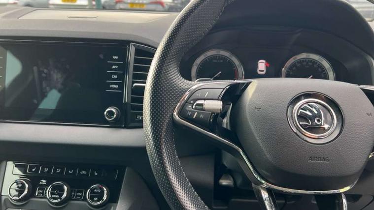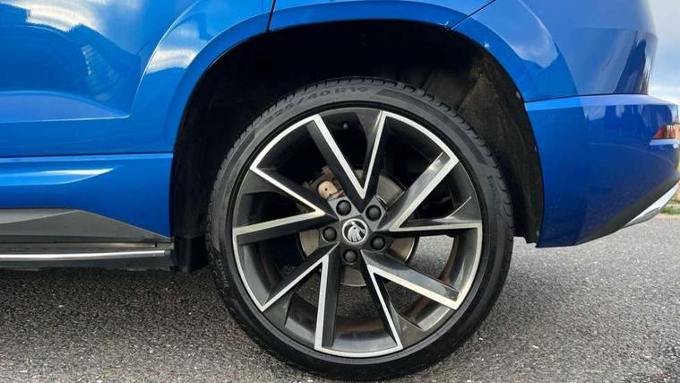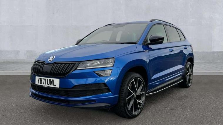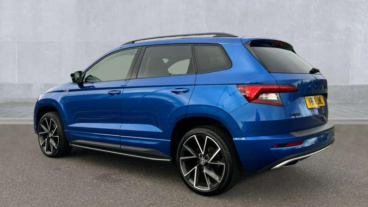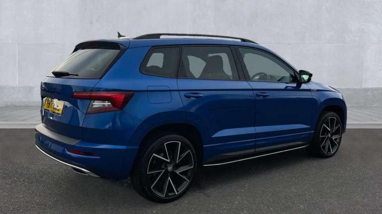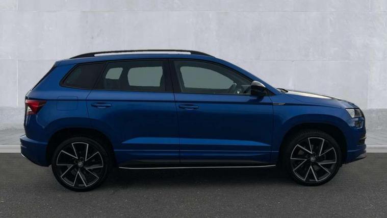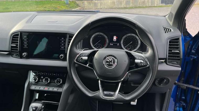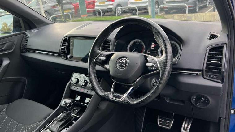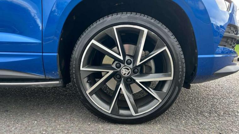 Care connect, Drive mode selector, Driver fatigue sensor, Multifunction colour trip computer, Outside temperature gauge, Service interval indicator, SmartLink wireless for Apple and wired for Android, Start/stop system with regenerative braking, USB C Port x 2 in front centre console, DAB radio with Bluetooth, USB connection, Wireless charging without wireless aerial connection, Acoustic glass, Aero front windscreen wipers with intermittent function, Automatic headlight control system, Black door mirrors, Black electric window control buttons, Black radiator grille, Black roof rails, Body colour door handles, Body coloured bumpers, Electric front and rear windows with child proof lock, Front door steps with SportLine logo, Full LED headlights + adaptive front light system + LED daytime running lights and front cornering fog lights, Headlight washers, Heated rear windscreen, LED rear lights with high functionality, Light assistant (coming/leaving home/tunnel light), Panoramic sliding sunroof, Privacy glass, Protective door side sills in body colour, Rear diffuser, Safety reflectors on front doors, Skoda lettering on tailgate in black, Sportline badge on front fender, Sportline decorative inserts with badging, Sports front and rear bumpers, Third brake light, 1.5 litre bottle holders in driver and front passenger door panels, 12V socket in boot, 12v socket in front centre armrest with storage compartment and rear air vents, 2 Folding hooks and nets in boot, 2 Front readings lights for driver and passenger, 3 rear height adjustable headrests, 4 foldable roof handles with rear coat hooks, Aluminium pedals, Black roof headlining, Cargo elements in boot, Chrome inner door handles, Door sill scuff plates, Driver and passenger seats height adjust, Front head restraints, Height adjustable front three point seats belts with tensioners, Height/reach adjust steering wheel, Ice scraper, Illuminated and cooled glovebox, Illuminated luggage compartment, Isofix child seat preparation outer rear, Manual lumbar support for front seats, Net programme in boot, Pen holder, Pollen filter, Rear reading lights, Rear seats fixed folding and divided 60:40, Retractable parcel shelf attachable to tailgate, Safety vest holder, Solid rear boot cover, Storage box in upper central dashboard closed, Storage compartment below the passenger seat, Sunvisors with illuminated vanity mirrors, Textile floor mats, Umbrella under passenger seat, Welcome animation with sportline logo, LED Interior lighting pack with Skoda welcome logo - Karoq, Airbags - Front side, head, knee and curtain, Automatic door unlocking in case of crash, Automatic fuel cut off in case of crash, Driver airbag, Electronic parking brake with auto hold function, Emergency rear braking signal, ESC including ABS, MSR, ASR, EDS, HBA, DSR, RBS, MKB and traction control, Front assist radar scanning of the space in front of the car with automatic braking, Hill hold control, Passenger airbag with switch-off function, Pedestrian monitor, Seatbelt reminder signalisation and pretensioner for all seats, Three point seatbelts rear, Two tone horn, Tyre pressure display, Tyre pressure monitor, Alarm with interior monitoring, back up horn and tilt sensor with safe function, Electronic engine immobiliser, Keyless entry and keyless start with safe system, Remote central locking with 2 remote folding keys, Black air vent surround, 19" Vega anthracite alloy wheels, Anti-theft wheel bolts protection, Storage on wheel cover,