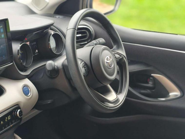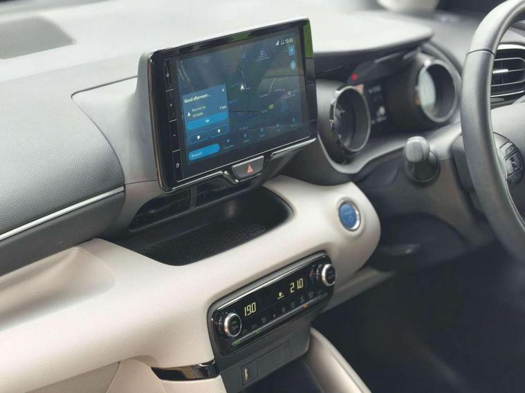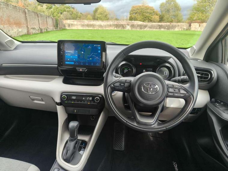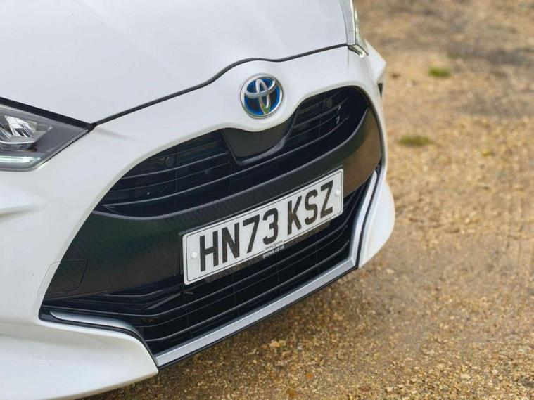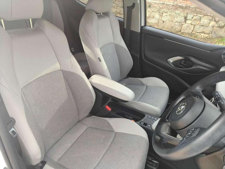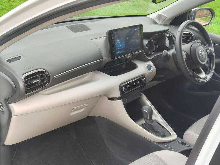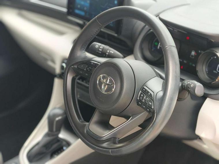 Adaptive cruise control, Adjustable speed limit with speed warning, Blind spot monitoring, Bluetooth connectivity, Colour binocular inspired displays with digital speedometer, E-call, Electric power steering, Hybrid energy display, Multi information display switches on steering wheel, Reversing camera, Smartphone integration with Apple CarPlay and Android auto, Tailgate, Touch 2 navigation system, Voice recognition, Vehicle Stability Control (VSC), 6 speakers, 9" HD multimedia display touch screen with Toyota smart connect, USB connection, Acoustic windscreen glass, Auto windscreen wipers, Automatic headlights, Automatically retractable door mirrors, Body coloured door mirrors, Electric adjustable heated door mirrors, Follow me home headlights, Front auto power windows with anti jam protection, Full LED rear lights, LED daytime running lights, LED front fog lights, LED front light guide, LED Headlights, LED High mounted stop lamp, LED Indicators, LED rear light guide, Manual headlight levelling, Painted chequered front grille, Rain sensor, Rear auto power windows with anti jam protection, Rear privacy glass, Rear side wing doors, Rear spoiler, Rear wiper, Satin lower front grille, Shark fin antenna, Turning signal integrated indicators in door mirrors, Variable front intermittent wipers, 3 adjustable rear headrests, 3 seat bench in 2nd row, 3 spoke leather steering wheel, 60/40 split folding rear seat, Active headrests, Adjustable boot height, Coat hooks in rear grab handles, Cup holders (2 front & door), Data Communication Module (DCM) connected services, Dual zone automatic air conditioning, Fabric seat with partial synthetic leather upholstery, Front armrest, Front sport seats, Glovebox, Grey roof lining, Height adjustable driver's seat, Height adjustable passenger seat, Isofix seat fixing, Leather gearshift, Map pockets on the backs of the front seats, Pollen filter, Shopping bag hooks, Single front passenger seat, Tilt/telescopic steering column, Parking pack - Yaris, 3 point seatbelts on all rear seats, ABS+EBD+Brake assist, Electronic parking brake, Emergency brake light system (EBS), Front passenger airbag on/off switch, Front seatbelt reminder, Hill start assist control (HAC), Rear child proof door locks, Rear seat belt reminder, Supplemental Restraint System (SRS) 8 airbags: Driver & passenger's airbags, dual side curtain airbags, side impact airbags, front centre airbag, Toyota Safety Sense 2, Precollison + Night time Pedestrian & Cyclist Detection, Lane Trace Assist, Auto High Beam, Intelligent ACC & Road Sign Assist, Tyre pressure warning system, 2x Master key, Alarm/immobiliser, Keyless smart entry with push button start, Remote AC via MyT, Remote locking via MyT, Remote powered central double locking doors, Satin chrome interior styling, Soft touch instrument panel, Space saver spare wheel,