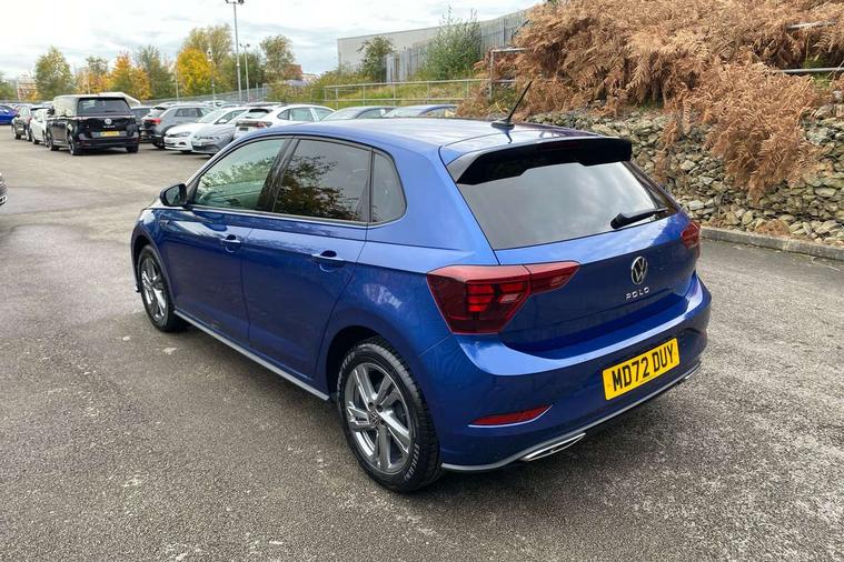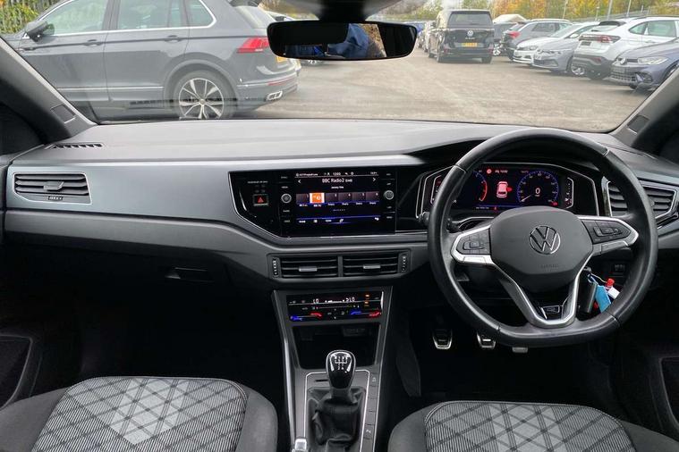 Adaptive cruise control without follow-to-stop and speed limiter, Bluetooth mobile phone interface, Digital Cockpit Pro with 10.25" Display, Driver alert system, Dynamic road sign display, Emergency call service, Power assisted speed sensitive steering, Preparation for We connect and We connect plus, Speedo and rev counter, electronic odometer, trip, service interval display and fuel gauge, Standard rear axle, Travel Assist - Lane keeping system and traffic jam assist, Travel assist including emergency assist, Trip computer, Warning signal and warning light for front and rear seatbelts not fastened, Washer fluid level indicator, Wireless app connect, Front wheel drive, Rear shock absorpion, Start-stop system with battery regeneration (recuperation - energy recovery during braking), DAB Digital radio, Diversity antenna for FM reception, Front and rear 6 speakers, Body colour bumpers, Body colour door handles, Electric front windows, Front scuff plates with R-Line logo, Heat insulating darkened glass in side and rear windows, Heat insulating glass windscreen, Power folding adjustable/heated exterior mirrors and front passenger exterior mirror lowering function, Rear electric windows, Rear fog light, Rear side wing doors, Rear windscreen washer and wiper with interval delay, Third brake light, 12V power socket in centre console, 2 USB-C ports in the front, 2 USB-C charging sockets on the center console in the rear, 3 rear head restraints, 60/40 split folding rear seat and rear seat bench not split, Air care climatronic air conditoning system with active combination filter and 2-zone temperature control, Black roof lining, Chrome plated radiator grille inserts, air vent surrounds and light switch surrounds, Door and side trim panel, Driver and front passenger seat height adjustment, Driver/passenger sunvisors with illuminated vanity mirrors, Front + rear carpet mats in recycled material, Front centre armrest, Front footwell illumination, Front seat backrest storage pockets, Front sports comfort seats, Handbrake lever handle in leather, Headliner in recycled material, Isofix child seat preparation easy-fit (for two outer rear seats, and front passenger seat) compatible with I-size, Karoso artvelours cloth upholstery, Leather trimmed gear knob, LED interior light with switch off delay and dimmer, 2 reading lights front and rear, Luggage compartment cover, Luggage compartment floor, Luggage compartment lighting, Lumbar adjustment for front seats, Multifunction steering wheel, Single front passenger seat, Stainless steel pedals, Standard pedal cluster, Light and sight pack - Polo R-Line/Black Edition, 3 point height adj front seatbelts + pretensioners, 3x3 point rear seatbelts, ABS, Driver and front passenger airbag with front passenger airbag deactivation, Drivers and front passengers safety optimised head restraints, ESC (Electronic stability control) + EDL (Electronic Differntial lock) and ASR (Traction control), Extended and predictive pedestrian/ cyclist protection, Front curtain and side airbags with center airbag, Hill hold control, Manual child lock in rear doors, Single tone horn, Tyre pressure loss indicator, Alarm with interior protection, Anti-theft alarm system with interior monitoring, backup horn, and towing protection, Anti-theft wheel bolts, Electronic engine immobiliser, Chrome applications on rotary light, mirror adjustment, window regulator switches, outlet with frame in black, Dark grey anodised matt decorative inserts in dash and front door panels, Low rolling resistance tyres,