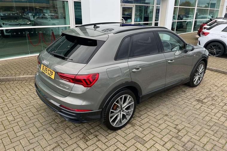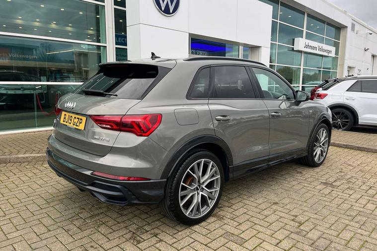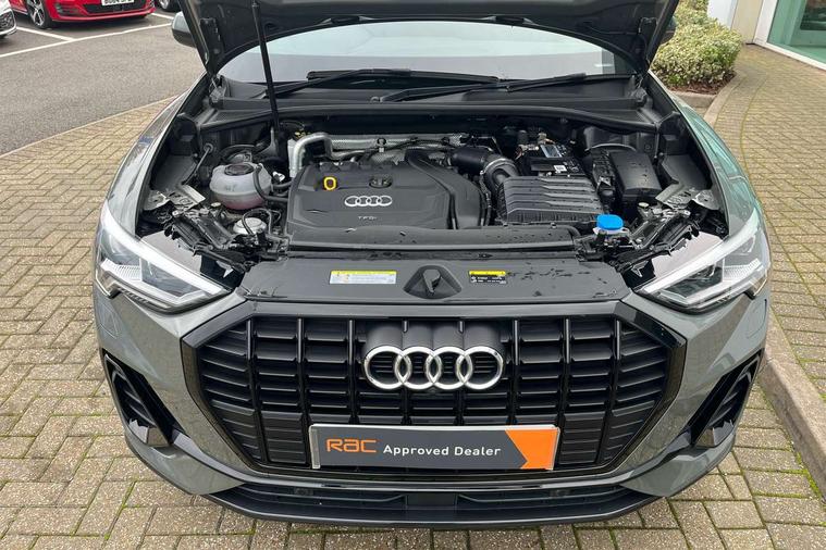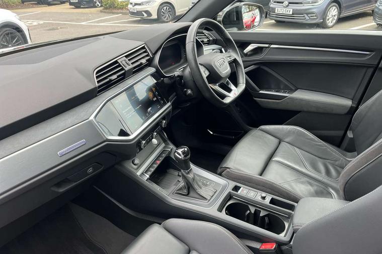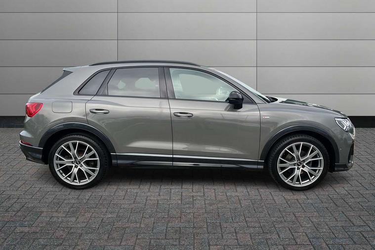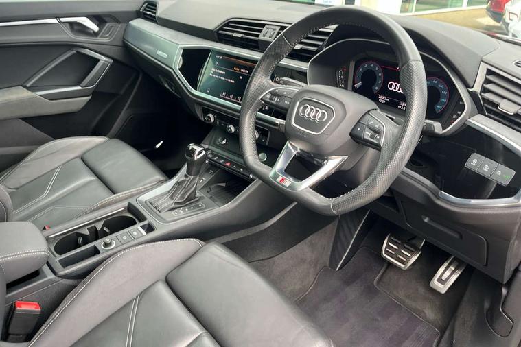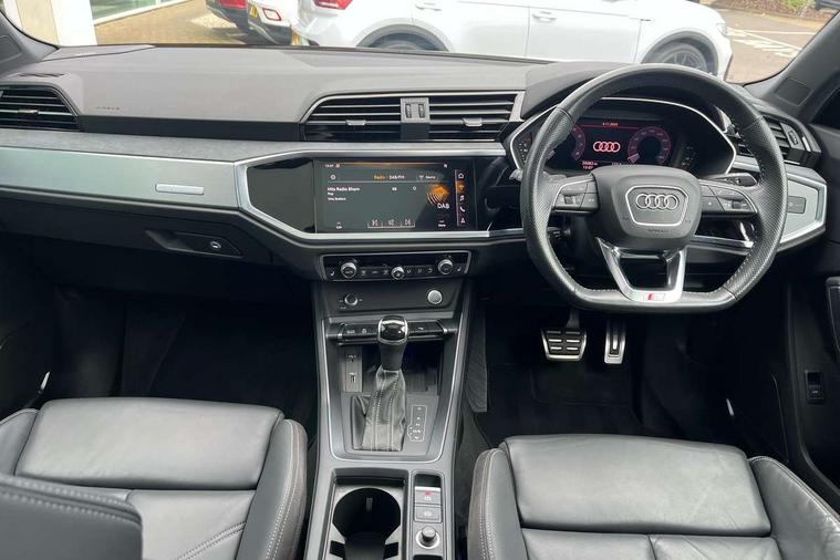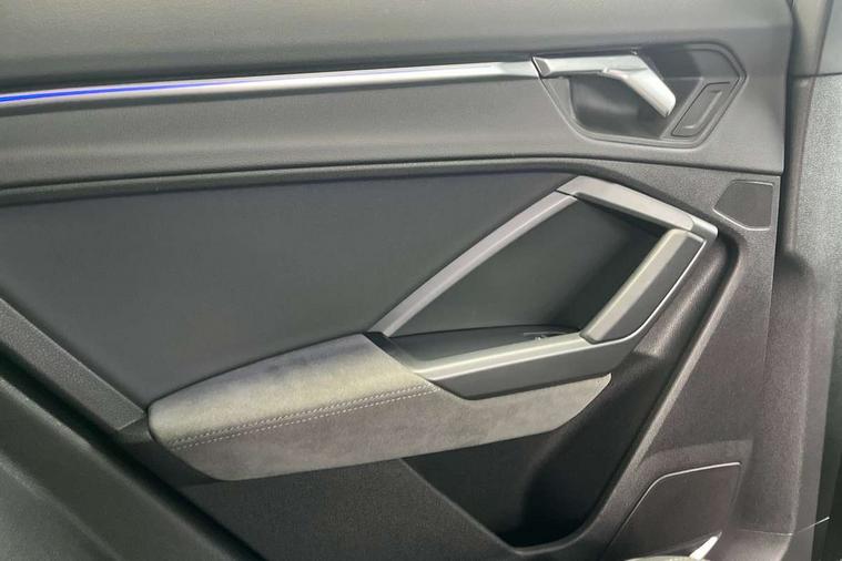 360 degree parking camera, Audi connect safety and service (e-call), Audi drive select, Audi lane departure warning, Audi parking system plus with front and rear sensors, Audi phone box with wireless charging, Audi side assist, Audi smartphone interface, Audi virtual cockpit plus, Bluetooth interface, MMI navigation plus with MMI touch, Power opening/closing tailgate, Progressive steering, Rear cross traffic alert, Service interval indicator, Stop/start system, Voice control system, Adaptive suspension with damping control, Bang & Olufsen 3D Premium Sound System, DAB digital radio module, Acoustic windscreen, Aluminium roof rails, Auto dimming and folding door mirrors, Auto dimming rear view mirror, Black roof rails, Contrast bumpers in Manhattan grey paint finish, Diffuser in matt Platinum grey, Electrically adjustable and heated door mirrors with integrated LED side indicators, Front and rear electric windows, Front fog lights, Front side air inlets in matt platinum grey, Front spoiler blade in matt platinum grey, Front spoiler in matt selenite silver, Grille vertical bars in aluminium silver/Matt, Headlight washers, High gloss black finish B and C pillars, Matrix LED headlights with LED rear lights and dynamic front and rear indicator, Panoramic opening glass sunroof, Privacy glass, Rain and light sensors, Rear diffuser strip in selenite silver, S line bumpers in contrasting Manhattan grey, 12V socket in rear centre console, 3 spoke flat bottomed high multi-function leather sport steering wheel with gearshift paddles, 4 way electric lumbar support for driver and front passenger, 40:20:40 split folding rear bench seat, Adjustable rear seat bench/backrest with centre armrest and cupholder, Aluminium door sill trims, Black cloth headlining, Dual zone climate control, Electrically adjustable front seats, Front and rear black floor mats with contrast stitching in rock grey, Front and rear headrests, Front centre armrest with storage compartment and angle adjustment, Heated front seats, ISOFIX child seat mounting and Top Tether with front passenger airbag deactivation, Perforated leather gearknob, Stainless steel luggage compartment sill finisher, Stainless steel pedals, Black styling pack - Q3, Driver Assistance Pack - Q3, Multi coloured extended ambient interior lighting pack - Q3, Non smoking pack - Q3, 3x3 point rear seatbelts, 6 airbags - Driver, front passenger, curtain and side windows, Audi pre-sense front with pedestrain and cyclist recognition, Electronic stabilisation control including ABS, ASR and EDL, Hill hold assist, Pre sense basic, Seatbelt monitoring, Tyre pressure warning, Warning triangle and first aid kit, Advanced key, Anti theft alarm, Anti theft wheel bolts, Remote central locking, Dark matt brushed aluminium inlay, MMI touch colour display in gloss black with aluminium surround,