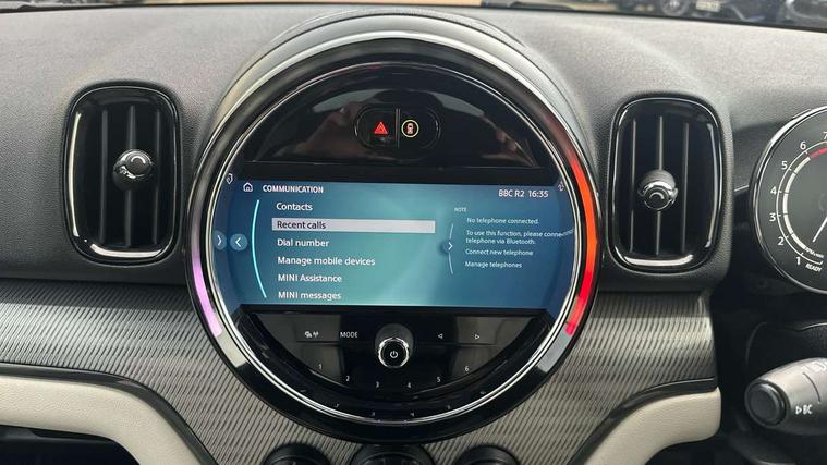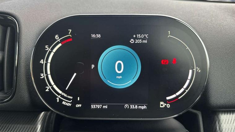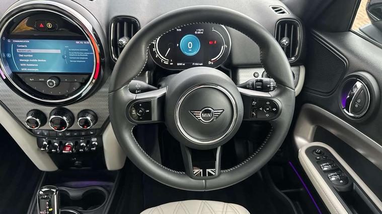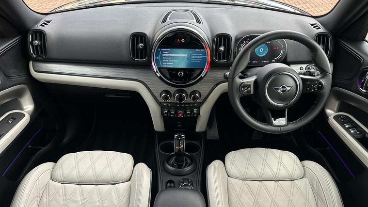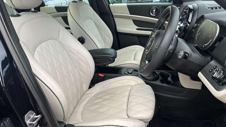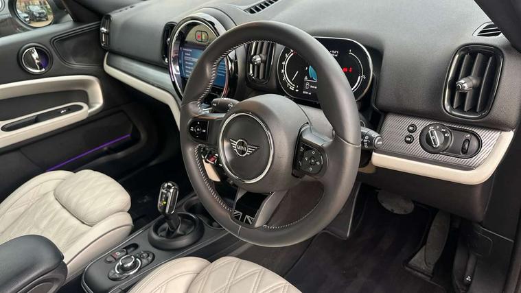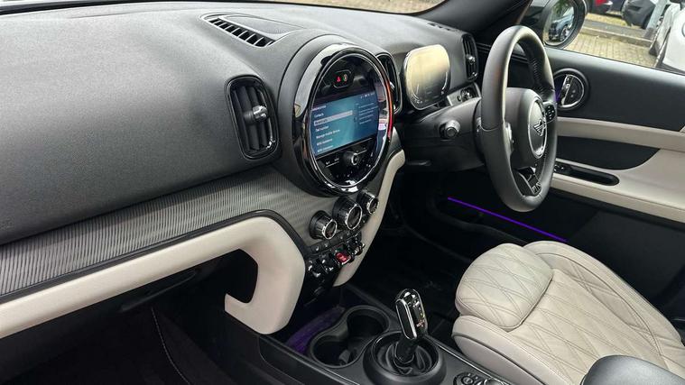 Active Guard incl speed limiting and lane departure functions with auto steering, and front collision warning with brake intervention, Automatic start/stop function with brake energy recuperation, Compatible mobile phone bluetooth with audio streaming, Cruise control with brake assist, Electro-mechanical speed dependant steering assistance, Instrument cluster, MINI Driving Modes - centre toggle switch to control driving setting (sport, mid and green), On board computer, Rear parking distance control, 51 Litre fuel tank, Automatic transmission, Double Vanos system, Fully variable valve control, High precision injection, Performance Control, FM tuner and DAB digital radio, Body colour fuel filler cap, Day time driving lights, Door sill strips, Dynamic brake lights, Electric windows, Heated rear window, Heated windscreen washer jets, LED fog lights, LED Headlights, MINI yours exterior badge in C-Pillar, driver and passenger side, Model logo, Model logo on Tailgate, Rain sensor with auto headlights, Rear fog lights, Rear window wiper, Side scuttle panel with integrated indicator, Split rear doors, Sun/heat protection glass, White indicator lenses, 12V socket in centre console, 360L luggage compartment capacity, 4 lashing eyes in luggage compartment, 40:20:40 split folding rear seats, Anthracite headlining with grab handles and clothes hooks, Chrome interior highlights, Colour line - Carbon black, Cupholders, English handbook, Front headrests, Glove compartment, Height and length steering column adjustment, Interior lighting with 12 basic colours selectable via toggle switch in roof, Isofix rear child seat preparation, Leather gearshift lever and handbrake gaiters, LED reading lights, vanity mirror lights, front foot well light and spotlight on front seats, Manual air conditioning, MINI Yours fine walk nappa leather steering wheel with contrast stitching in silver and MINI Yours badge, MINI Yours floor mats, Multifunction steering wheel, Rear headrests, Storage compartments in doors, Sunvisors with vanity mirrors, Excitement pack - Countryman, Navigation pack - Countryman, 2 tone horn, 3 point seatbelts on all seats, 6 Airbags - front, side, head and seat belt tensioners, Anti-lock braking system (ABS), DSC - Dynamic Stability Control, Electronic handbrake, Front and rear disc brakes, Hill start assist, Tyre pressure monitoring system, Alarm system with tilt sensor, monitoring doors, bonnet interior and tailgate, Auto drive away locking, Deadlocking function, Electronic vehicle immobiliser, Locking wheel bolts, Start/stop toggle with keyless go, Tool kit,