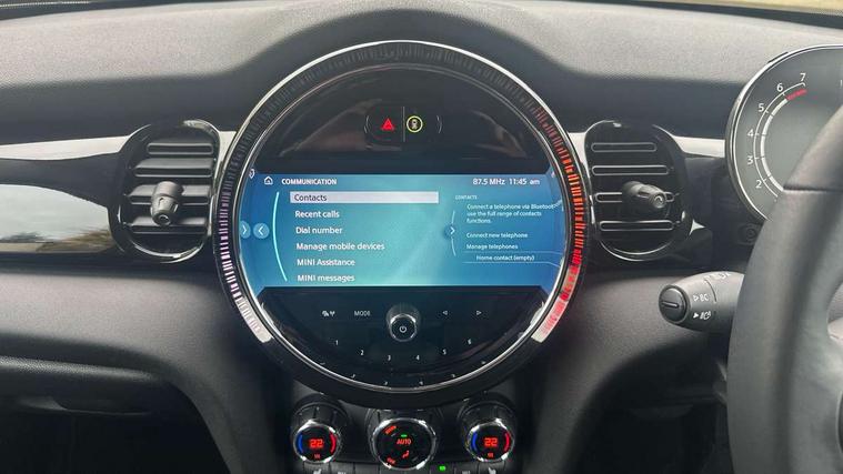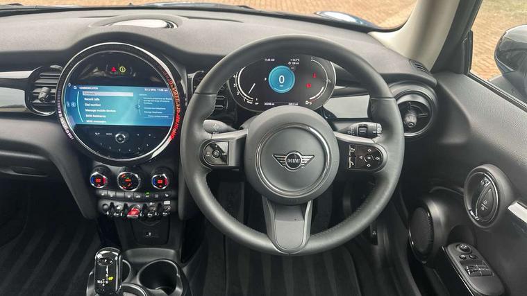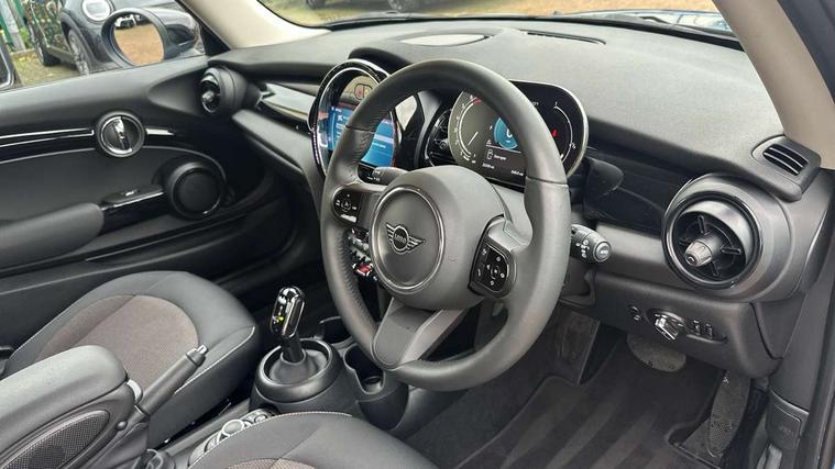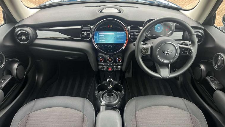 Apple CarPlay, Automatic start/stop function with brake energy recuperation, Compatible mobile phone bluetooth with audio streaming, Cruise control with brake assist, Electro-mechanical speed dependant steering assistance, Flexible car sharing preparation, Instrument cluster, Mini E-call, MINI TeleServices, On board computer, Service interval indicator, Double Vanos system, Fully variable valve control, High precision injection, Performance Control, Steptronic transmission with double clutch, 8.8" touchscreen with LED ring, FM tuner and DAB digital radio, 3rd brake light, Automatic headlight activation switch, Body colour fuel filler cap, Chrome border high gloss black slats radiator grille, Dynamic brake lights, Electric front windows, Exhaust tailpipe on left with chrome finisher, Heated rear window, Heated windscreen washer jets, LED headlight with closed ring and daytime driving lights, Metal door sill strips with MINI imprint, Model logo Cooper on right of tailgate, Rain sensor window wipers, Rear fog lights, Rear LED lights with union jack design, Rear window wiper, Side scuttle panel with integrated indicator, Sun/heat protection glass, White indicator lenses, 12V Accessory socket in centre console, 2 seat bench in 2nd row, 4 lashing eyes in luggage compartment, 60/40 split folding rear seat, Ambient lighting, Carbon black colour line - Knee roll and door armrest, Chrome interior highlights, Cupholders, Front and rear head restraints, Front and rear isofix with front passenger airbag deactivation, Front floor mats in velour, Glove compartment, Height and length steering column adjustment, Interior lighting with 12 different colours across the dashboard, underneath door bezel with illuminated laser-engraved design on central display, Leatherette gearshift lever and handbrake gaiters, LED reading lights, vanity mirror lights, front foot well light and spotlight on front seats, Manual air conditioning, Mechanical seat adjustment - forward/back & backrest for front seats and driver seat height adjust, Multifunction steering wheel, Passenger seat height adjuster, Satellite grey headlining including grab handles and clothes hooks, Single front passenger seat, Sport leather steering wheel with speed limiter and audio/communication controls, Storage compartments in doors, Sunvisors with vanity mirrors, 3 point seatbelts on all four seats, 6 Airbags - front, side, head and seat belt tensioners, Anti-lock braking system (ABS), DSC - Dynamic Stability Control, Front and rear disc brakes, Single tone fanfare horn, Tyre pressure monitoring system, Alarm system with tilt sensor, monitoring doors, bonnet interior and tailgate, Electronic vehicle immobiliser, Start/stop toggle with keyless go, Piano black interior trim, Tool kit, Tyre repair kit,