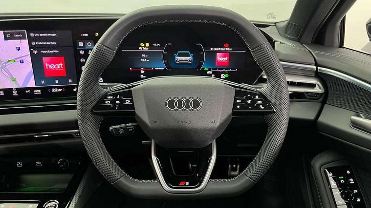 Adaptive cruise control, Advanced driver attention and fatigue montior, Audi application store, Audi assistant, Audi connect emergency call and service, Audi drive select, Audi smartphone interface, Audi virtual cockpit plus with 11.9" OLED colour display, Automatic start/stop system with coasting functionality, Camera based traffic sign recognition, Intersection assist, Lane departure warning, MMI navigation plus with high resolution 14.5" OLED touchscreen colour display, Park assist plus, Parking system plus with 360 display, Progressive steering with servotronic, Rear view camera, Swerve assist and turn assist, Traffic sign based speed limiter, Sports suspension lowered by 20mm, 2 USB-C ports in both the front and rear, Audi sound system impressive sound with 10 loudspeakers including centre speaker and subwoofer, 6-channel amplifier with a total output of 180 watts, DAB digital radio reception, Smartphone compartment with wireless charging, Aluminium roof rails, Aluminium window trims, Auto dimming rear view mirror, Body colour door mirrors, Door mirrors - electrically adjustable, heated, folding and auto dimming on both sides, Front and rear electric windows, Front door sill trims with aluminium inlays, illuminated with 'S' logo, High beam assist, LED headlights Plus incl. digital daytime running lights, turning light, all-weather light, motorway light, manouevring light and intersection light, LED rear lights pro incl. dynamic rear indicators and illuminated light strip with animated coming and leaving home function, LED third brake light, Privacy glass, Rear and side windows with heat insulating glass, Rear side wing doors, Rear wash/wipe, S Line badges on the front wings, S line bumpers, radiator grille and diffuser in phantom black and diffuser insert in matt anthracite, White rhombus logo projection light in exterior mirrors, Windscreen with acoustic glazing, 3 rear headrests, 3 seat rear bench, 3 spoke leather steering wheel with multi-function buttons with touch control, flattened on top and bottom, with S badging and contrast stitching, 3-zone automatic climate control, 40:20:40 split folding rear seat bench with centre armrest and cup holders, Comfort front centre armrest, Front and rear floor mats, Front seats with manual adjustment for position and 4-way electric lumbar support, Front sport seats with integrated headrest and S embossed logo, Headlining in black cloth, Heated front seats, i-Size child seat mounting on the front passenger side and outer rear seats, i-Size and top tether on the outer rear seats, Luggage compartment lid, electrically opening and closing, Manual steering column height and depth adjustment, Single front passenger seat, Stainless steel pedals and footrest, Steering wheel grips in perforated leather and shift paddles, Ambient lighting package plus - A5, 3x3 point rear seat belts, Driver airbag, Electric child safety locks, First aid kit with warning triangle and vests, Front emergency brake assist, Front passenger airbag, Front passenger airbag deactivation, Front side airbags with head airbag system and front interaction airbag, Hill hold assist, Seat belt monitoring with rear seat occupant reminder, Tyre pressure loss indicator, Anti theft alarm, Anti-theft wheel bolts, Keyless Go, Accent surfaces and control buttons in gloss black, Black dashboard with contrast stitching, Inlays in matt brushed aluminium with linear embossing, anthracite, Softwrap in leatherette with contrast stitching, Upper and lower interior elements in leatherette, Tyre repair kit,
