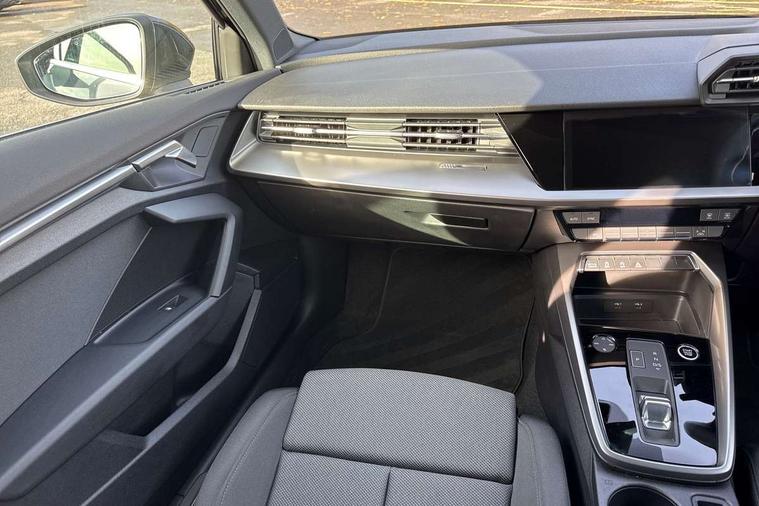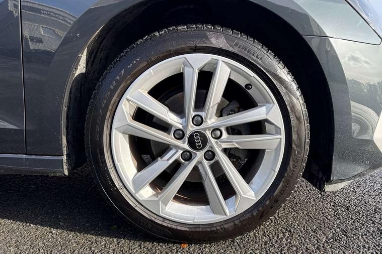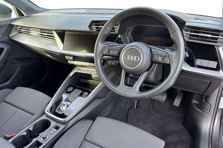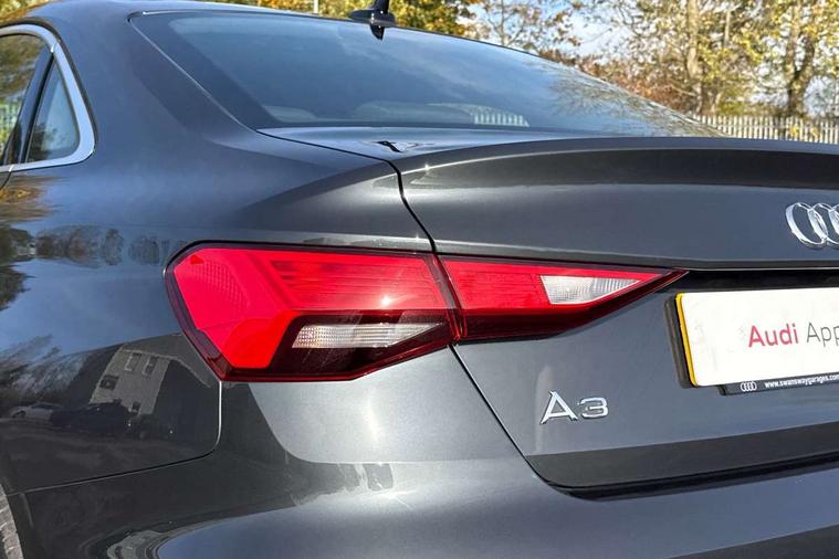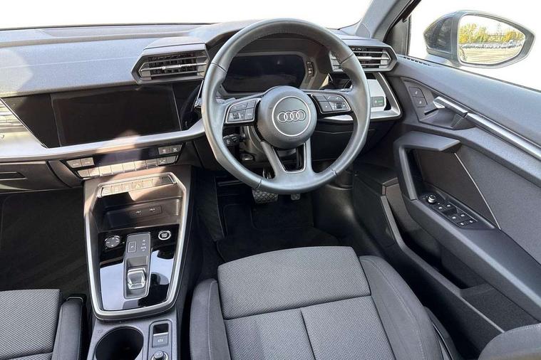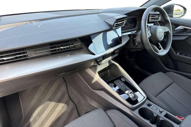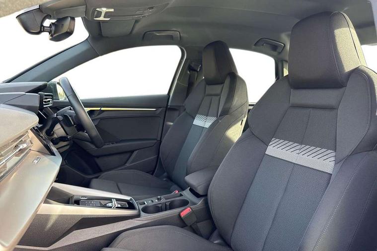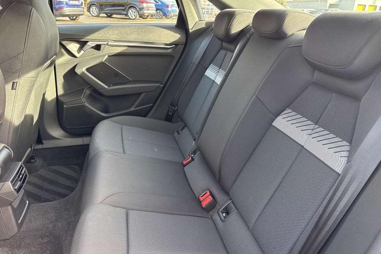 Audi drive select (Auto, Comfort, Dynamic and Individual), Audi smartphone interface, Audi Virtual Cockpit - 10.25" digital and colour instrument cluster, Automatic start/stop system with recuperation, Bluetooth interface, Camera based traffic sign recognition, Collision avoidance assistant, e-Call (emergency call), Electromechanical power speed sensitive steering, Lane departure warning system, MMI Navigation Plus with high resolution 10.1" colour touch screen display, Service indicator, Trip computer, Voice control system with natural language interaction, Standard suspension, 2xUSB-C connection with data and charging functions, 6 passive loudspeakers, CD player, DAB Digital radio, 3rd brake light, Acoustic glass windscreen, Aluminium window trim, Auto dimming frameless rear view mirror, Body colour exterior mirrors, Body colour roof spoiler, Electrically adjustable/heated/folding/auto dimming door mirrors with integrated LED indications + kerb view function for passenger side, Front electric windows, LED daytime running lights, LED headlights and halogen rear lights, Light and rain sensors, Model and engine designation badges at rear, Rear boot, Rear electric windows, Rear side wing doors, Rear window, rear door windows and rear side windows in clear glass, 12V socket and storage compartment in front centre console, 3 seat bench in 2nd row, 3 spoke leather multifunction steering wheel with gear shift paddles, 4 way electrically adjustable lumbar support for driver and front passenger, 60/40 split folding rear seat bench, Dual zone electronic climate control, Front and rear headrests, Front centre armrest, Front door sill trims with aluminium inlay, Front/rear floor mats, Height and reach adjustable steering wheel, Interior lighting - Front and rear roof module including reading lights, glove compartment light and right hand side, Interior lighting - glove compartment light and right hand side, Luggage compartment floor covering, Manual boot compartment lid, Manually adjustable front seats, Routine cloth upholstery with front sports seats, Seat side bolsters, Single front passenger seat, Steel grey cloth headlining, Aluminium interior elements pack - A3, LED interior lighting pack - A3 Saloon, Sport styling pack - A3 Saloon, 3x3 point rear seat belts, Driver and front passenger airbag with passenger airbag deactivation, Electronic Stabilisation Control (ESC) including ABS, ASR and EDL, First aid kit with warning triangle and 2 safety vests, Front side airbags with head airbags and interaction airbag, Pre-sense front with pedestrian and cyclist detection, Seatbelt monitoring, Tyre pressure loss indicator, Anti theft alarm, Anti-theft wheel bolts, Electronically operated child locks, Immobiliser, Remote control central locking, Aluminium air vent surrounds, Inlays with silk effect paint in platinum grey,