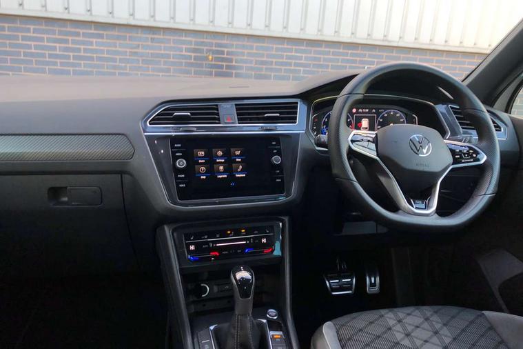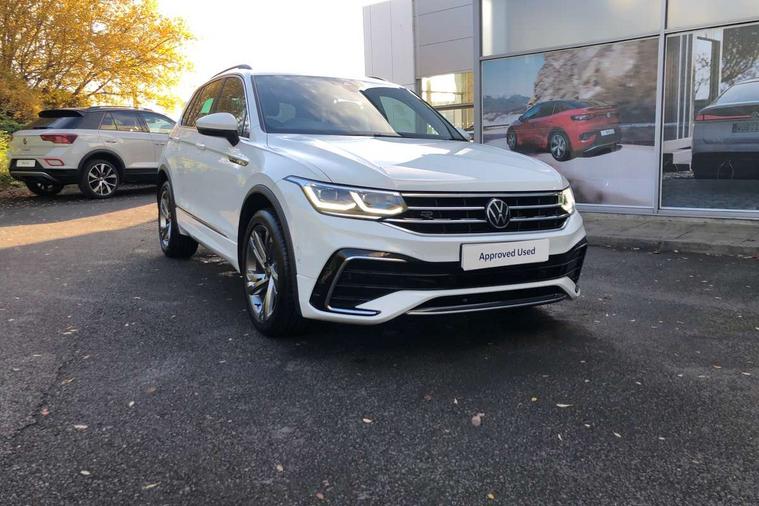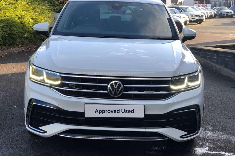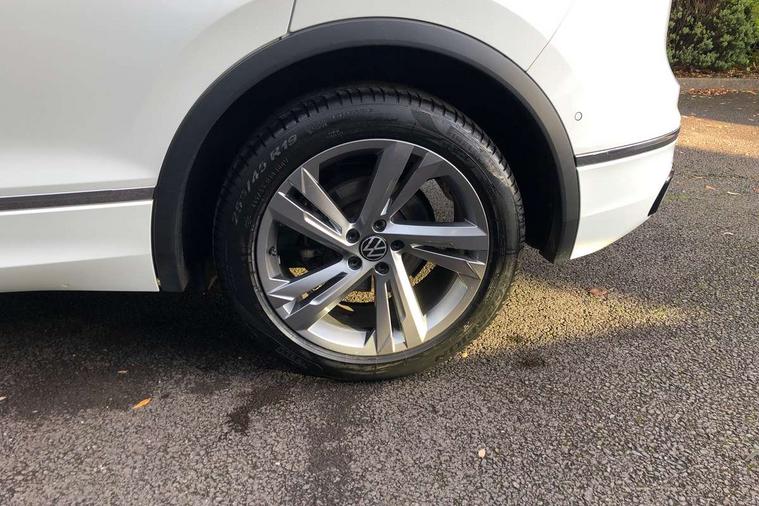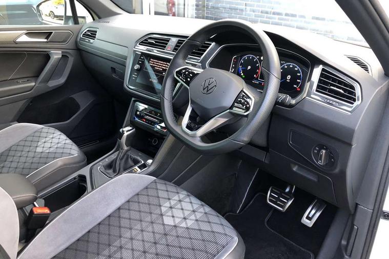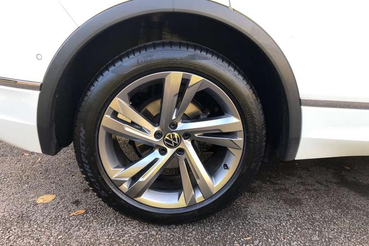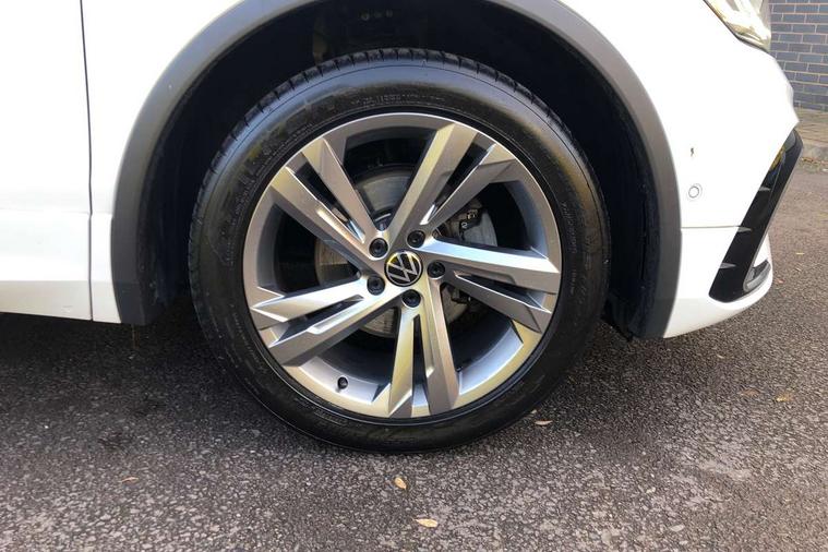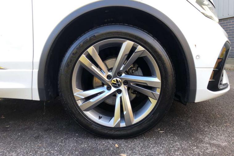 Adaptive cruise control ACC stop and go including speed limiter, App-Connect incl. App-Connect Wireless for Apple CarPlay and Android Auto, Bluetooth phone integration system, Comfort drive travel assist, Digital cockpit pro, Driver alert system, Driver profile selection, Dynamic road sign display, eCall emergency call system, Electromechanical speed sensitive power steering, Emergency assist, Front and rear parking distance sensors, Instrument cluster mph speedometer Great Britain, Lane keeping system Lane Assist, Lights on warning, Multifunction front facing camera, Outside temperature display, Premium multifunction display with multi colour display, Preparation for subsequent activation Navigation feature Discover Media includes Streaming and Internet, Remote control boot opening, Rev counter, Service interval indicator, Speed limit display, Start/stop system with regenerative braking, Tailgate/trunk lid unlocking from outside, Trip computer, Warning sound and light for doors and tailgate open, Battery regeneration during braking, Sports suspension, 8 Speakers, Digital radio reception DAB+, Diversity antenna for FM reception, Radio, Auto dimming interior rear view mirror, Automatic headlight control system, Body colored bumpers in R-Line style, Body colored exterior mirror housings, Body colour door handles, Chrome moldings on the side windows, Coming/leaving home lighting function, Dynamic headlight range control, Front and rear electric windows, Heated rear window, High level 3rd brake light, Laminated safety glass windshield, heat and sound insulating, LED headlamps with LED separate daytime running light and dynamic cornering light, LED rear combination lamps, LED rear number plate lights, License plate carrier in front and rear, Poor weather light and cornering light, Power adjustable, folding and heated door mirrors with surround lighting, front passenger exterior mirror lowering function, Privacy glass for rear side windows and rear window, R Line body kit, R Line side sills, Rain sensor, Rear exhaust tailpipe, Rear fog lamp, Rear side wing doors, Rear spoiler in R style, Rear windscreen washer and wiper with interval delay, Side and rear windows in heat insulating glass, Trailer Stability Programme, Unique R Line badging, Windscreen wipers/ intermittent wipe + 4 position delay, 12V outlet in center console rear and in luggage compartment, 12V outlet in front and tray, 2 LED front reading lights, 2 LED rear reading lights, 3 bench rear seats in 2nd row, 3 rear headrests, Air Care Climatronic 3 zone automatic climate control with enhanced air filter and controls in the rear, Art Velours greyson sports cloth upholstery, Backrest release for left front seat, Black headlining, Brushed stainless steel pedals and footrest, Carpet mats in front and rear with decorative stitching in Gray, Climate control unit rear with touch function, Door and side trim panel in foam film, insert in leatherette, Driver + front passenger lumbar support, Front footwell illumination, Front scuff plates in aluminum with R-Line logo, Front seats head restraints (x-adjustment), Height adjustable front seats, Height/reach adjust steering wheel, Isofix Preparation 2 Rear child seats, Leather gear knob, Rear bench seat asymetrically split folding, longitudinally movable and folding with load-through hatch and center armrest, Remote unlocking for rear seat backrest, Single front passenger seat, Sun visors with illuminated vanity mirrors, Top front comfort seats, Winter pack - Tiguan, 3 point seat belt for centre rear seats, 3 point seat belts with seat belt pretensioners for the outer rear seats, Curtain airbags for front and rear passengers, Driver/Front Passenger airbags, Drivers knee airbag, Electronic parking brake with auto hold, Electronic Stability Control with driver steering recommendation, ABS, ASR, EDL, EDTC and trailer stabilization, Front assist with autonomous emergency braking (for Adaptive Cruise Control ACC up to 130 mph), Front disc brakes, Front passenger airbag deactivation, Front side airbags, Height adjustable front 3 point seatbelts + pretensioners, Manual child proof rear door locks, Pedestrian monitoring system, Proactive passenger protection system in combination with front assist, Rear disc brakes, Two tone horn, Tyre pressure loss indicator, Warning sound and light for front seat belts if unfastened, Warning triangle, Anti theft alarm system with interior monitoring, backup horn and towing protection, Anti theft wheel bolts, Electronic engine immobiliser, Keyless locking and starting system keyless access with safelock, Chrome elements on the mirror switch power window switches and door pulls, Decorative inserts Carbon Gray for dashboard and front door trim panels, Interior door handle in matte chrome, 19" Valencia alloy wheels with AirStop tyres, Tool kit, Tyre mobility kit Includes 12V compressor and tyre sealant,