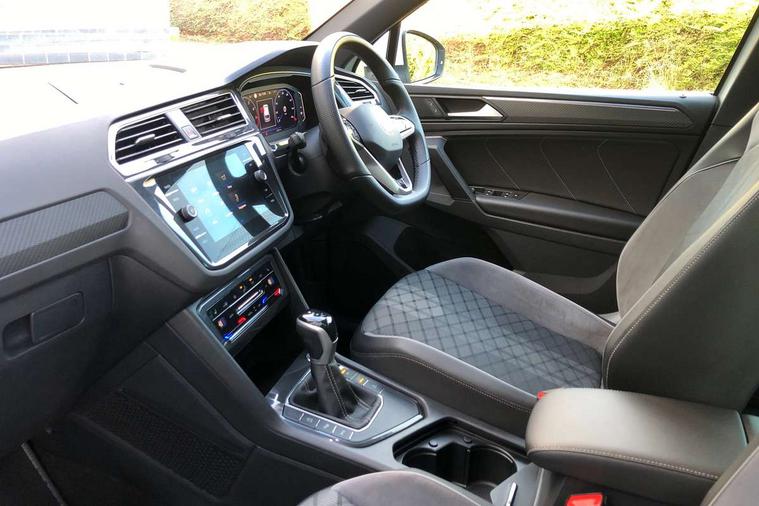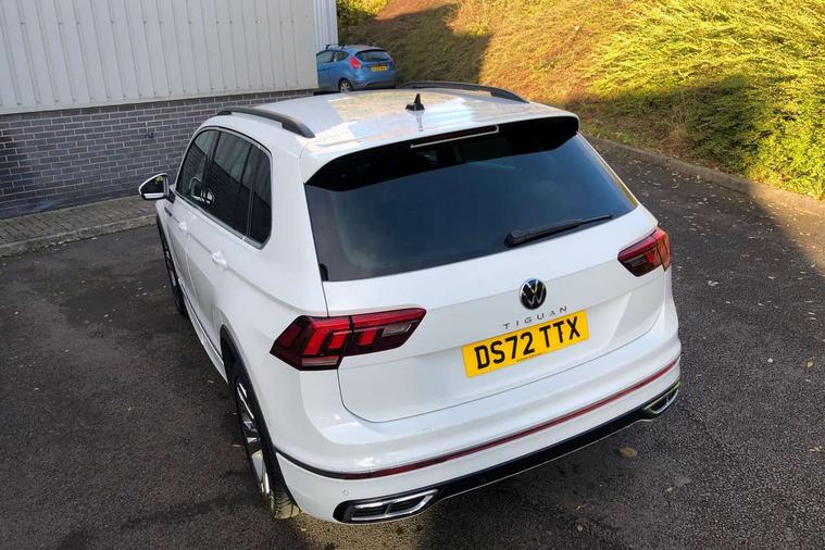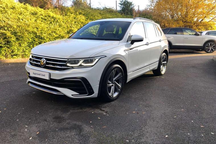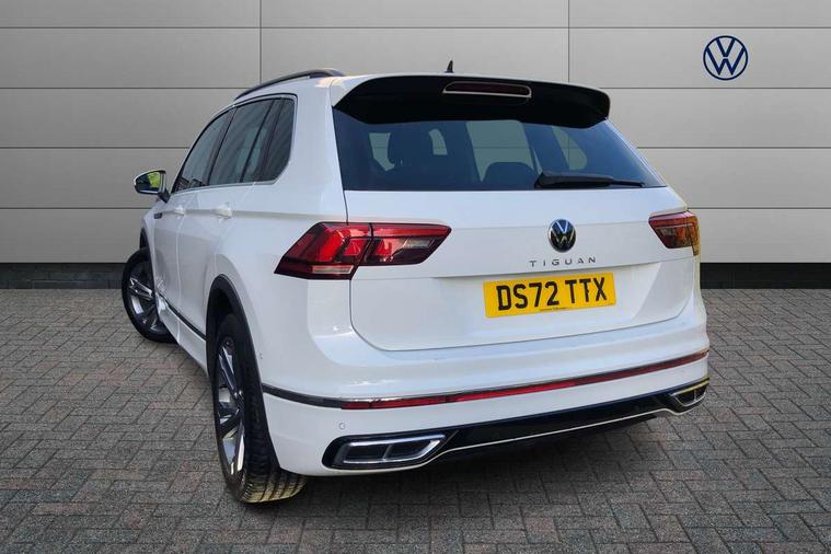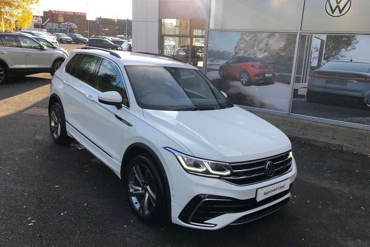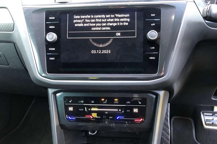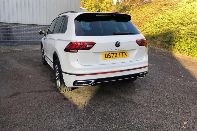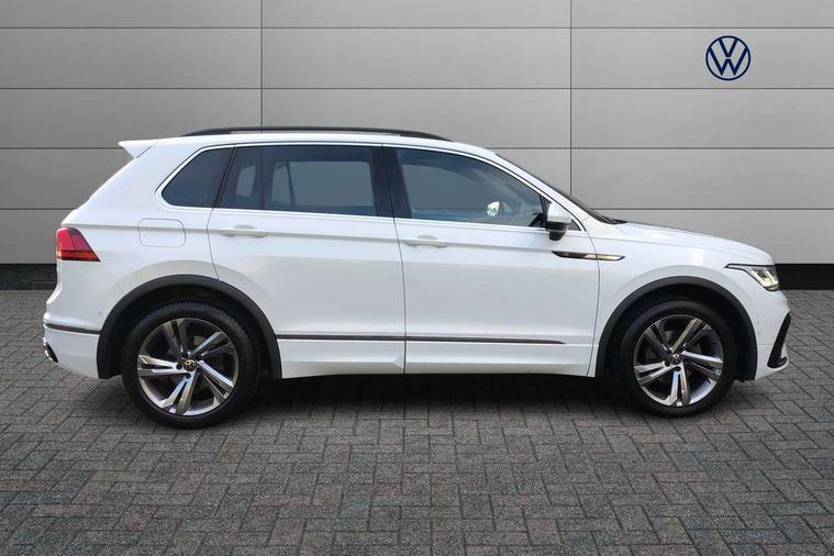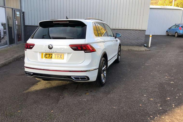 Adaptive cruise control ACC stop and go including speed limiter, App-Connect incl. App-Connect Wireless for Apple CarPlay and Android Auto, Bluetooth phone integration system, Comfort drive travel assist, Digital cockpit pro, Driver alert system, Driver profile selection, Dynamic road sign display, eCall emergency call system, Electromechanical speed sensitive power steering, Emergency assist, Front and rear parking distance sensors, Instrument cluster mph speedometer Great Britain, Lane keeping system Lane Assist, Lights on warning, Multifunction front facing camera, Outside temperature display, Premium multifunction display with multi colour display, Preparation for subsequent activation Navigation feature Discover Media includes Streaming and Internet, Remote control boot opening, Rev counter, Service interval indicator, Speed limit display, Start/stop system with regenerative braking, Tailgate/trunk lid unlocking from outside, Trip computer, Warning sound and light for doors and tailgate open, Battery regeneration during braking, Sports suspension, 8 Speakers, Digital radio reception DAB+, Diversity antenna for FM reception, Radio, Auto dimming interior rear view mirror, Automatic headlight control system, Body colored bumpers in R-Line style, Body colored exterior mirror housings, Body colour door handles, Chrome moldings on the side windows, Coming/leaving home lighting function, Dynamic headlight range control, Front and rear electric windows, Heated rear window, High level 3rd brake light, Laminated safety glass windshield, heat and sound insulating, LED headlamps with LED separate daytime running light and dynamic cornering light, LED rear combination lamps, LED rear number plate lights, License plate carrier in front and rear, Poor weather light and cornering light, Power adjustable, folding and heated door mirrors with surround lighting, front passenger exterior mirror lowering function, Privacy glass for rear side windows and rear window, R Line body kit, R Line side sills, Rain sensor, Rear exhaust tailpipe, Rear fog lamp, Rear side wing doors, Rear spoiler in R style, Rear windscreen washer and wiper with interval delay, Side and rear windows in heat insulating glass, Trailer Stability Programme, Unique R Line badging, Windscreen wipers/ intermittent wipe + 4 position delay, 12V outlet in center console rear and in luggage compartment, 12V outlet in front and tray, 2 LED front reading lights, 2 LED rear reading lights, 3 bench rear seats in 2nd row, 3 rear headrests, Air Care Climatronic 3 zone automatic climate control with enhanced air filter and controls in the rear, Art Velours greyson sports cloth upholstery, Backrest release for left front seat, Black headlining, Brushed stainless steel pedals and footrest, Carpet mats in front and rear with decorative stitching in Gray, Climate control unit rear with touch function, Door and side trim panel in foam film, insert in leatherette, Driver + front passenger lumbar support, Front footwell illumination, Front scuff plates in aluminum with R-Line logo, Front seats head restraints (x-adjustment), Height adjustable front seats, Height/reach adjust steering wheel, Isofix Preparation 2 Rear child seats, Leather gear knob, Rear bench seat asymetrically split folding, longitudinally movable and folding with load-through hatch and center armrest, Remote unlocking for rear seat backrest, Single front passenger seat, Sun visors with illuminated vanity mirrors, Top front comfort seats, Winter pack - Tiguan, 3 point seat belt for centre rear seats, 3 point seat belts with seat belt pretensioners for the outer rear seats, Curtain airbags for front and rear passengers, Driver/Front Passenger airbags, Drivers knee airbag, Electronic parking brake with auto hold, Electronic Stability Control with driver steering recommendation, ABS, ASR, EDL, EDTC and trailer stabilization, Front assist with autonomous emergency braking (for Adaptive Cruise Control ACC up to 130 mph), Front disc brakes, Front passenger airbag deactivation, Front side airbags, Height adjustable front 3 point seatbelts + pretensioners, Manual child proof rear door locks, Pedestrian monitoring system, Proactive passenger protection system in combination with front assist, Rear disc brakes, Two tone horn, Tyre pressure loss indicator, Warning sound and light for front seat belts if unfastened, Warning triangle, Anti theft alarm system with interior monitoring, backup horn and towing protection, Anti theft wheel bolts, Electronic engine immobiliser, Keyless locking and starting system keyless access with safelock, Chrome elements on the mirror switch power window switches and door pulls, Decorative inserts Carbon Gray for dashboard and front door trim panels, Interior door handle in matte chrome, 19" Valencia alloy wheels with AirStop tyres, Tool kit, Tyre mobility kit Includes 12V compressor and tyre sealant,