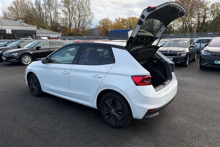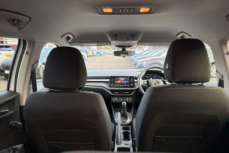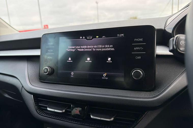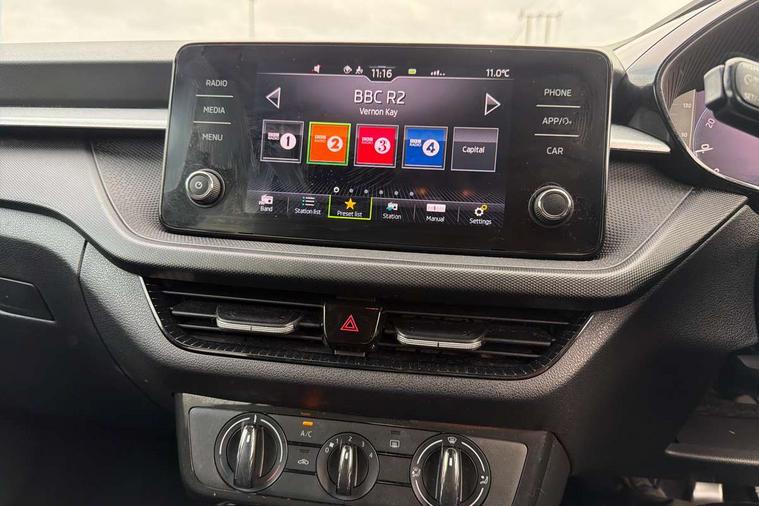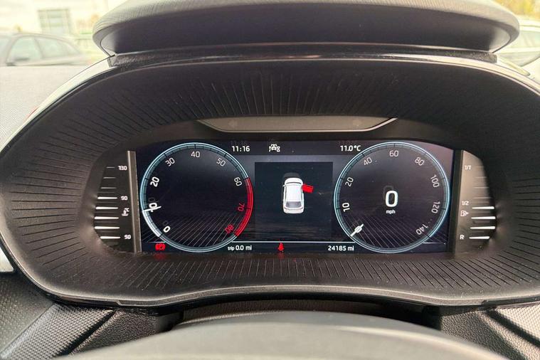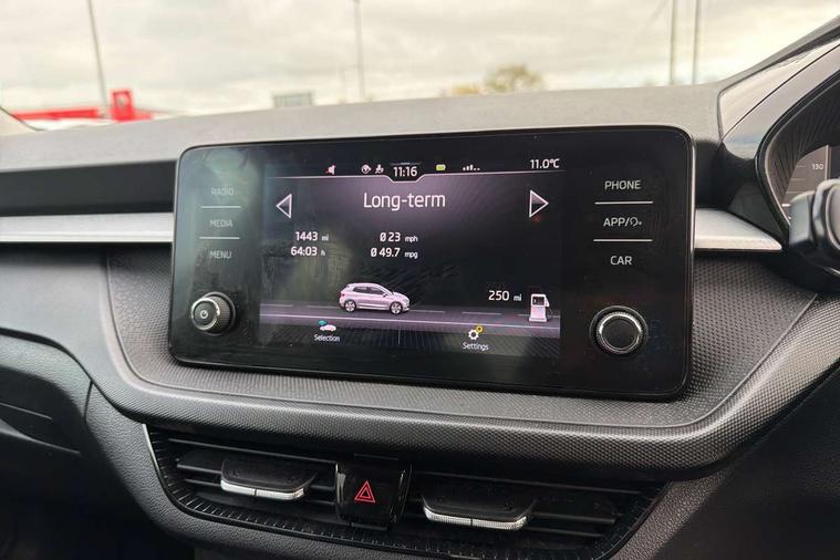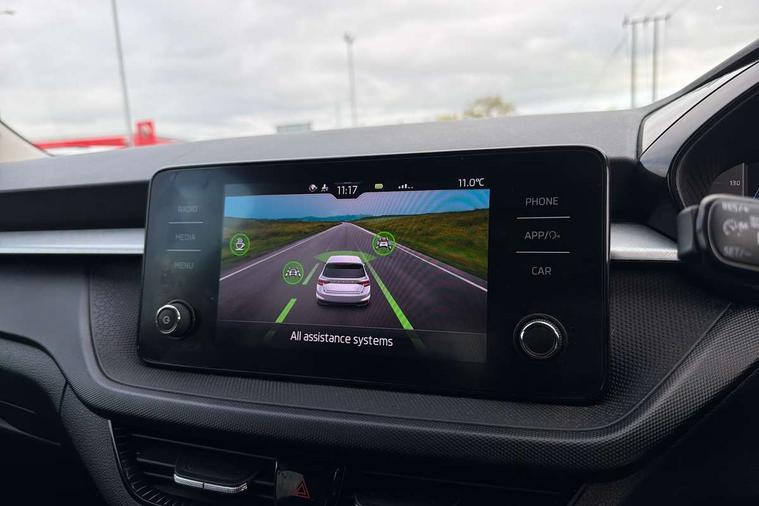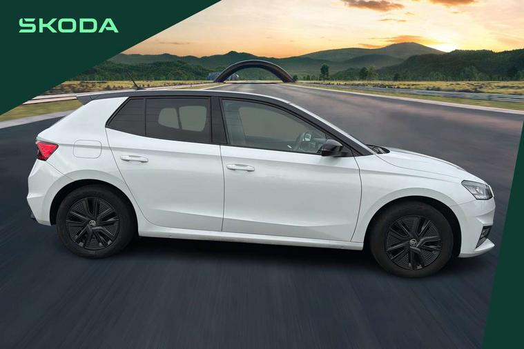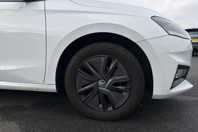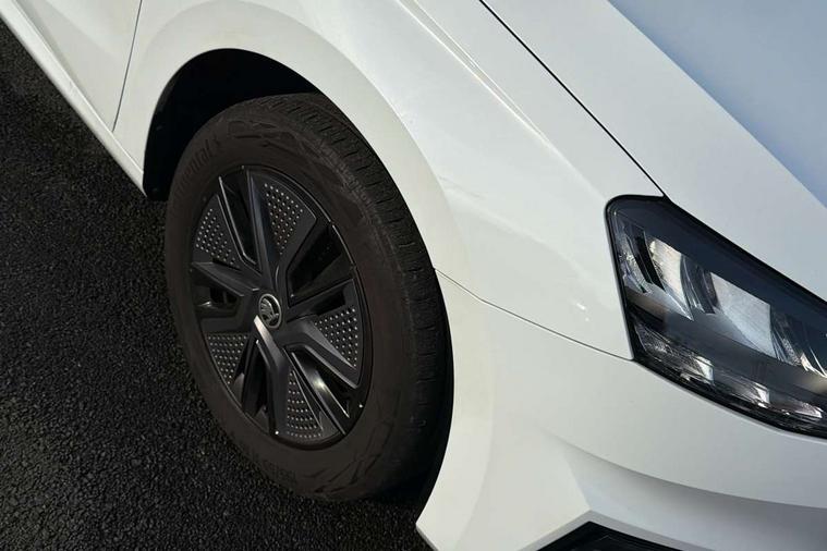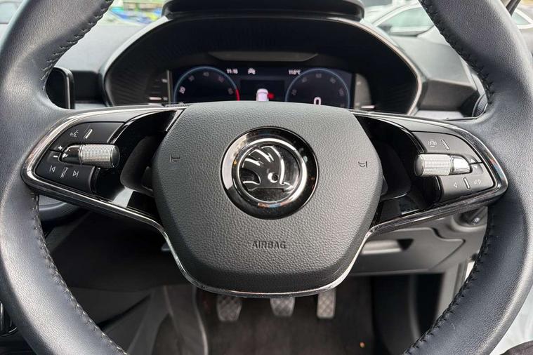Bluetooth connection, Driver alert system - DAS, Electromechanical power steering, Exterior temperature gauge, Lane assist including road edge detection, Service interval indicator, Virtual cockpit with 10.25" colour display, 2x USB-C in the front (for data transmission and charging), 6 Speakers (4 in front and 2 in rear), Auxiliary socket for external MP3 player, Bolero radio with 8" colour display, DAB digital radio reception, Basic rear lights, Body coloured bumpers, Dimming rear view mirror with black frame, Door mirror integrated indicators, Electrically adjustable and heated door mirrors, Electrically adjustable front windows with function auto up/down, Front window wiper intermittent control, Headlight range control - Automatic, Ice scraper in fuel cap, LED daytime running lights with coming and leaving home feature, Mechanical adjustable rear windows, Privacy glass, Rear LED fog light, Rear side wing doors, Rear window wiper with washing nozzles, Roof mounted spoiler, SKODA tailgate lettering in chrome, Third brake light, 3 rear headrests, Backrest split and folding, Central console with fixed cup holder and storage box, Chrome handbrake release button, Fabric upholstery, Gearshift knob/handle in leather, Grain satin black interior door handles, Hand brake lever handle in leather, Height adjustable front headrests, Height adjustable steering wheel, ISOFIX and TopTether anchorage points to the outer rear seats, ISOFIX and TopTether on the front passenger seat, Luggage compartment lighting, Pollen filter, Rear seat bench unsplit, Single front passenger seat, Storm grey headlining, Sun visors with mirror and airbag label on passenger side, Ticket holder, Umbrella in drivers door, 3-point height adjustable front seats belts with pretensioner and force limiter, Automatic warning lights in case of crash, Driver and passengers airbag with switch off function, e-Call+, ESC including ABS, MSR, ASR, EDS, HBA and XDS, Front and rear seat belt warning, FRONT ASSIST (AEB City and AEB Inter Urban), Front side airbags, Head airbags, One tone horn, Pedestrian protection, Three rear 3-points safety seat belts with pretensioner and force limiter including stop function for outer rear seat belts, Tyre pressure monitoring system, Anti-theft alarm system including immobiliser, interior monitoring, backup horn, and towing protection, Anodized cross line upper decorative trim, Colour Edition air vents, Grain satin black central console cover, Grain satin black lower decorative trim, Satin black door and side trim panel in front, Anti-theft wheel bolts protection, Super-low rolling resistance tyres,