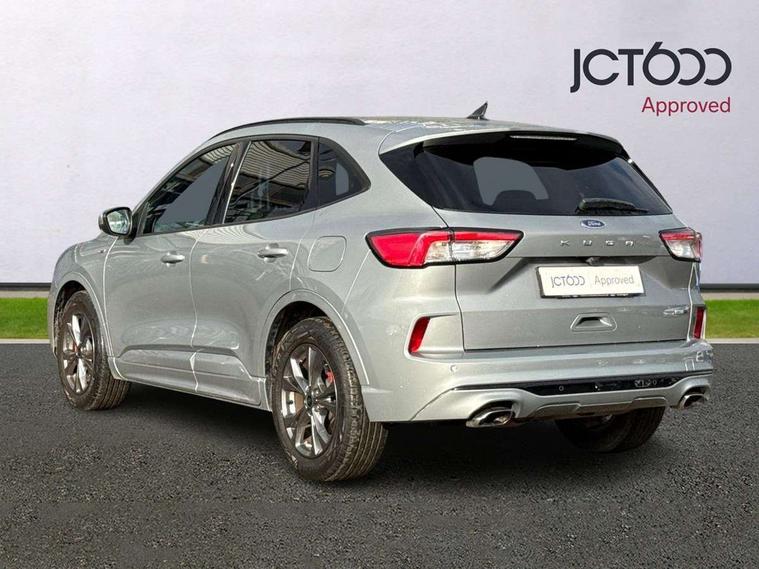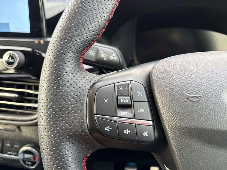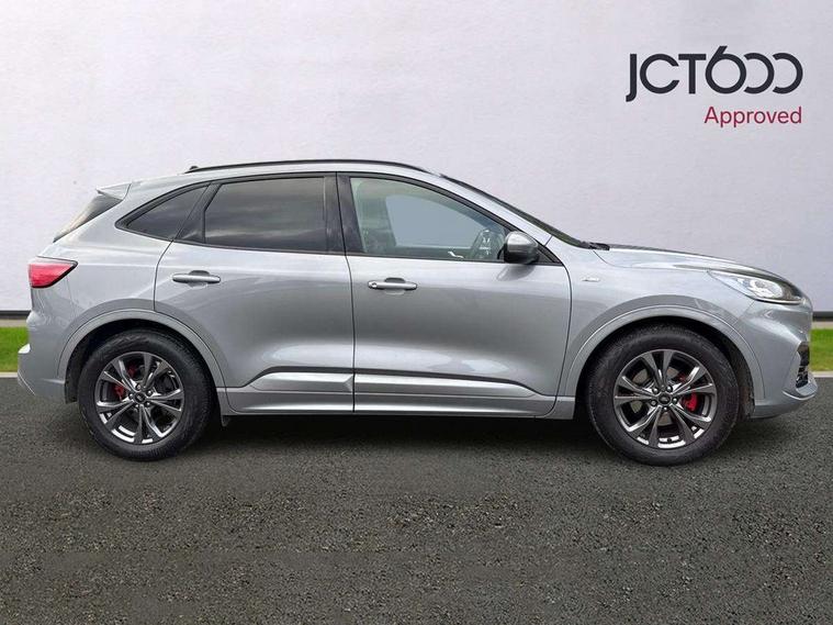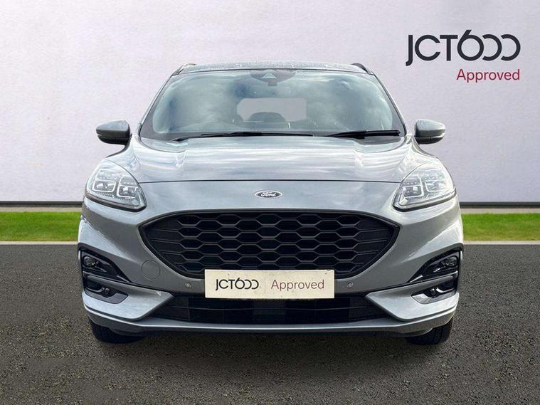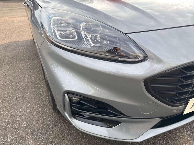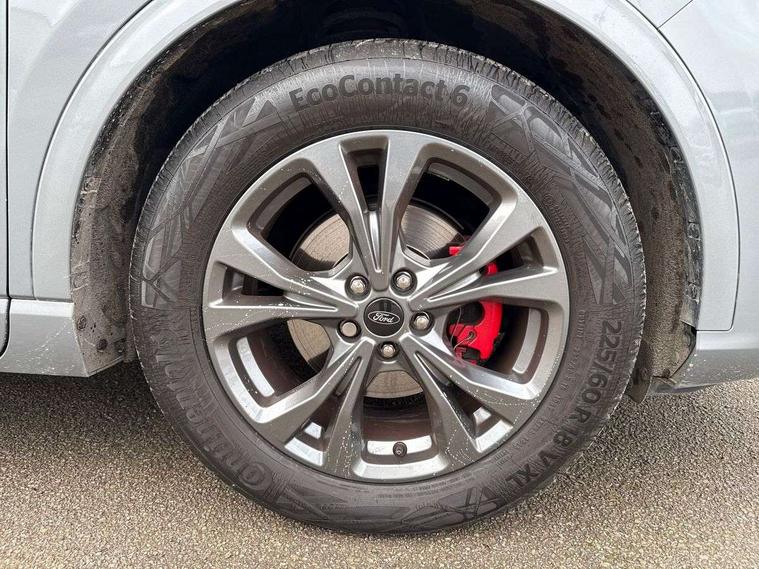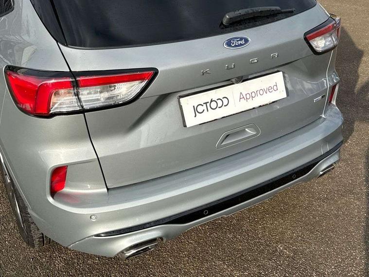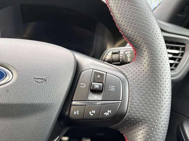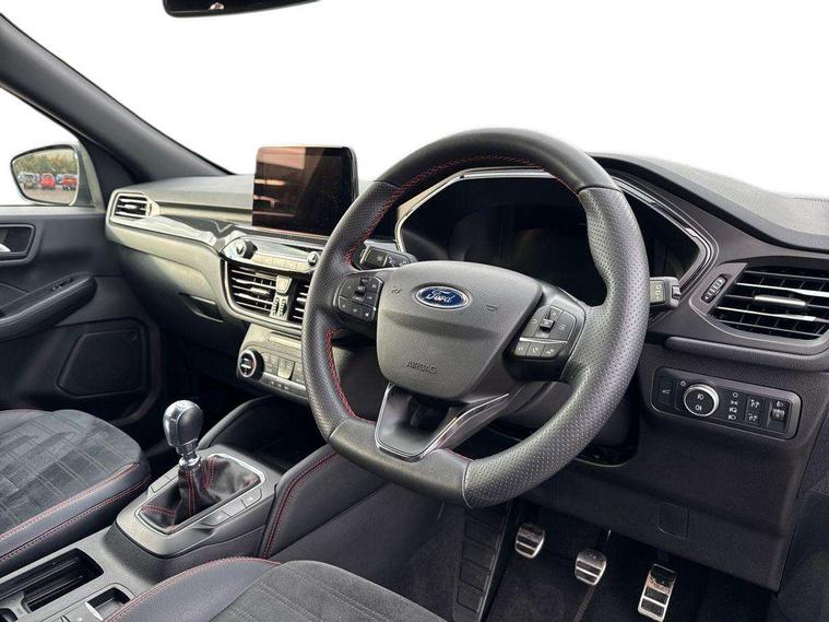 Driver impairment monitor, Ford easy fuel, Ford SYNC 3 with 8" colour touchscreen, App Link, andriod auto/apple carPlay and navigation with Ford pass connect, Front and rear parking sensors, Intelligent speed assist, Lane keeping aid with lane departure warning, Mobile phone wireless charging pad, Power assist steering, Selectable drive modes, Sports suspension, Auto dimming rear view mirror, Auto headlamps with high and low beam, Auto wipers, Black roof rails, Front LED fog lights with cornering function, Full LED headlamps, Large rear spoiler, LED daytime running lights, LED rear lights, Power folding heated door mirrors with puddle lights, Power front/rear windows with global close, Privacy glass, Quickclear heated windscreen, ST Line body styling kit with unique front and rear fascia and bumper, rear painted diffuser, front painted skid plates, dark mesh upper grille, ST Line front scuff plates, Twin exhausts, 2nd row sliding seats, 8 way manual passenger seat including lumbar support and height adjust, Alloy pedals, Ambient lighting, Centre console with electronic parking brake, Dark headlining and pillars, Dual electronic automatic temperature control, Flat bottomed leather steering wheel in sensico with red stitching, Front and rear head restraints, Rear charging point, Sensico partial premium leather upholstery, Sports seats, ST Line front and rear floor mats, Unique ST Line leather gear knob, B&O with large instrument cluster pack - Kuga, 3x3 point rear seatbelts, Airbags - front driver/passenger, front and rear curtain, Drivers knee airbag, Electronic stability control (ESC) and ABS, Ford MyKey Gen 2 safety system, Post collision braking, Powered child proof rear door locks, Pre collision assist with autonomous emergency braking, Red brake calipers, Tyre pressure monitoring system, Engine immobiliser, Keyless entry, Keyless start with 'Ford Power' starter button, Locking wheel nuts, Remote powered central double locking doors, Thatcham category 1 alarm, Tyre inflation kit,