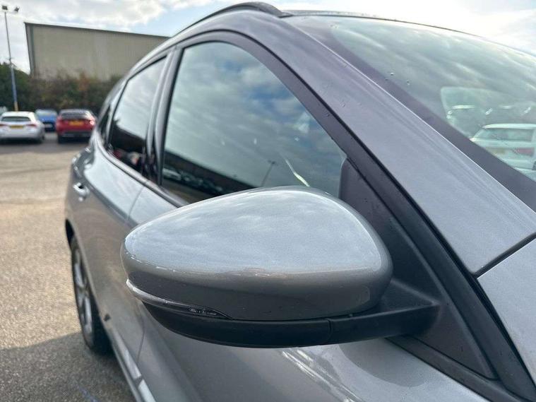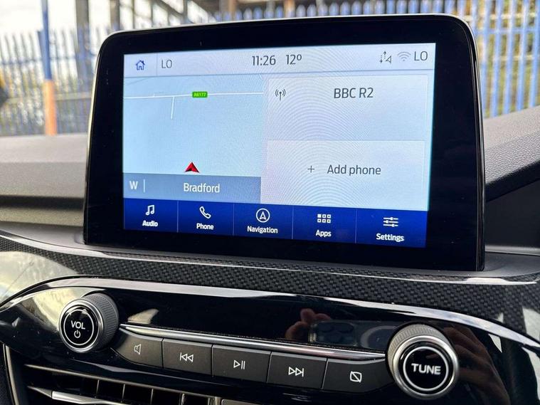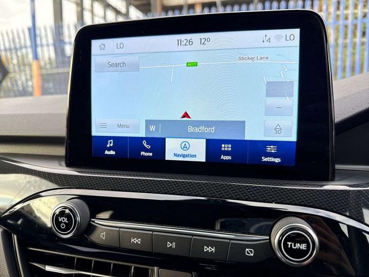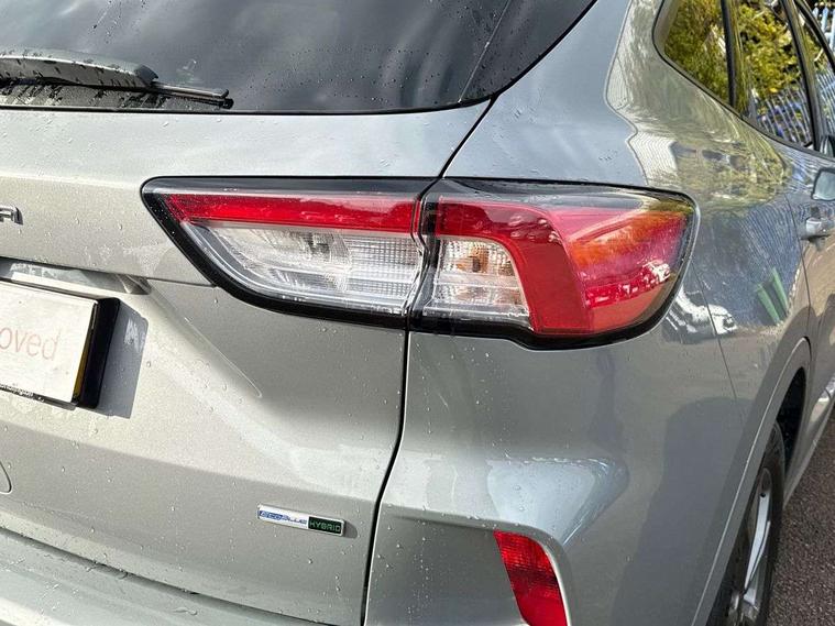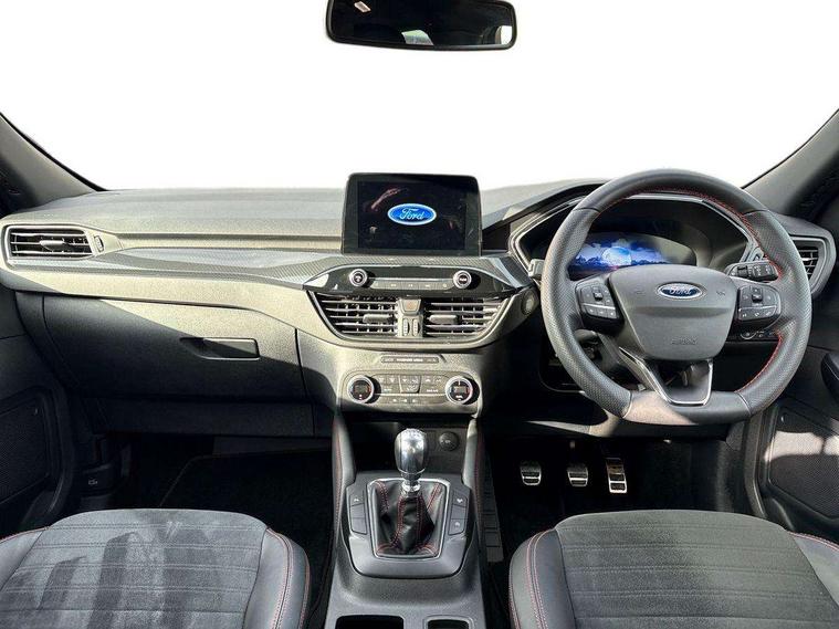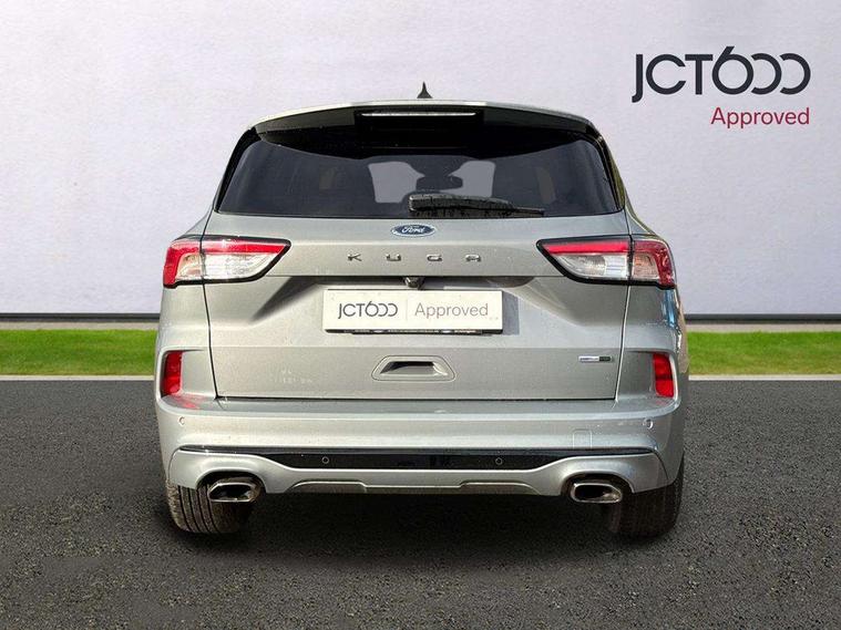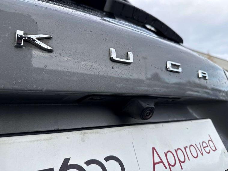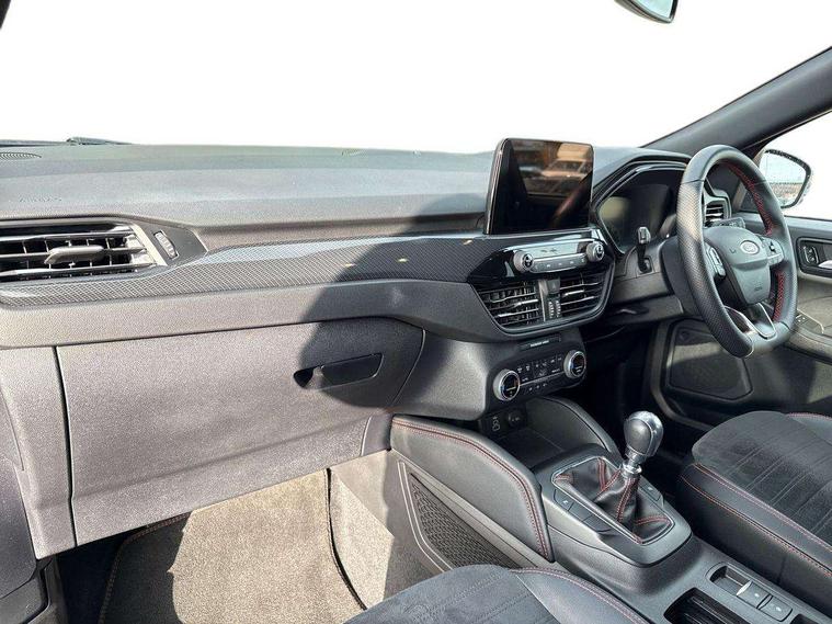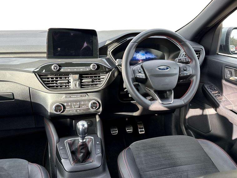 Driver impairment monitor, Ford easy fuel, Ford SYNC 3 with 8" colour touchscreen, App Link, andriod auto/apple carPlay and navigation with Ford pass connect, Front and rear parking sensors, Intelligent speed assist, Lane keeping aid with lane departure warning, Mobile phone wireless charging pad, Power assist steering, Selectable drive modes, Sports suspension, Auto dimming rear view mirror, Auto headlamps with high and low beam, Auto wipers, Black roof rails, Front LED fog lights with cornering function, Full LED headlamps, Large rear spoiler, LED daytime running lights, LED rear lights, Power folding heated door mirrors with puddle lights, Power front/rear windows with global close, Privacy glass, Quickclear heated windscreen, ST Line body styling kit with unique front and rear fascia and bumper, rear painted diffuser, front painted skid plates, dark mesh upper grille, ST Line front scuff plates, Twin exhausts, 2nd row sliding seats, 8 way manual passenger seat including lumbar support and height adjust, Alloy pedals, Ambient lighting, Centre console with electronic parking brake, Dark headlining and pillars, Dual electronic automatic temperature control, Flat bottomed leather steering wheel in sensico with red stitching, Front and rear head restraints, Rear charging point, Sensico partial premium leather upholstery, Sports seats, ST Line front and rear floor mats, Unique ST Line leather gear knob, B&O with large instrument cluster pack - Kuga, 3x3 point rear seatbelts, Airbags - front driver/passenger, front and rear curtain, Drivers knee airbag, Electronic stability control (ESC) and ABS, Ford MyKey Gen 2 safety system, Post collision braking, Powered child proof rear door locks, Pre collision assist with autonomous emergency braking, Red brake calipers, Tyre pressure monitoring system, Engine immobiliser, Keyless entry, Keyless start with 'Ford Power' starter button, Locking wheel nuts, Remote powered central double locking doors, Thatcham category 1 alarm, Tyre inflation kit,