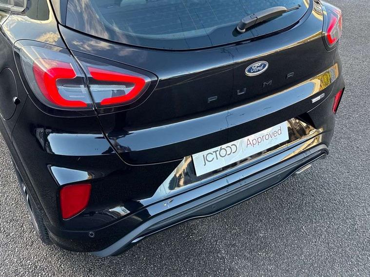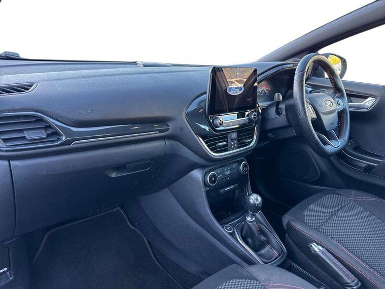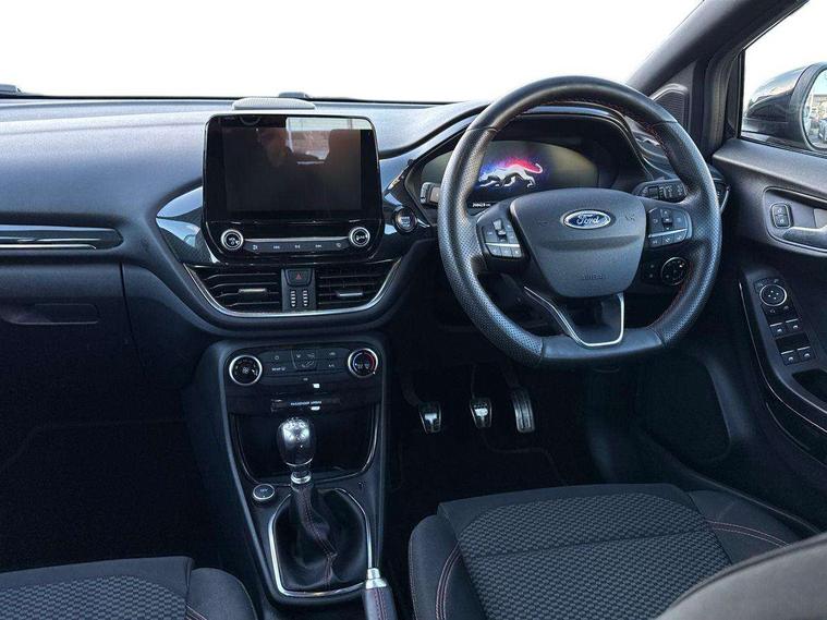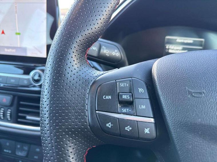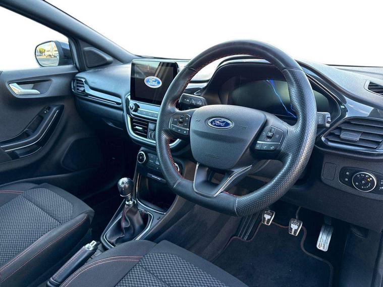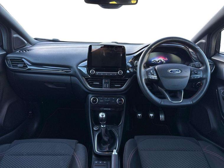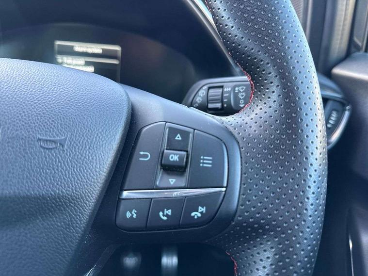 Ford easy fuel, Full digital 12.3" instrument cluster, Lane keeping aid with lane departure warning, Power assist steering, Rear parking sensor, Selectable drive modes(Normal, sport, Eco, trail, slippery), Wireless charging pad, Automatic headlights with rain sensing wipers and auto high beam, Body coloured door mirrors, Front fog lights with cornering lights and LED rear lamps, Power foldable heated door mirrors with puddle lamps, Quickclear heated windscreen, Rear wiper, ST-Line body kit with large rear spoiler wth sports suspension, Alloy sports pedals, Centre console with armrest and stowage, Court cloth upholstery with belgrano bolsters, Driver seat height/lumbar adjust, Ford megabox extended bootspace, Front and rear floor mats, Front and rear head restraints, Manual air conditioning, ST-Line flat bottomed sensico leather steering wheel with leather handbrake and aluminium gear knob, 3 rear seatbelts, Electronic stability control (ESC) and hill start assist, Pre-collision assist with autonomous emergency braking, pedestrian/cyclist detection & post-collision braking, Tyre pressure monitoring system (TPMS), Thatcham alarm, Tyre inflation kit,