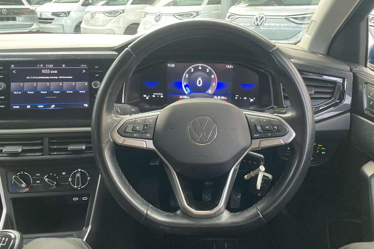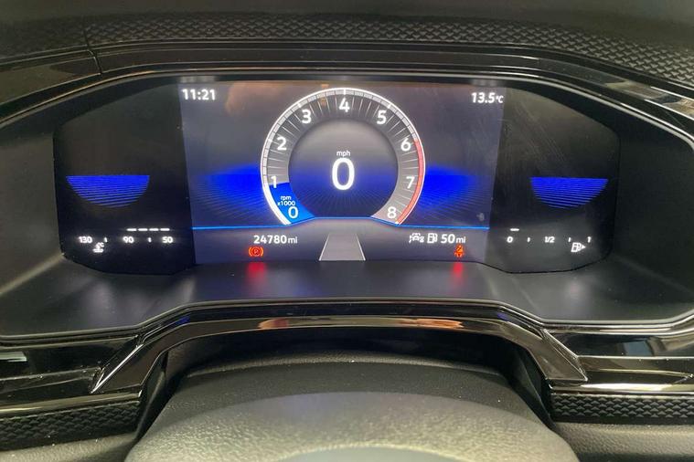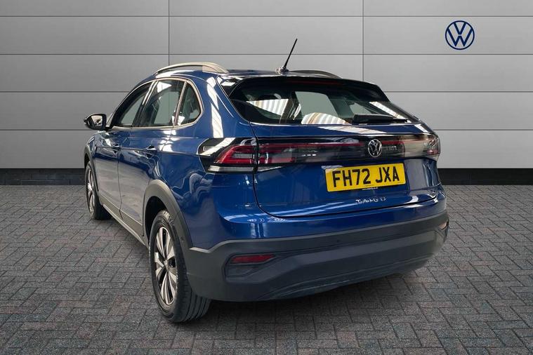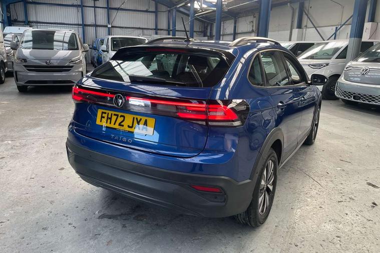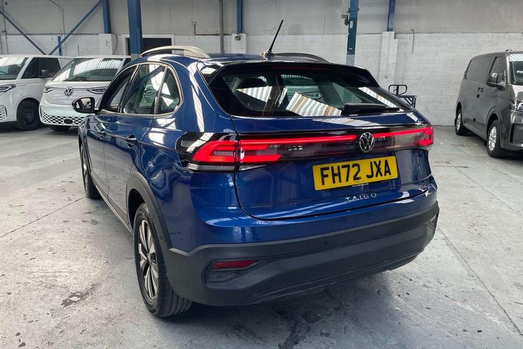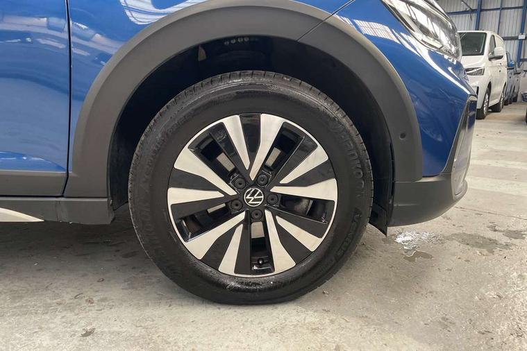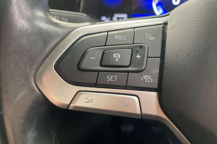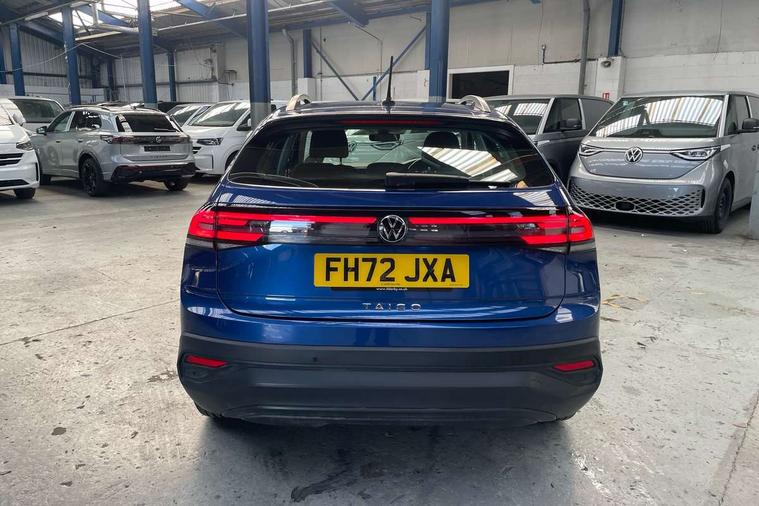 Driver alert system, e-Call (emergency call), Power Steering, Travel assist including emergency assist, Washer fluid level indicator, Wireless Charging including Bluetooth, Start-stop system with battery regeneration (recuperation - energy recovery during braking), WeConnect plus, Ambient lighting with logo projection, Aspherical driver's exterior mirror, Auto headlights, Body coloured bumpers, Body coloured exterior mirror housings and door handles, Electric windows, External USB type C socket and charging sockets, Front fog lamps with cornering function, Headlight range control, Heat insulating glass windscreen, LED headlamps, LED rear combination lamp, LED third brake light, Left convex exterior mirror, Power folding adjustable/heated exterior mirrors and front passenger exterior mirror lowering function, Rear fog light on one side, reversing light on both sides, Rear side wing doors, Rear wash/wipe with intermittent wipe setting, 'Slash/ Austin' Cloth upholstery, 12V socket in centre console, 2 front reading lights, 3 rear head restraints, 3 seat bench in 2nd row, Black carpets, Child seat anchor for child seat system i-Size, 2x top tether and child seat anchor in front on front passenger side, Door and side trim panels in titan black, Driver and front passenger seat height adjustment, Front centre armrest, Handbrake lever handle in leather, Height and reach adjustable steering wheel, Leather trimmed gear knob, Leather wrapped multifunction steering wheel, Luggage compartment floor, Luggage compartment light, Lumbar support for driver's and front passengers seat, Seat covers in titanium black, Single front passenger seat, Split folding backrest with centre armrest and unsplit rear seat bench, Storage compartment under front seats, Sun visors with illuminated vanity mirrors, Chrome Package - Taigo, Drivers assistance pack - Taigo, Light and Sight pack including High beam assist - Taigo, 2 x 3-point seatbelts/outer rear seats with ECE label, 3-point seat belts in front with pretensioner and height adjustment, 3-point seatbelt for centre rear seat, Driver and front passenger airbags with front passenger airbag de-activation, front side and curtain airbags, Driver and front passenger safety-optimised head restraints, Electronic stability control, Extended and predictive pedestrian/ cyclist protection, Front and rear disc brakes, Front curtain and side airbags with center airbag, Hill start assist, Manual rear child locks, Single tone horn, Tyre pressure loss indicator, Anti-theft alarm system with interior monitoring, backup horn, and towing protection, Anti-theft wheel bolts, Lava stone black gloss/matt decorative inserts in dash and front door panels, Low rolling resistance tyres,
