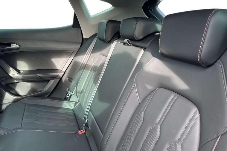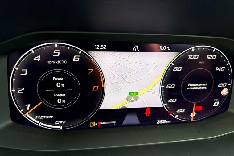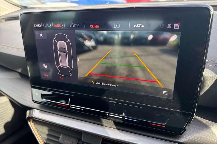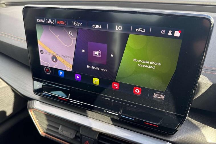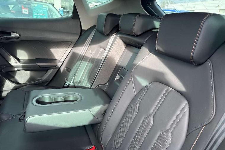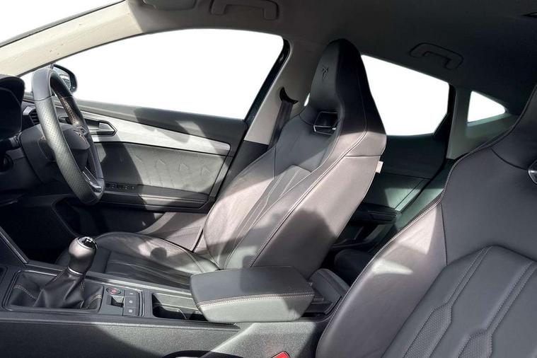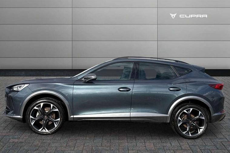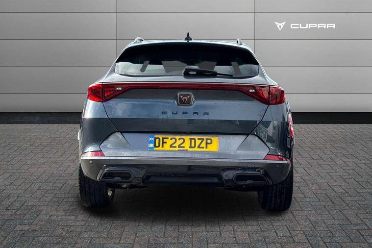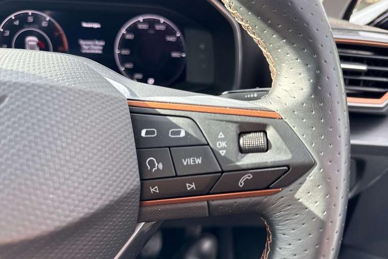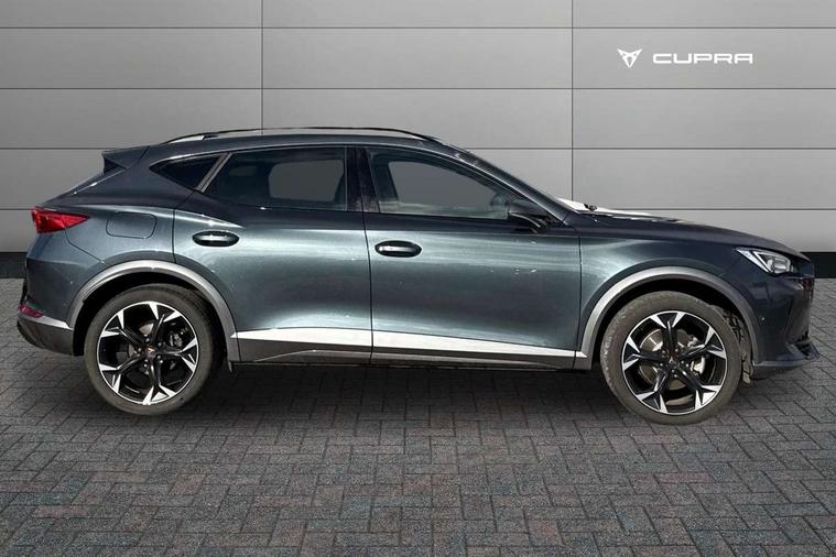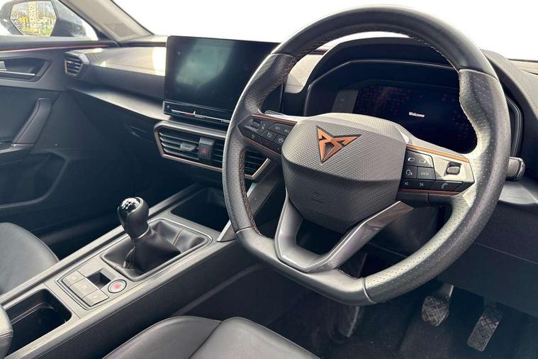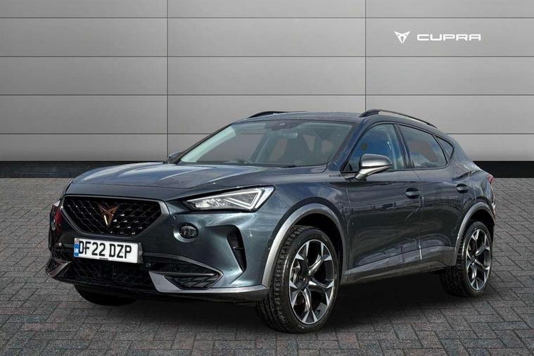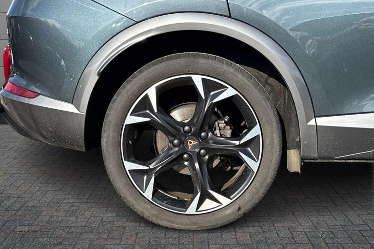 Digital cockpit and configurable dashboard, Driver alert system, Driving profile selection, E-call, Forward collision warning with automatic braking, Lane assist, Navigation system with 12'' Touchscreen Display, Park assist (inc front/rear parking sensors), PAS, Predictive adaptive cruise control with speed limiter, Rear view camera, RPM, trip computer, outside temp gauge, instrument light brightness, low fuel warning light, lights on reminder, gearshift indicator, Service interval indicator, Start/stop system with regenerative braking, Voice control system, Wireless apple carplay, Wireless phone charger, Electronic locking differential and dynamic traction support, Standard suspension, 2 front and 2 rear USB type C sockets, Auxiliary input socket, DAB radio, Auto dimming rear view mirror, Body colour door handles, Body coloured bumpers, Dark grey wing mirror, Daytime running light with automatic headlight control and coming home feature, Dynamic headlight range control, Electric front/rear windows, Electrically adjustable heated and folding door mirrors with memory function, Front fog lamps with cornering function, Gloss black roof rails and window surrounds, LED Headlights, LED Taillights with dynamic indicator, Rain sensing wipers, Rear diffuser with black simulated exhaust pipes, Rear side wing doors, Rear wash/wipe, Third brake light, Tinted rear windows, Welcome lights, 12v power supply in centre console, 12V socket, 12v socket in loadspace, 2 front and 2 rear reading lights, 230V socket, 3 seat bench in 2nd row, 60/40 split rear bench seat with armrest and mechanical seat release, Black headlining, Dust/pollen filter, Front and rear head restraints, Front centre armrest, Height/reach adjust steering wheel, Illuminated interior front door sills, Illuminated sunvisor with mirror, Isofix, Leather multi function steering wheel, Luggage tie-down hooks, Single front passenger seat, Three zone climate control with control panel in rear, Variable luggage/load compartment floor, Wraparound lighting, Genuine Nappa leather Pack - Cupra, Safety and driving pack (M) - Formentor, 3 point seatbelts on all rear seats, ABS, Brake control system - ESC and brake booster, Child proof door locks, Driver and front passenger airbags with front passenger airbag de-activation, Electronic parking brake, Front and rear disc brakes, Front side curtain airbags, Hill hold control, Seat belt reminder for front and rear seats, Tyre pressure monitoring system, Anti theft alarm system, Keyless entry and start system (KESSY), Locking wheel bolts, Copper and aluminium interior detailing, 19" 'Exclusive' machined sport matte black and silver alloy wheels,