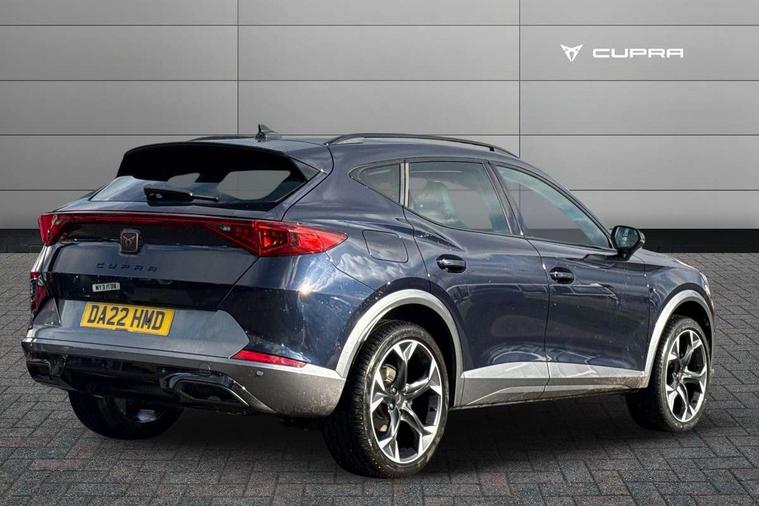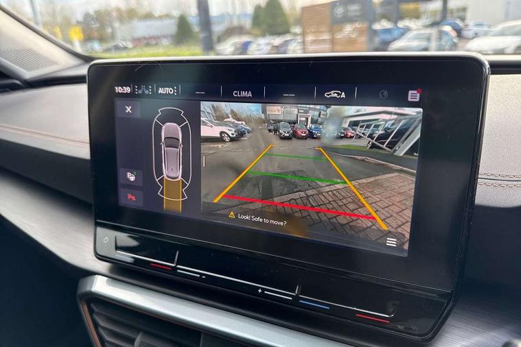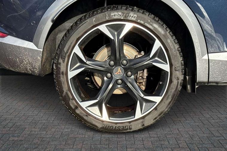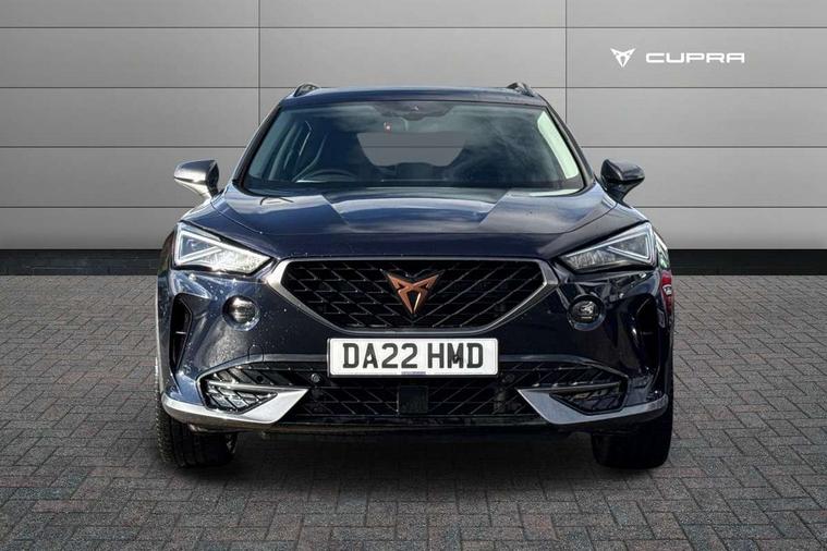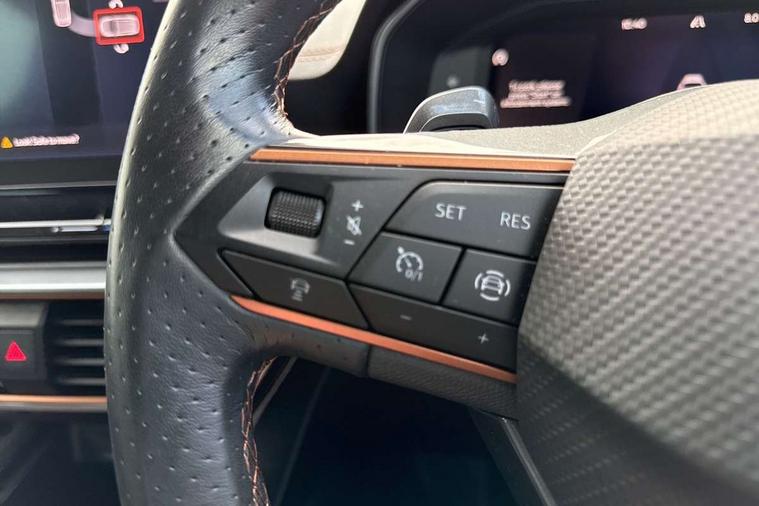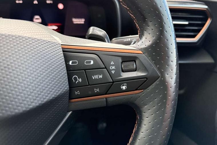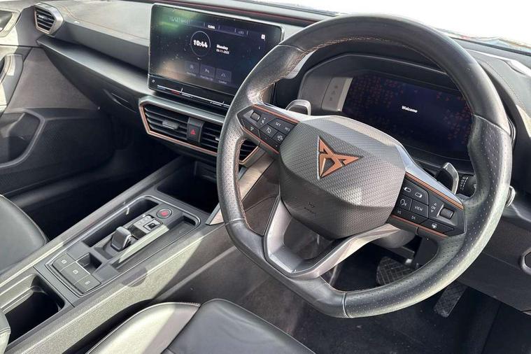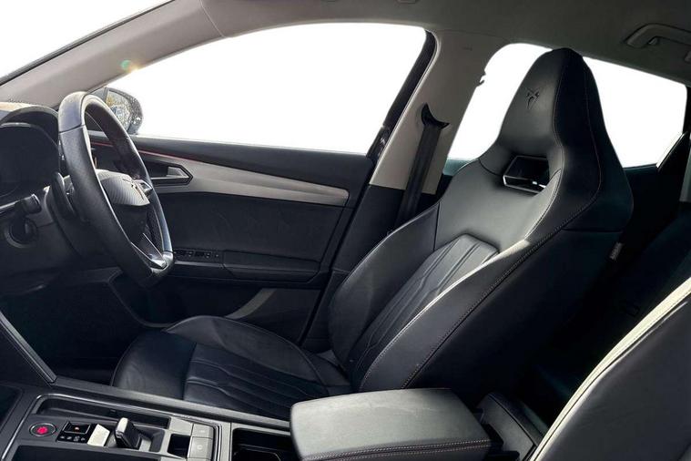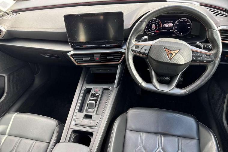 Digital cockpit and configurable dashboard, Driver alert system, Driving profile selection, E-call, Forward collision warning with automatic braking, Lane assist, Navigation system with 12'' Touchscreen Display, Park assist (inc front/rear parking sensors), PAS, Predictive adaptive cruise control with speed limiter, Rear view camera, RPM, trip computer, outside temp gauge, instrument light brightness, low fuel warning light, lights on reminder, gearshift indicator, Service interval indicator, Start/stop system with regenerative braking, Voice control system, Wireless apple carplay, Wireless phone charger, Electronic locking differential and dynamic traction support, Standard suspension, 2 front and 2 rear USB type C sockets, Auxiliary input socket, DAB radio, Auto dimming rear view mirror, Body colour door handles, Body coloured bumpers, Dark grey wing mirror, Daytime running light with automatic headlight control and coming home feature, Dynamic headlight range control, Electric front/rear windows, Electrically adjustable heated and folding door mirrors with memory function, Front fog lamps with cornering function, Gloss black roof rails and window surrounds, LED Headlights, LED Taillights with dynamic indicator, Rain sensing wipers, Rear diffuser with black simulated exhaust pipes, Rear side wing doors, Rear wash/wipe, Third brake light, Tinted rear windows, Welcome lights, 12v power supply in centre console, 12V socket, 12v socket in loadspace, 2 front and 2 rear reading lights, 230V socket, 3 seat bench in 2nd row, 60/40 split rear bench seat with armrest and mechanical seat release, Dust/pollen filter, Front and rear head restraints, Front centre armrest, Height/reach adjust steering wheel, Illuminated interior front door sills, Illuminated sunvisor with mirror, Isofix, Leather multi function heated steering wheel with gear shift paddles, Luggage tie-down hooks, Single front passenger seat, Three zone climate control with control panel in rear, Variable luggage/load compartment floor, Wraparound lighting, Genuine Nappa leather Pack - Cupra, 3 point seatbelts on all rear seats, ABS, Brake control system - ESC and brake booster, Child proof door locks, Driver and front passenger airbags with front passenger airbag de-activation, Electronic parking brake, Front and rear disc brakes, Front side curtain airbags, Hill hold control, Seat belt reminder for front and rear seats, Tyre pressure monitoring system, Anti theft alarm system, Keyless entry and start system (KESSY), Locking wheel bolts, Copper and aluminium interior detailing, 19" 'Exclusive' machined sport matte black and silver alloy wheels,