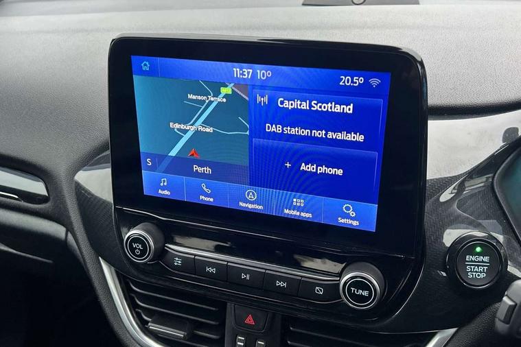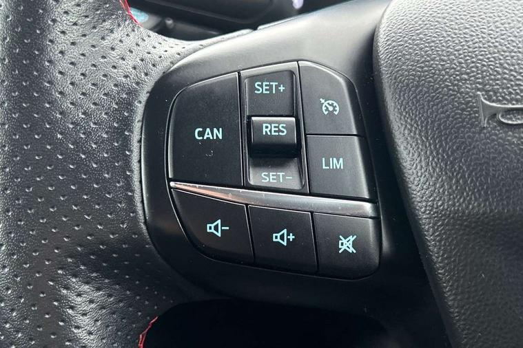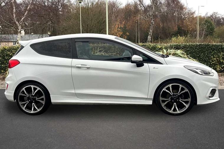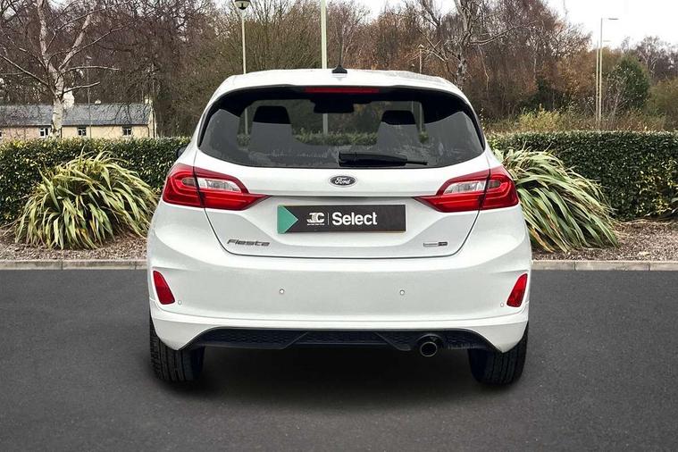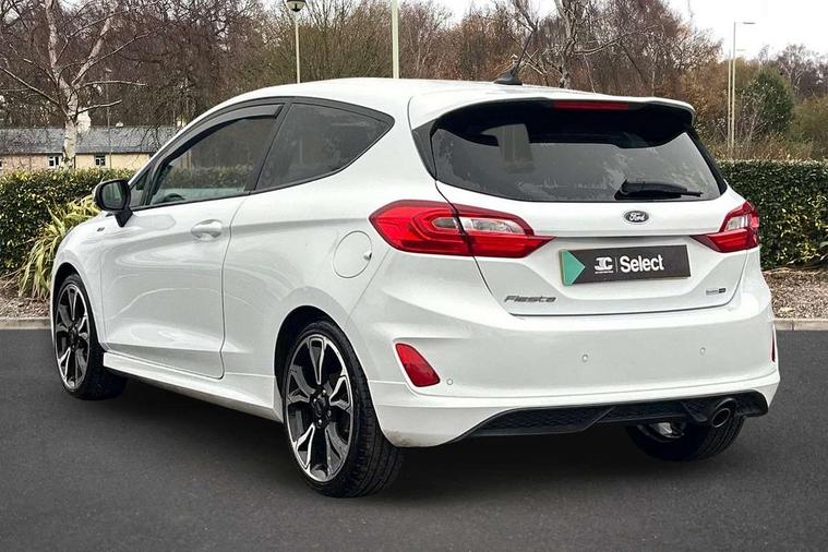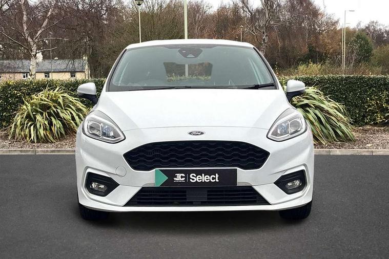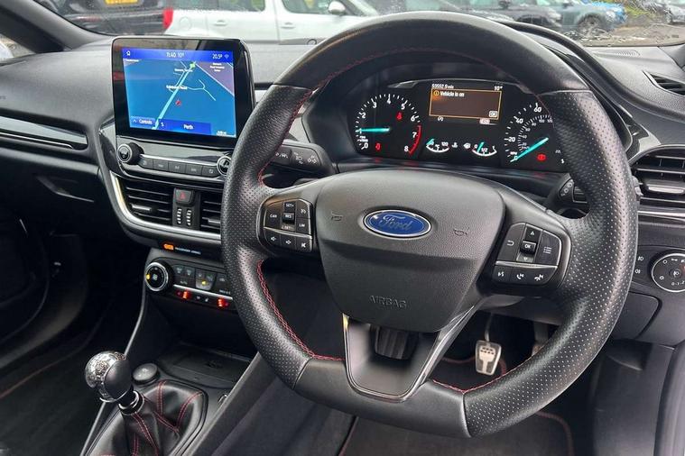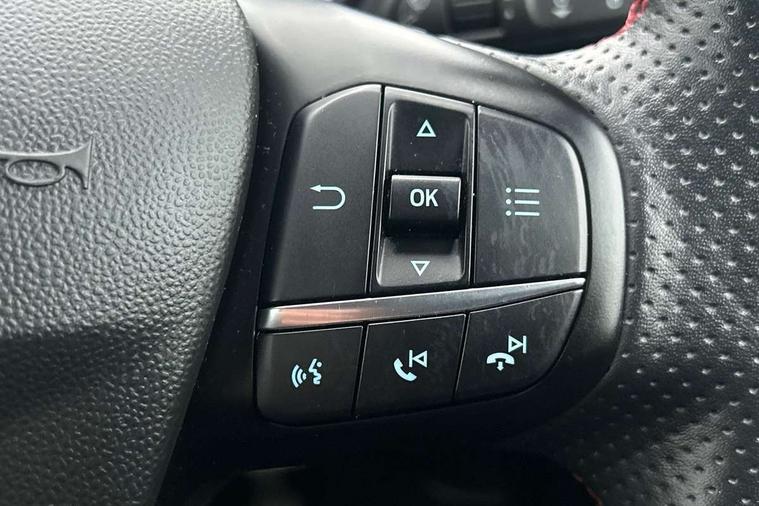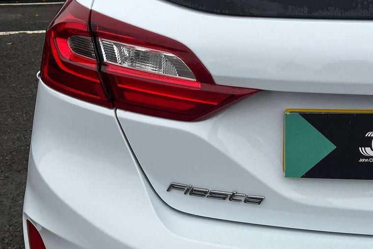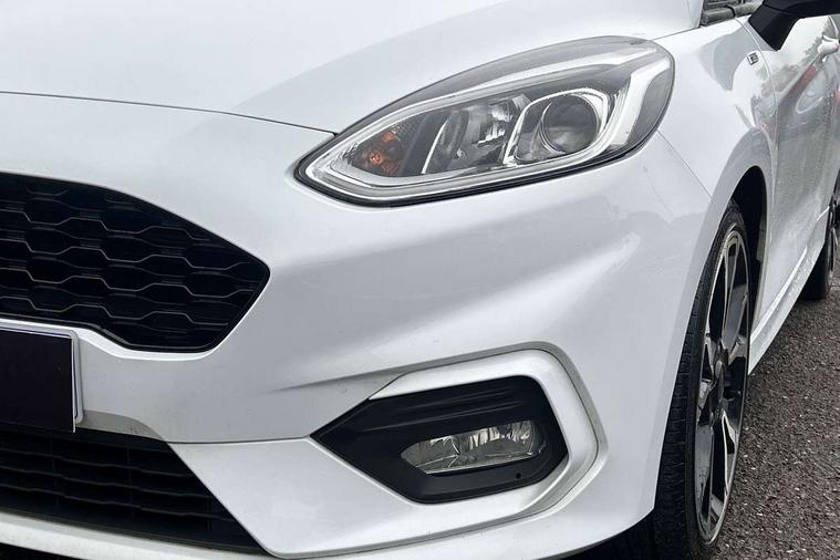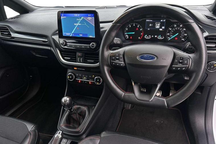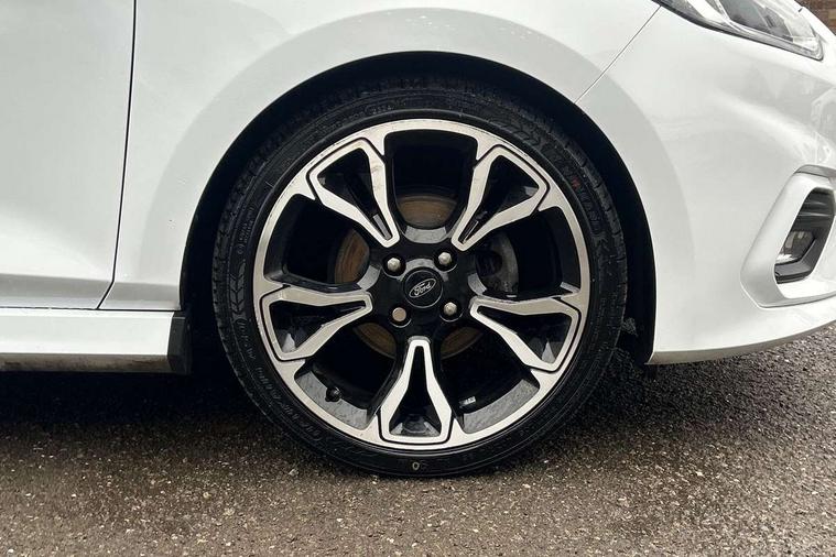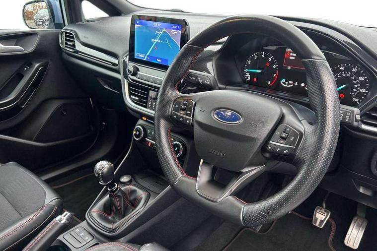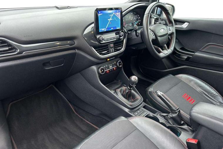 4.2" TFT instrument cluster screen, Bluetooth system, Electric power steering, Ford easy fuel, Rear parking distance sensors, Traffic sign recognition, Trip computer, Sports suspension, 2 USB ports, Auxiliary input socket, B&O Premium audio system with 8" touchscreen, 10 speakers, 360 degree sound system, Ford SYNC 3 navigation system and Ford pass connect, DAB Digital radio, Steering wheel mounted controls, Auto high beam, Body colour bumpers, Body colour door handles, Body colour large rear spoiler, Body coloured electrically operated and heated door mirrors with side indicators, Cornering front fog lights, Electric front windows/one touch facility, LED Night signature to rear lights, Power foldable door mirrors with puddle lights, Quickclear heated windscreen, Rain sensing wipers and auto dimming rear view mirror, Rear privacy glass, Rear wiper, Unique ST-Line upper grille & full bodystyling kit with ST-Line wing badges, 12V Accessory socket in centre console, 3 spoke flat bottomed leather steering wheel, 60/40 split folding rear seat, Adjustable head restraints, Black headlining, Boot carpet, Centre console with armrest and illuminated cupholders, Chrome inner door handles, Drivers and Passenger lumbar support, EATC - Electronic Auto Temperature control, Footwell illumination, Front map reading lights, Front seat and rear pockets, Front/rear floor mats, Height adjustable driver's seat, Height adjustable passenger seat, Illuminated glovebox, LED ambient lighting, Load area light, Overhead console with sunglasses holder, Pollen filter, Rake/reach adjustable steering wheel, Sensico wrapped handbrake and gearknob, Sports front seats, Sports pedals, NCAP Pack - Fiesta, Red pack - Fiesta ST-Line X, 3 point seatbelts on all rear seats, ABS+EBA, Curtain airbags, Driver and passenger airbags, Drivers knee airbag, Electronic stability control with hill start assist, Front passenger airbag deactivation, Front side airbags, Seatbelt warning, Two tone horn, Tyre pressure monitoring system, Ford keyfree system with Keyless entry and keyless start, MyKey system, Remote central locking & engine immobiliser, Thatcham Cat.1 alarm, 18" 5 spoke alloy wheels with rock metallic machined finish,