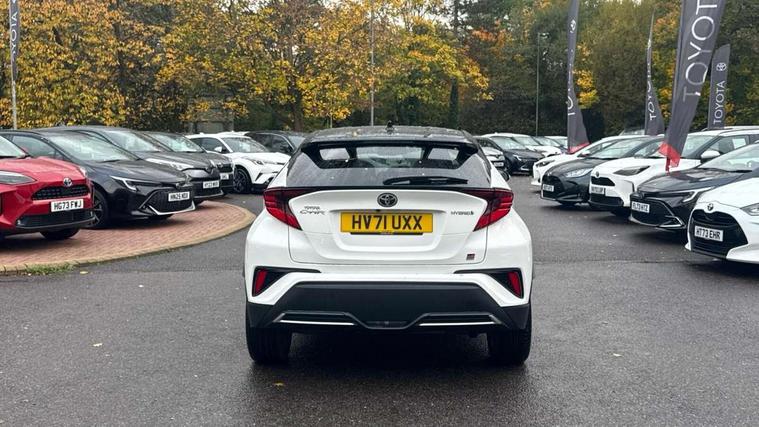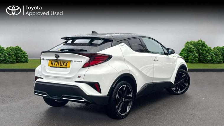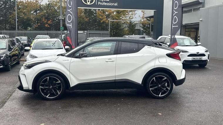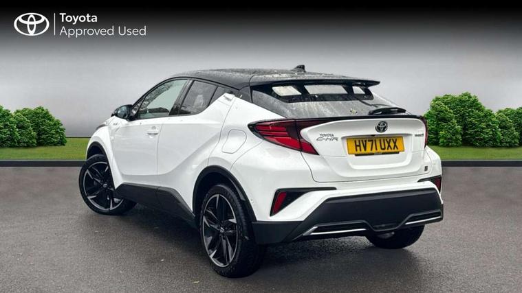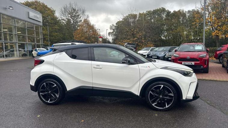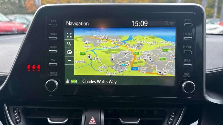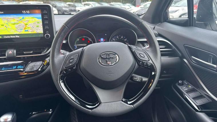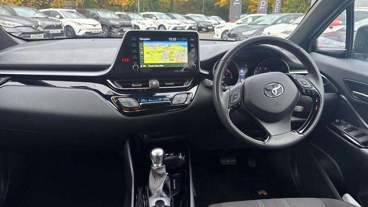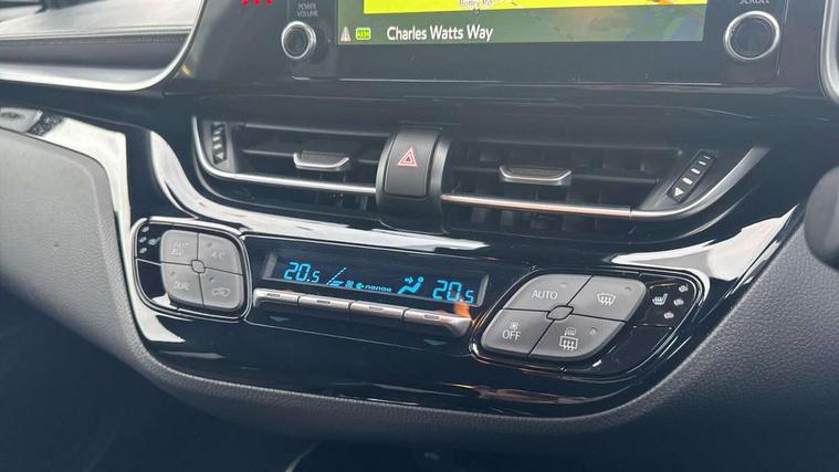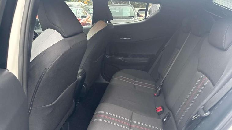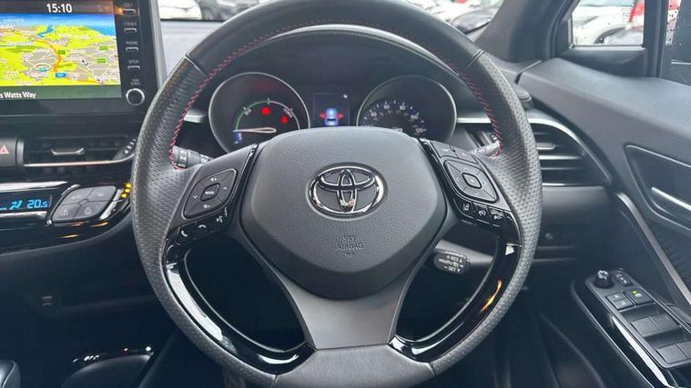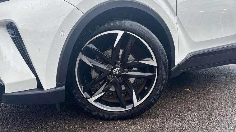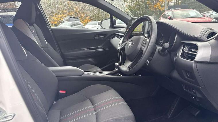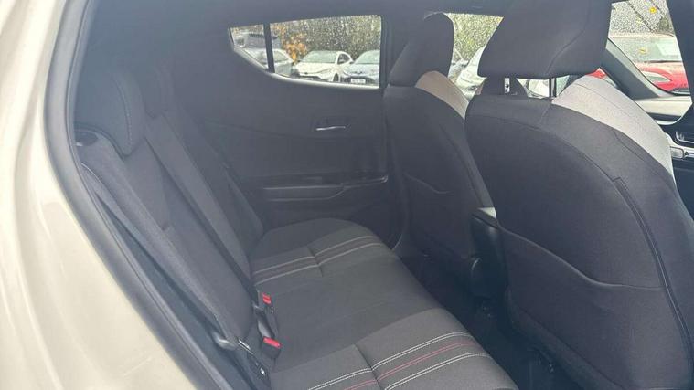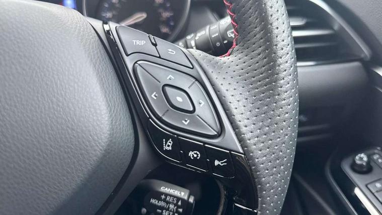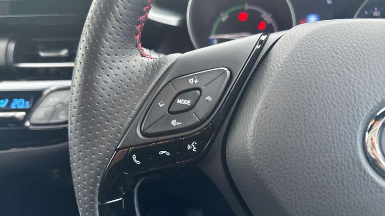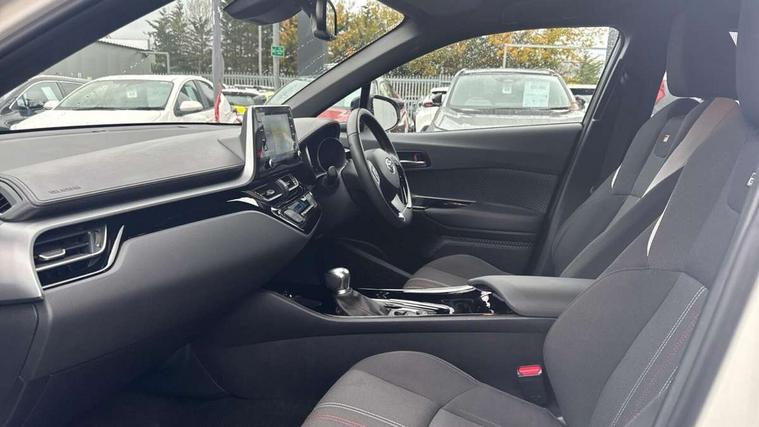 Black lower dashboard, Black upper dashboard, Piano black console, Silver deco line on upper dashboard, Tech with parking sensor pack - C-HR, 19" Black machined alloy wheels, Tyre repair kit, Acoustic vehicle alert system (AVAS), Glass-breaking alarm sensors, Immobiliser, Intrusion alarm, Intrusion sensor, Motion sensor alarm, Power door locks, Power passenger window lock, Remote central locking, 6 speakers, AM/FM radio, DAB Radio (Digital Audio Broadcasting), Toyota touch 2 multimedia system with 8" display, USB connector, Wi-fi connectivity, 16 Disk front wheel brake, 3x3 point rear seatbelts, ABS+EBD+Brake assist, Electronic parking brake, Front and rear seatbelt reminder, Front passenger airbag on/off switch, Hill start assist control (HAC), Pre collision system with pedestrian detection, Pre-tensioners and force limiters, Rear door child safety locks, SRS Airbags - Driver + Front passenger, front side, front and rear curtain and driver's knee airbags, Toyota safety sense, Tyre pressure monitoring system, Adaptive front light system, Adaptive LED Headlights, Anti-jam protection on power windows, Auto high beam, Auto up and down function on all power windows, Automatic headlight levelling, Automatic headlights, Automatic headlights cut-off, Black and body coloured rear bumper, Black upper front grille, Body colour door handles, Body colour door mirrors, Body coloured front bumper, Boot door release with push button, Chrome front lower bumper, Electric heated door mirrors, Follow me home headlights, Front and rear power windows, Front spoiler lip in black, Hard tonneau cover, Honeycomb lower front grille, LED daytime running lights, LED fog lights, LED front light guide, LED High mounted stop light, LED rear brake lights, LED rear combination lights, Noise reduction layer on front windows and windscreen, Power adjustable door mirrors, Privacy glass, Rear sequential indicators, Rear spoiler, Rear tailgate, Rear window defogger, Rear window wiper, Shark fin antenna, UV-filter on driver and passenger windows, UV-filter on rear windows, 12v power outlet - front, 3 rear headrests, 3 spoke perforated leather steering wheel, 60/40 split folding rear seat, Adjustable rear headrests, Adjustable speed limiter switch on steering wheel, Assist grips front and centre pillar, Audio and telephone switches on steering wheel, Black front door assist grips, Blue ambient lighting on front cup holders, Blue ambient lighting on front doors, Boot light, Chrome interior door handles, Driver and front passenger personal light, Driver and front passenger Whiplash Injury Lessening seats, Driver and passenger seatback pockets, Dual zone automatic air conditioning, Fabric upholstery, Floor mats, Front cupholders, Front head restraints, Front sports seats, Glovebox with internal light, Heated driver and front passenger seats, Hooks for luggage holding net, Humidifying Nanoe air purifier, Illuminated entry system, Isofix attachments on rear seats, Leather gearshift, Light on driver sun visor, Light on passenger sun visor, Manual telescopic steering wheel, Manual tilt steering wheel, Manually height adjustable driver seat, Manually height adjustable front passenger seat, Manually reclining driver seat, Manually reclining front passenger seat, Manually sliding driver seat, Manually sliding front passenger seat, Microphone on front personal light, Mirror on driver sun visor, Mirror on passenger sun visor, Multimedia switches on steering wheel, Pollen filter, Power adjustable lumbar support on driver seat, Shopping bag hooks, Slow opening on lower glovebox, Voice recognition switch on steering wheel, 4.2" coloured TFT screen for multi-information display, Adaptive cruise control, Bluetooth connectivity, Electric power steering, Hybrid system indicator, Lane departure alert with steering control, Remote boot door release in cabin, Remote boot door release in key, Reversing camera, Road sign assist - RSA, Simple Intelligent parking assist, Touch 2 Go navigation system, Trip computer, Voice recognition, Vehicle Stability Control (VSC),