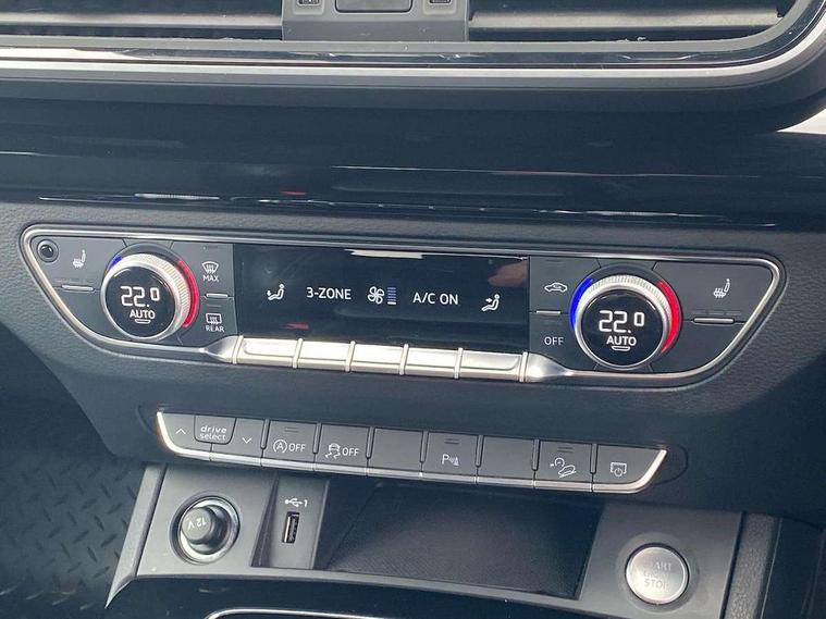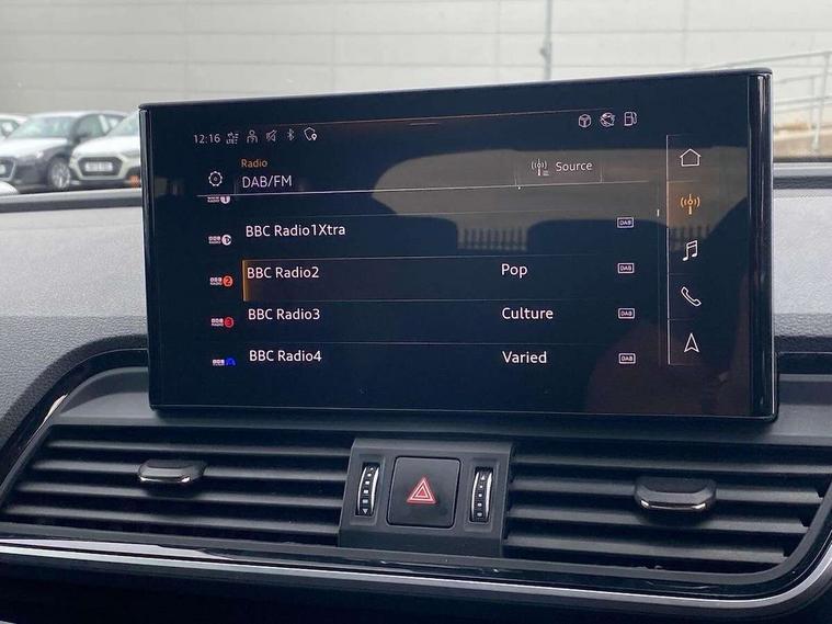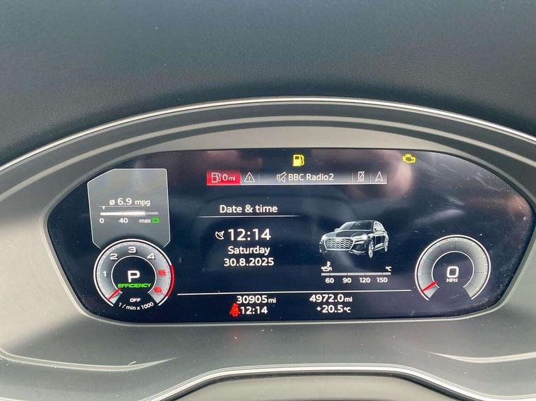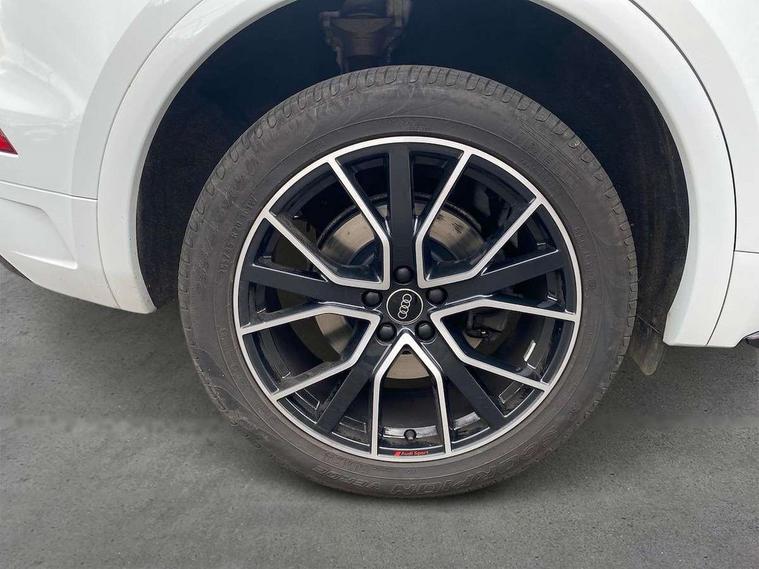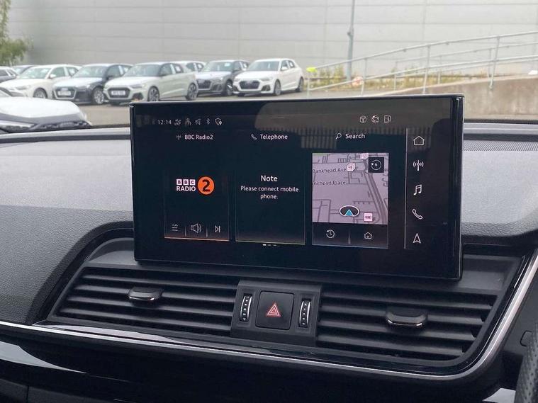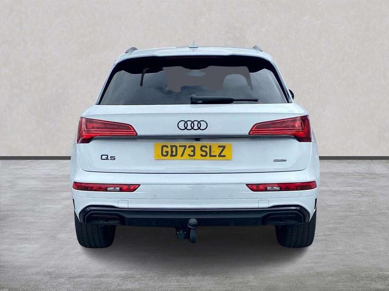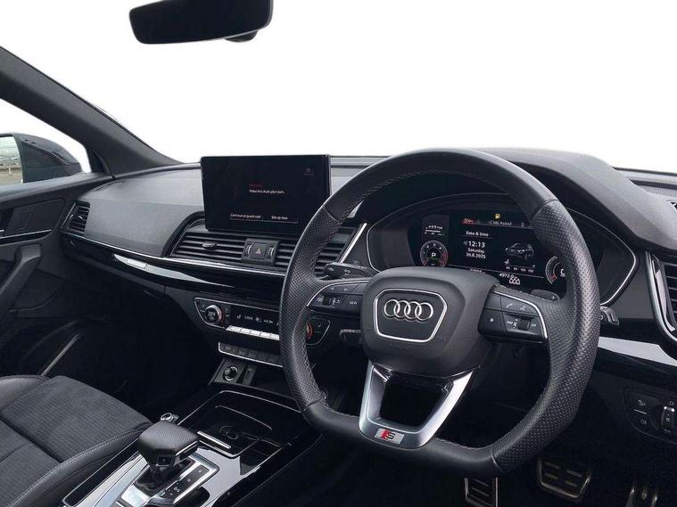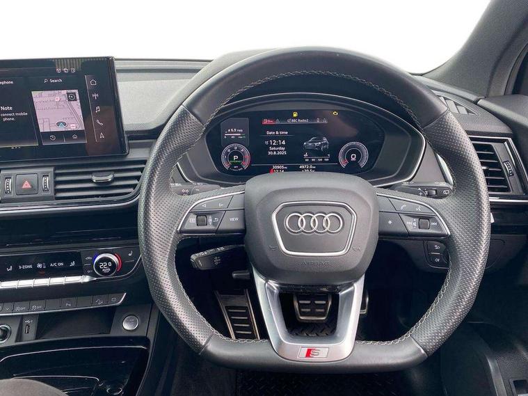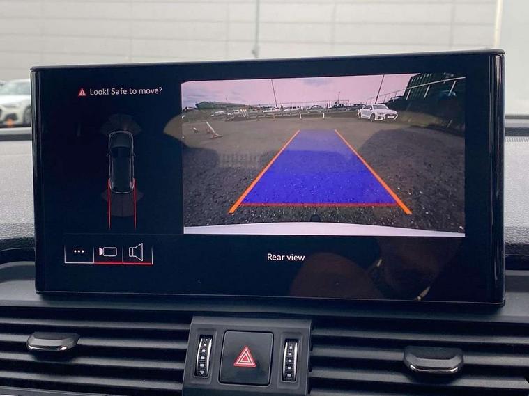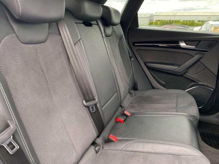 Acoustic front and rear parking sensor, Audi connect safety and service (e-call), Audi drive select, Audi virtual cockpit plus with 12.3" screen and three different layout designs, Audi wireless smartphone interface, Automatic start-stop system with coasting functionality and efficiency programme, Bluetooth interface, Camera based traffic sign recognition, Electro - mechanical power assisted steering, Lane departure warning, MMI navigation plus with 10.1" touch screen, Power tailgate, Reversing camera, Service interval indicator, Voice control system with Audi hotword activation "Hey Audi", Diesel particulate filter, Quattro on demand, S line sports suspension, 2 x USB charging port with aux input socket, 8 loudspeakers, DAB Digital radio, Acoustic windscreen, Auto dimming door mirrors, Auto dimming frameless rear view mirror, Automatic headlight adjustment, Automatic headlights and windscreen wipers, Black roof rails, Black styling with black rings, Body colour bumpers, Body colour rear diffuser with matt aluminium silver surrounds, Body colour underbody protection, Chrome plated exhaust trims, Daytime running lights, Door sills in Selenite silver, Electric adjustable/heated/folding door mirrors, Front air inlet surrounds in aluminium, Front and rear electric windows, Front radiator grille in honeycomb design, LED 3rd brake light, LED headlights and LED tail lights, Loading edge protection in stainless steel, Lower bumpers painted in contrast Manhattan grey, Rear chrome trim strip below lights, Rear privacy glass and rear side windows, Rear side wing doors, Rear wiper, Roof bars, S Line badges on the front wing panels, S Line front and rear bumpers, S Line rear spoiler, S Line side skirts, 3 rear headrests, Black cloth headlining, Comfort front centre armrest, Contrast stitching on seats, steering wheel and gear lever gaiter, Deluxe 3 zone electronic climate control, Front head restraints, Front sport seats with S embossed logo, Front/rear floor mats, Gear lever in black leather, Heated front seats, Height/reach adjustable steering column, Illuminated door sill trims with S logo, Luggage compartment cover, Manual seat adjustment with 4-way electric lumbar support, Single front passenger seat, Stainless steel pedals, Sunvisors with vanity mirrors, Top surface of the rear centre armrest in artificial leather, High gloss pack - Q5, LED interior light pack - Q5, 3 point seatbelts on all seats, 6 airbags - Driver, front passenger, curtain and side airbags, Attention and drowsiness assist, Electrically operated child locks on rear doors, Electromechanical parking brake, Electronic stabilisation control including ABS, ASR and EDL, First aid kit with warning triangle and vests, Front passenger airbag deactivation, Hill descent control, Hill hold assist, ISOFIX child seat mounting for front passenger seat and ISOFIX child seat mounting with Top Tether for outer rear seats, Multi collision brake assist, Pop-up bonnet for pedestrian protection, Pre sense city, Seatbelt monitoring, Tyre pressure warning, Anti theft alarm, Anti-theft wheel bolts, Remote central locking, Remote control key with SAFELOCK and keyless go, Air vents inserts and centre console in gloss black, Tool kit, Tyre repair kit,