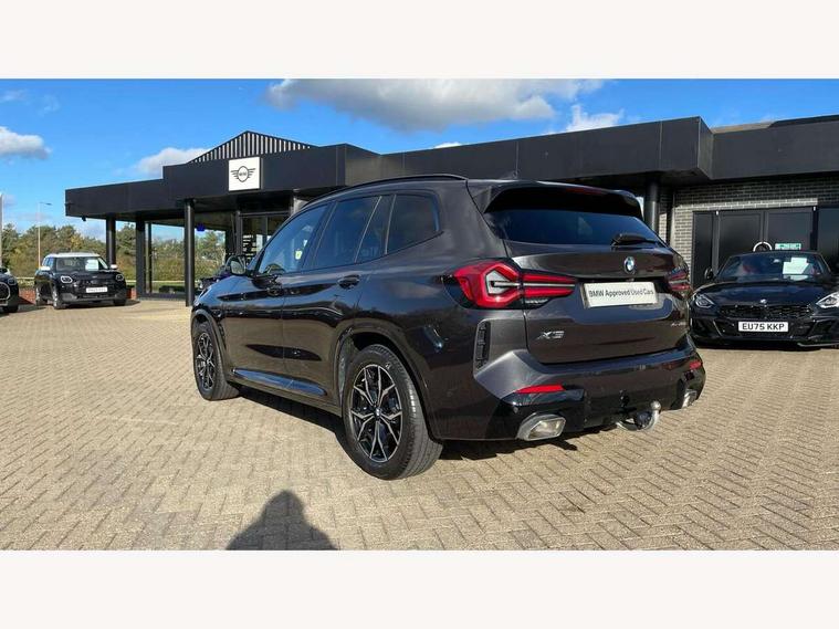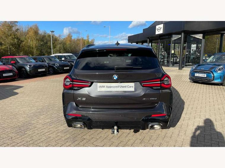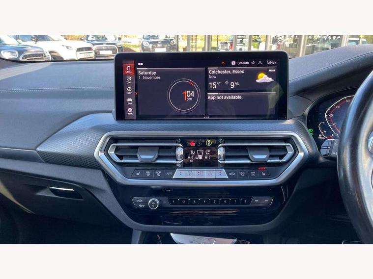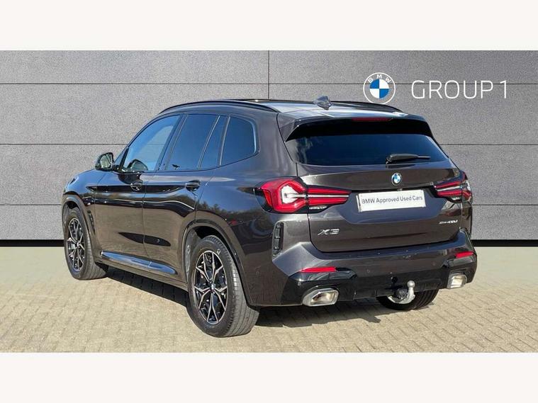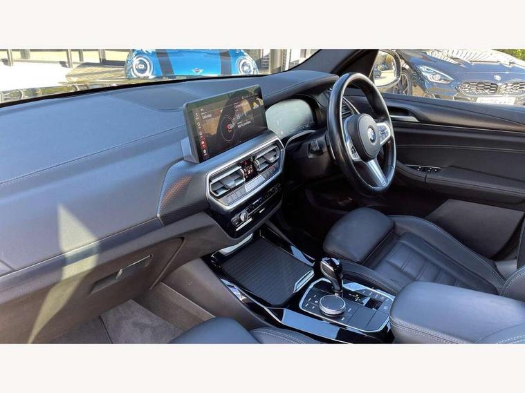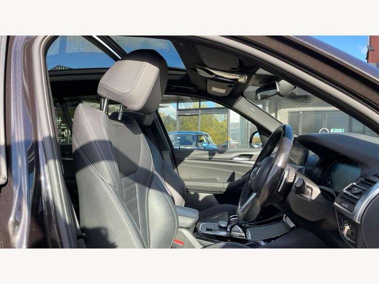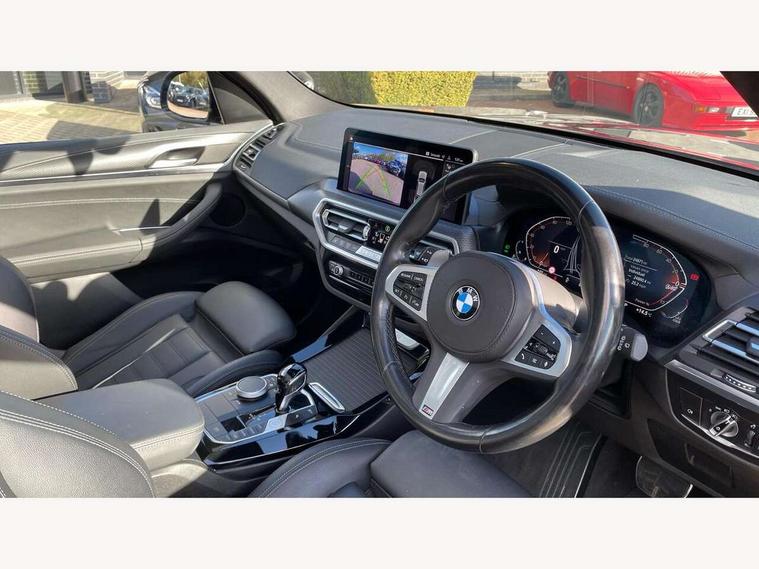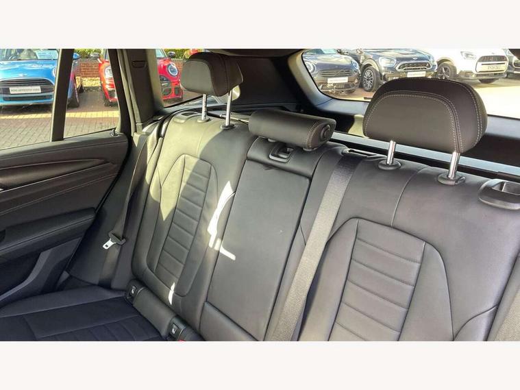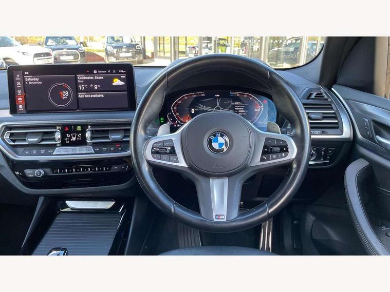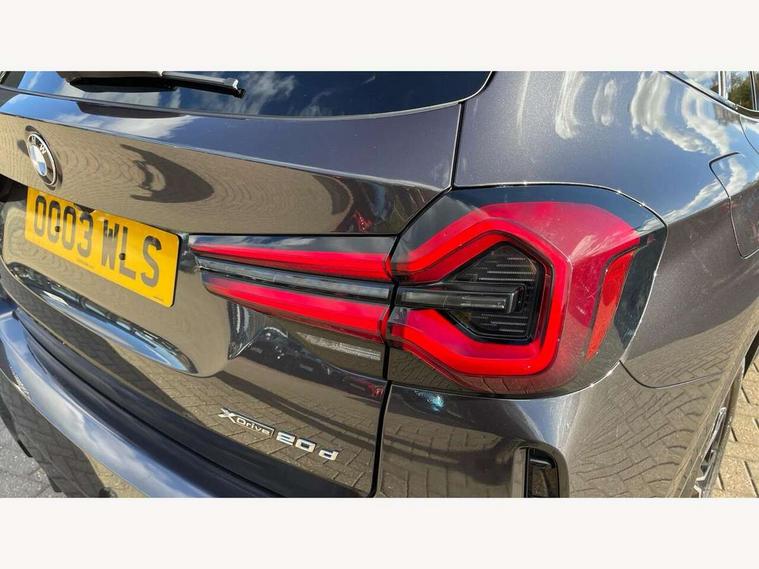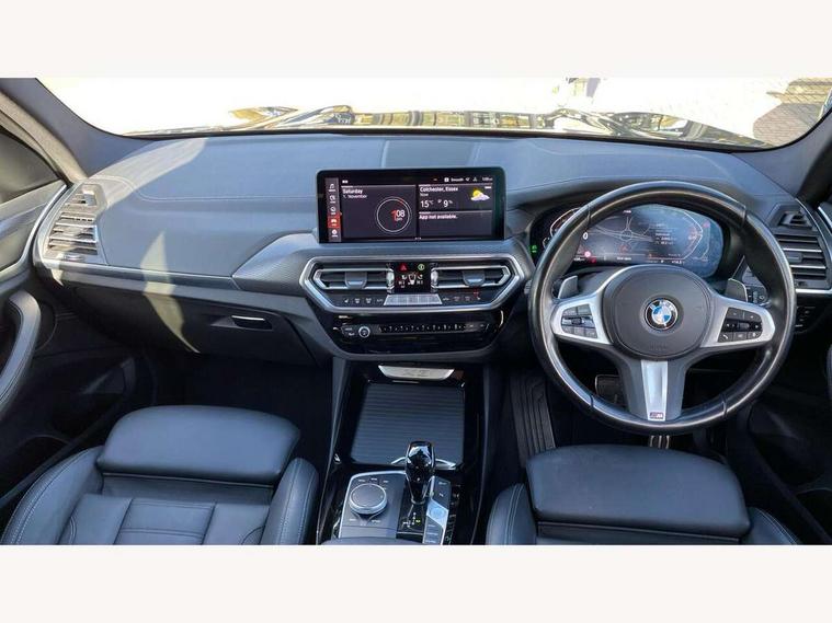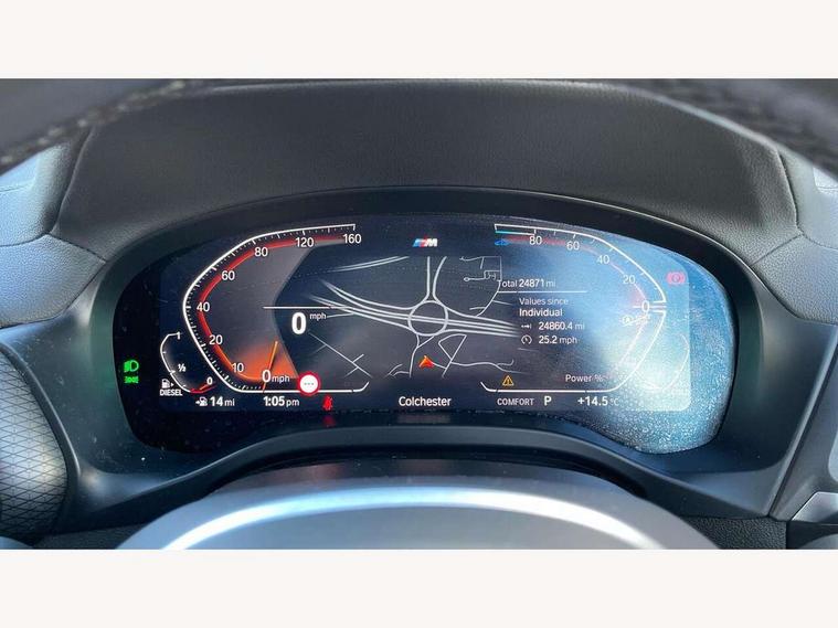 Active Guard, Attentiveness assist, BMW Live Cockpit Professional nav system including 12.3" instrument display + 12.3 high resolution control display, BMW Online services, BMW Teleservices, Brake pad wear indicator in front and rear, Check Control warning system for monitoring of lights and door/luggage compartment open warning, Condition based service - BMW service history, electronic service booklet, integrated owner's handbook, Connected drive services, Electric boot lid, Front/rear Parking distance control, iDrive touch controller with 8 favourite buttons, Instrument cluster with speedometer with mph readout, tachometer, fuel gauge and oil temperature gauge, Lights on warning by audio warning signal when ignition is switched off, Oil sensor for level and grade, warning by check control system, On board computer - average speed+fuel consumption, service interval, clock/date, odometer/trip meter, outside temperature display and ice warning, Optimum shift indicator, Personal Profile - automatic lock when driving away selectable, Run flat indicator, Stop/start system, Variable sports power steering with drive performance control Sport+ mode, Automatic transmission with gearshift paddles, Diesel particulate filter, Incorrect fuelling protection, Larger capacity fuel tank, M sport suspension, Multi-link rear suspension, BMW professional radio/CD/MP3, DAB tuner, Acoustic glazing, Automatic windscreen wipers and automatic headlight, Black finish on B pillars, Body colour door handles, Body colour electric adjust heated aspherical door mirrors, Body colour roof mouldings, Body coloured bumpers, Direction indicator, side repeaters, integrated in exterior mirrors, Dynamic brake lights, Exhaust tailpipes - dual, round, split left and right with chrome finisher, Fingertip control / anti-trap function on electric window, Folding wing mirrors with auto dimming, Follow me home headlights, Front and rear bumper system with replaceable deformation elements, Front and rear electric windows, Gloss chrome tailpipes finishers, Green tinted heat insulating glass, Heated windscreen washer jets, High beam assistant, High gloss black shadow line roof rails, High gloss shadowline exterior trim in decorative moulding side frame/recess cover/guide rail/B, C pillars/mirror frame and triangle with mirror base, High level 3rd brake light incorporating LED Technology, Interior rear view electrochromatic mirror with automatic anti dazzle function, LED tail lights, Lightweight engineering, M aerodynamic bodystyling, M Sport entry door sill strips, Model designation, Rain sensor, Rear side wing doors, Rear wing door, Rear wiper, Shark fin antenna, Side exterior M designation badges, Visible VIN plate, Welcome lighting, Windscreen wipers with adjustable interval, 12V power point in luggage area, 12V power socket in front centre console, 2 x USB Type C ports for charging and data transmission (front centre console) and 2 x USB Type C ports for charging (rear centre console), 3 rear headrests, 3 seat bench in 2nd row, 3 zone automatic air conditioning, 4 lashing points to secure luggage, 40:20:40 split folding rear seat with loading system, Ambient lighting, Anthracite headlining, Automatic interior light when door is opened/ignition switched off or via remote key, Floor mats in velour, Foldable storage floor with compartment, Four grab handles integrated in roof lining, Front and rear bottle holders integrated into door trim storage compartments, Front and rear side armrests integrated into door trim, Front centre armrest with storage compartment, Front footwell lights, Front head restraints, Front passenger seat, Front sports seats, Front/rear courtesy lights with soft on/off dimming, Front/rear reading lights, Heated front seats, Isofix rear child seat preparation, Leather gear knob, Lockable glove compartment, Luggage area underfloor compartment, Luggage compartment lighting, M sport leather steering wheel, Multifunction steering wheel, Parcel shelf removeable and storable under boot floor, Reach and rake adjustable steering column, Rear centre armrest with 2 cupholders, Removable / retractable luggage cover, Slope adjustable rear seats, Storage compartment in rear centre console and front/rear door trims, Sun visors with vanity mirrors and ticket pocket, Toolkit located in luggage compartment, Two front cupholders with removable oddments tray/lid, Connected pro pack - X3, ADB - Automatic Differential Brake, Anti-lock braking system (ABS) with brake assist, Automatic Stability Control (ASC), Battery safety cut-off, BMW emergency call, Brake drying, Brake energy regeneration, Braking pre-tensioning, Child locks on rear doors, Cornering brake control (CBC), Crash Sensor - activation of central locking release, hazard warning light and interior lighting, Deactivation of fuel pump in the event of a crash, Driver and front passenger front and side airbags with passenger deactivation and ITS front and rear head airbags, Driver and front passenger knee airbag, DSC+, Dynamic brake control, Dynamic Traction Control - DTC, Electromechanical parking brake, Hill descent control, Hill start assist, Seatbelt security check for front seats, Side impact protection, Three point seatbelts to all seats with front and outer rear pyrotechnic belt tensioners and seat belt force limiters, Two tone horn, Tyre pressure sensor, Ventilated front and rear disc brakes, Warning triangle and first aid kit, Central locking switch for all doors, fuel filler cap and luggage compartment, Electronic engine immobiliser, Locking wheel nuts, Remote control including two integrated key - one button for open/close all lockable content, windows and separate button for open luggage compartment, Remote control Thatcham category 1 alarm, Start/stop button with Comfort Go keyless engine start and auto Start/stop deactivation button, Low rolling resistance tyres,