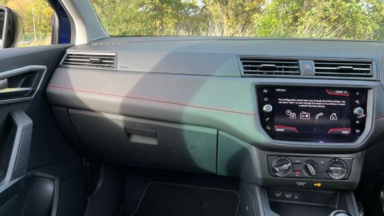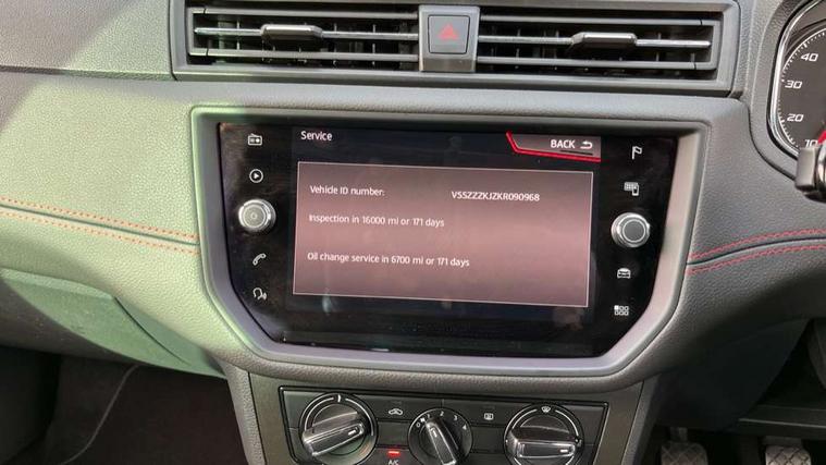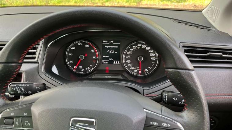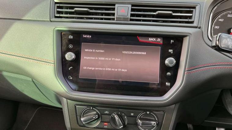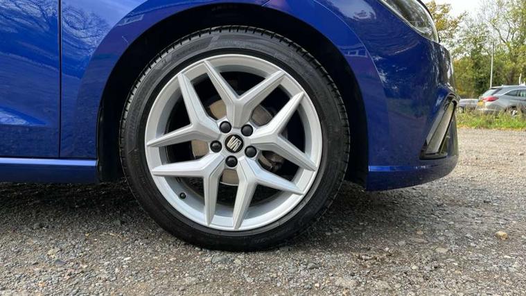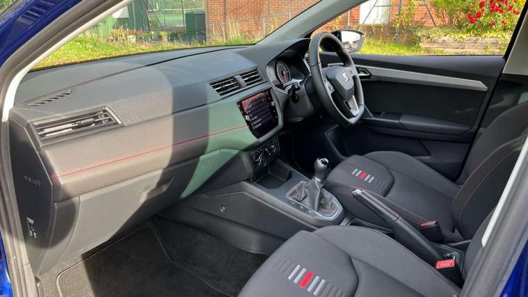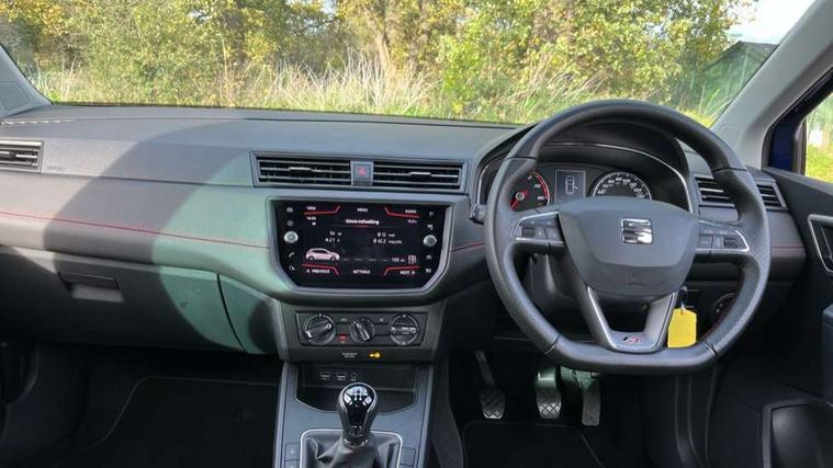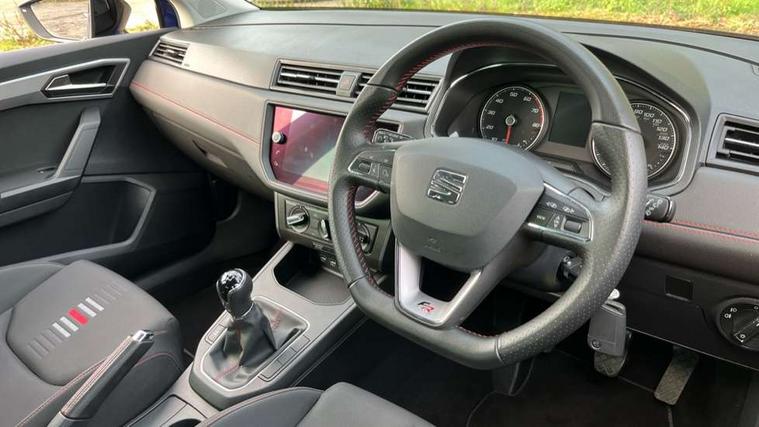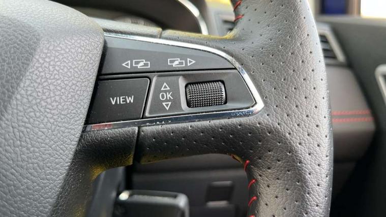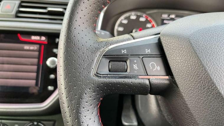 'Lights On' Reminder warning buzzer, Bluetooth Handsfree Phone Connection, Cruise control, Digital clock, Full Link Smartphone Integration with Mirror Link, Apple Car Play, Google Android Auto, Low fuel warning light, Outside temperature gauge, Satellite navigation system with 3D mapping, 8" touch screen, voice control and additional USB port, SEAT Drive profile, SEAT logo boot release, Speed sensitive power steering, Trip computer, Sports suspension, 6 speakers, Auxiliary input socket, CD player, Digital Audio Broadcast (DAB) Tuner, Radio/MP3 player, SD card slot, SEAT USB media cable, Steering wheel mounted controls, USB port, Anti theft roof antenna, Auto dimming rear view mirror, Automatic headlights, Automatic rain sensing wipers, Body colour bumpers, Body colour door handles, Brilliant black door mirrors, Chrome front grille frame, Chrome grille, Coming/leaving home lighting function, Cornering front fog lights, Dark tinted rear windows, Electric folding door mirrors, Electric front windows, Electric headlight adjustment, Electrically adjustable and heated door mirrors, Exclusive FR rear bumper, Full LED headlights, LED daytime running lights, LED tail lights, Rear fog lights, Twin exhaust pipes, 3 rear headrests, 60/40 split folding rear seat, Air conditioning, Door and steering wheel ice metal decorative inserts, Driver's sunvisor with ticket holder/vanity mirror, Dust/pollen filter, Flat bottomed perforated leather steering wheel with red stitching and FR logo, Front courtesy lights, Front cupholders x 2, Front reading lights, Gear shift indicator, Glovebox, Height adjustable driver's seat, Height adjustable front/rear head restraints, Height adjustable passenger seat, Height/reach adjust steering wheel, Illuminated boot, Instrument lighting with brightness control, Leather handbrake, Leather steering wheel and gear knob, Multi-colour ambient interior lighting, Nora cloth upholstery, Passenger sunvisor, Rear top tether child seat ISOFIX attachment, Sports seats, Full LED headlight pack - Ibiza, 3 point seatbelts on all 3 rear seats, ABS, Active front headrests, Child locks on rear doors, Curtain airbags, Driver/Front Passenger airbags, ESP+EBA, Front assist (AEB), Front passenger airbag deactivation, Front side airbags, Hill hold control, Multi-Collision braking, Seatbelt warning, Tiredness recognition system, Tyre pressure monitoring system, 2 folding remote keys with window open/close function, Electronic engine immobiliser, Locking wheel bolts, Remote central locking + deadlocks, Volumetric alarm with back up horn, Black dash trim, Leather dashboard, 17" Dynamic alloy wheels,