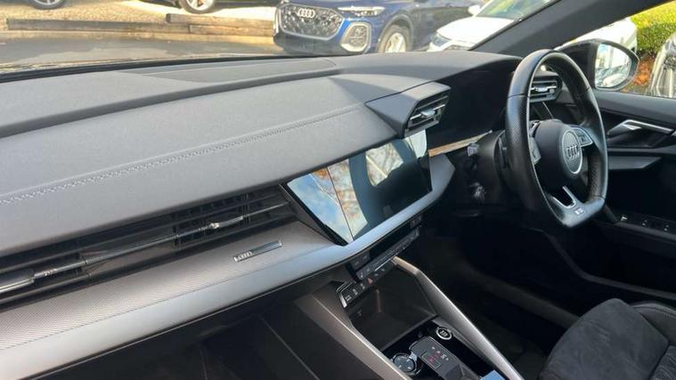 Audi connect emergency call and service, Audi drive select (Auto, Comfort, Dynamic, Efficiency and Individual), Audi smartphone interface, Audi virtual cockpit plus - 12.3" dynamic digital instrument cluster, Automatic start/stop system with recuperation, Bluetooth interface, Collision avoidance assistant, Electromechanical power speed sensitive steering, Lane departure warning system, MMI Navigation Plus with high resolution 10.1" colour touch screen display, Service indicator, Voice control system with natural language interaction, Sports suspension, 2x USB Type C ports (for charging and data transfer), 6 passive loudspeakers, CD player, DAB Digital radio, 3rd brake light, Acoustic glass windscreen, Audi matrix LED headlights, LED rear lights, dynamic front and rear indicators and headlight cleaning system, Auto dimming frameless rear view mirror, Electrically adj heated/folding + automatically dimming exterior mirrors + automatic kerb side function for passenger side exterior mirror, Front electric windows, Illuminated door sills with aluminium inserts at the front with S logo, Integrated LED indicators in door mirrors, LED daytime running lights, Light and rain sensors, Model and engine designation badges at rear, Privacy glass - dark tinted rear window, rear door and side windows, Rear electric windows, S roof spoiler, 12V socket and storage compartment in front centre console, 4 way electrically adjustable lumbar support for driver and front passenger, 40/20/40 split folding rear seat bench with cupholder, Black cloth headlining, Dual zone electronic climate control, Electrically adjustable front seats, Front and rear centre armrest in leather, Front and rear headrests, Front/rear floor mats, Heated front seats, Height and reach adjustable steering wheel, Interior lighting - glove compartment light and right hand side, Luggage compartment floor covering, Seat side bolsters, Stainless steel pedals and front footrest in black, Aluminium interior elements pack - A3, Black styling pack - A3/S3, Dinamica microfibre/mono.pur 550 artificial leather pack - A3 Saloon, Extended ambient lighting pack - A3/S3 Saloon, LED interior lighting pack - A3 Saloon Edition 1/Vorsprung, 3x3 point rear seat belts, Driver and front passenger airbag with passenger airbag deactivation, Electronic Stabilisation Control (ESC) including ABS, ASR and EDL, First aid kit with warning triangle and 2 safety vests, Front side airbags with head airbags and interaction airbag, Hill hold assist, Pre-sense front with pedestrian and cyclist detection, Seatbelt monitoring, Tyre pressure loss indicator, Anti theft alarm, Anti-theft wheel bolts, Electronically operated child lock, Immobiliser, Remote control central locking, Aluminium air vent surrounds, Aluminium trim elements, Dark spectrum aluminium inlays, accent surfaces in the dashboard and centre console in platinum grey silk effect paint finish, 19" 5 arm trapezoid design alloy wheels in titanium matt grey with diamond cut finish,