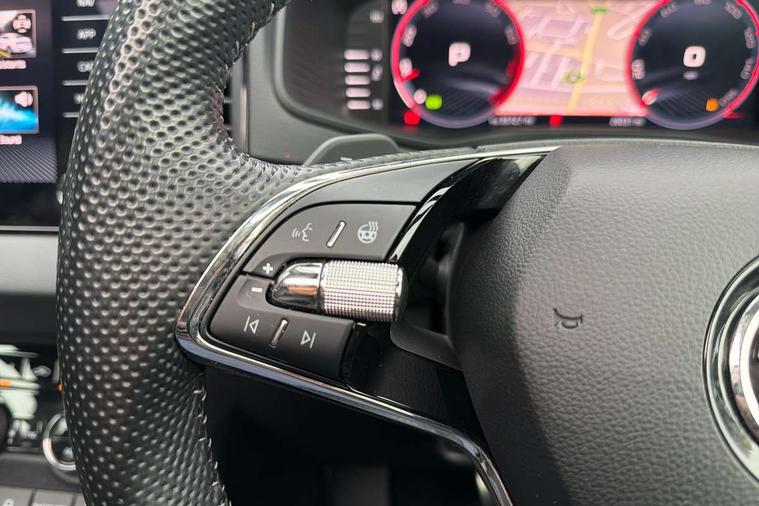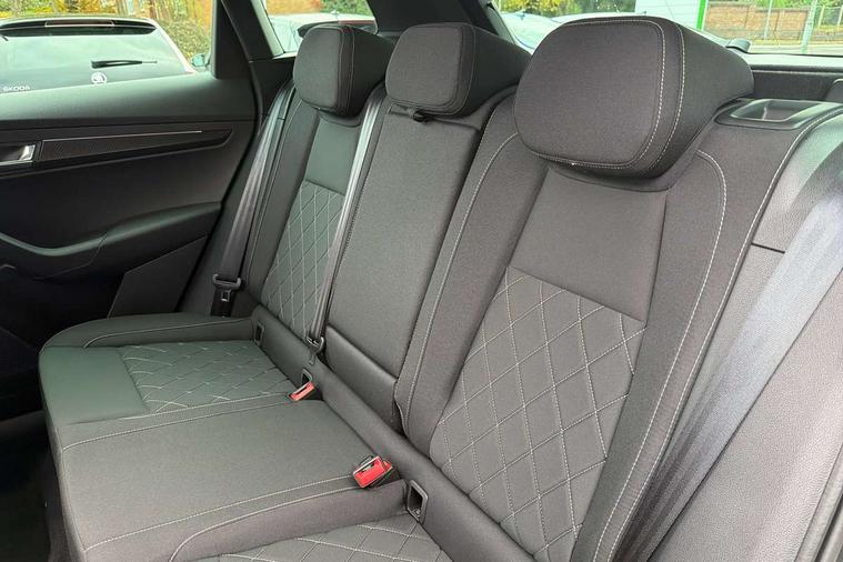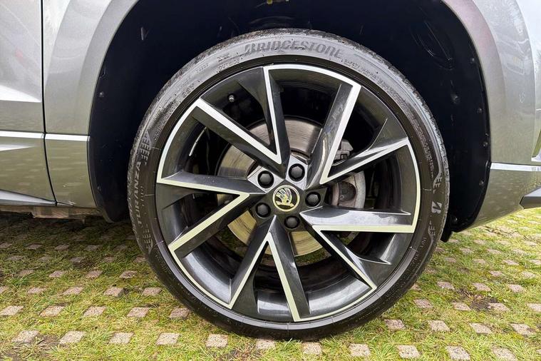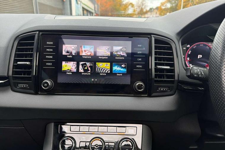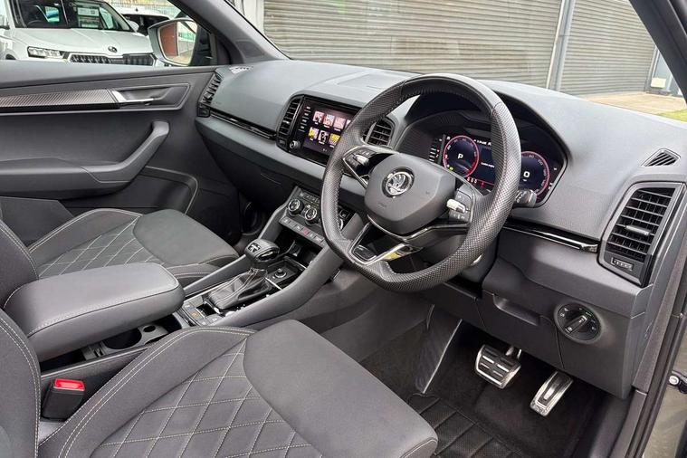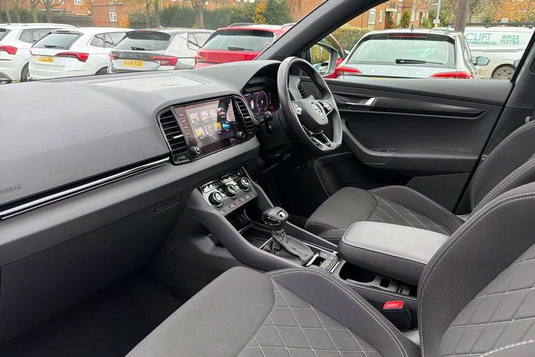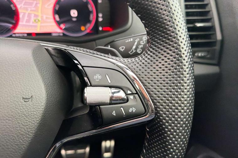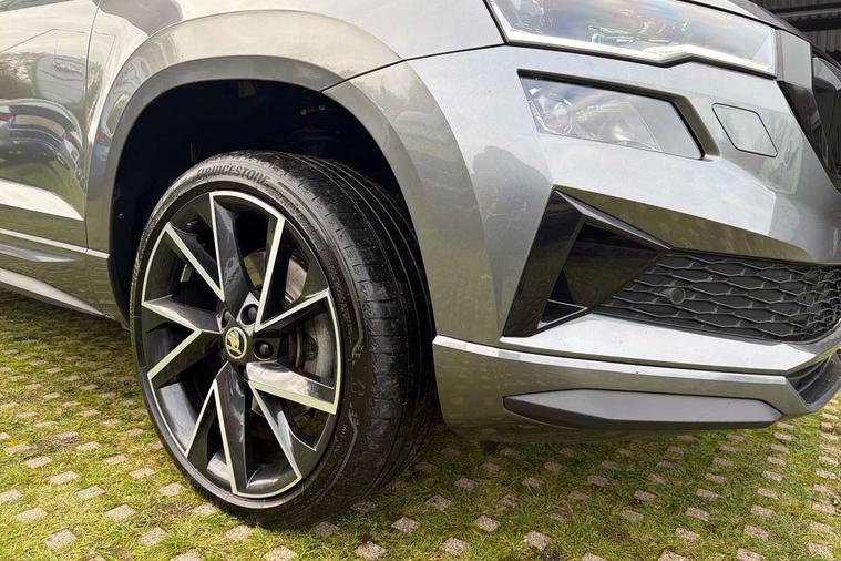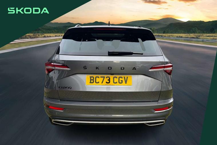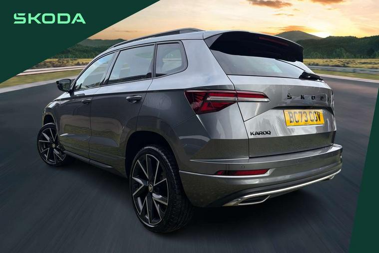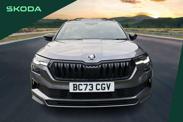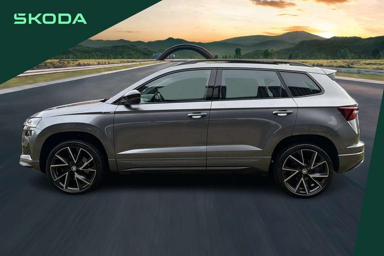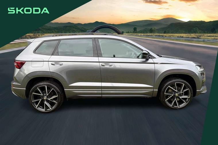 8" Digital display, Care connect, Driver fatigue sensor, Emergency services call system, Outside temperature gauge, Service interval indicator, SmartLink wireless for Apple and wired for Android, Start/stop system with regenerative braking, USB C Port x 2 in front centre console, Virtual cockpit, Virtual pedal with electrically operated boot door, 8 Speakers, DAB radio with Bluetooth, USB connection, Wireless charging without wireless aerial connection, Acoustic glass, Aero front windscreen wipers with intermittent function, Auto dimming rear view mirror with light and rain sensors, Black door mirrors, Black electric window control buttons, Black radiator grille, Black roof rails, Body colour door handles, Electric front and rear windows with child proof lock, Front door steps with SportLine logo, Heated rear windscreen, LED daytime running lights, LED rear lights with high functionality welcome effect and dynamic indicators, Light assistant (coming/leaving home/tunnel light), Panoramic sliding sunroof, Plastic scuff plates, Privacy glass, Protective door side sills in body colour, Rear diffuser, Rear side wing doors, Rear spoiler, Rear window wiper with washer system and intermittent control, Safety reflectors on front doors, Skoda lettering on tailgate in black, Sportline badge on front fender, Sportline decorative inserts with badging, Sports front and rear bumpers, 1.5 litre bottle holders in driver and front passenger door panels, 12V socket in boot, 12v socket in front centre armrest with storage compartment and rear air vents, 3 rear height adjustable headrests, 3 seat bench in 2nd row, 3 spoke leather sports multifunction steering wheel and silver stitching with gear shift paddles, 4 foldable roof handles with rear coat hooks, Black floor carpet, Black roof headlining, Chrome inner door handles, Double sided boot floor, Foldable hooks in the boot, Front head restraints, Height adjustable front three point seats belts with tensioners, Height/reach adjust steering wheel, Ice scraper, Illuminated glovebox, Illuminated luggage compartment, Isofix child seat preparation outer rear, Manual lumbar support for front seats, Pen holder, Pollen filter, Rear boot cover, Rear reading lights, Rear seats fixed folding and divided 60:40, Rubbish bin door, Safety vest holder, Single front passenger seat, Storage box in upper central dashboard closed, Sunvisors with illuminated vanity mirrors, Textile floor mats, Ticket holder, Titan black interior ceiling, Welcome animation with sportline logo, Boot pack - Karoq, Light Pack - Karoq, Parking pack - Karoq, Automatic door unlocking in case of crash, Automatic fuel cut off in case of crash, Child locks on rear doors, Driver airbag, Electronic parking brake with auto hold function, Emergency rear braking signal, ESC including ABS, MSR, ASR, EDS, HBA, DSR, RBS, MKB and traction control, Front side airbags, Hill hold control, Knee airbags, Passenger airbag with switch-off function, Pedestrian monitor, Seatbelt reminder signalisation and pretensioner for all seats, Three point seatbelts rear, Two tone horn, Tyre pressure display, Tyre pressure monitor, Alarm with interior monitoring, back up horn and tilt sensor with safe function, Electronic engine immobiliser, Keyless entry and start/stop, Remote central locking with 2 remote folding keys, Black air vent surround, Black centre console, Satin black dashboard, Satin black door trim, 19" Sagitarius anthracite alloy wheels with matt black aero inserts, Anti-theft wheel bolts protection, Matt black aero hub caps, Tool kit,