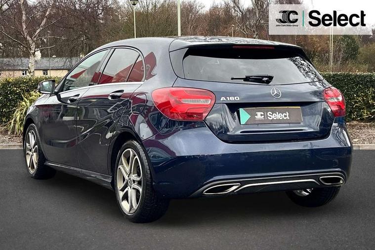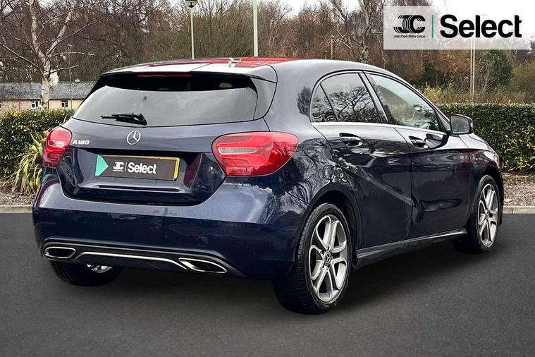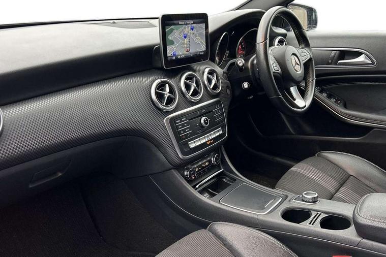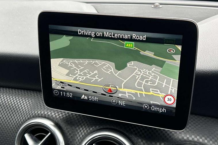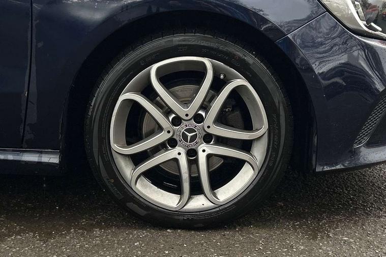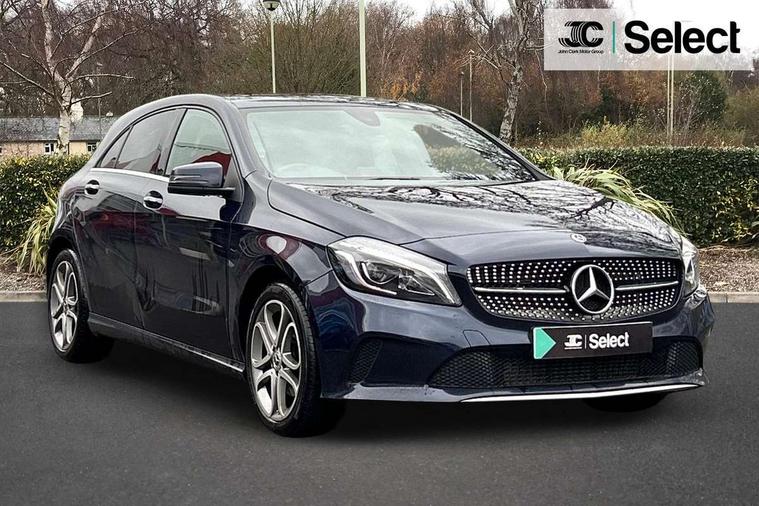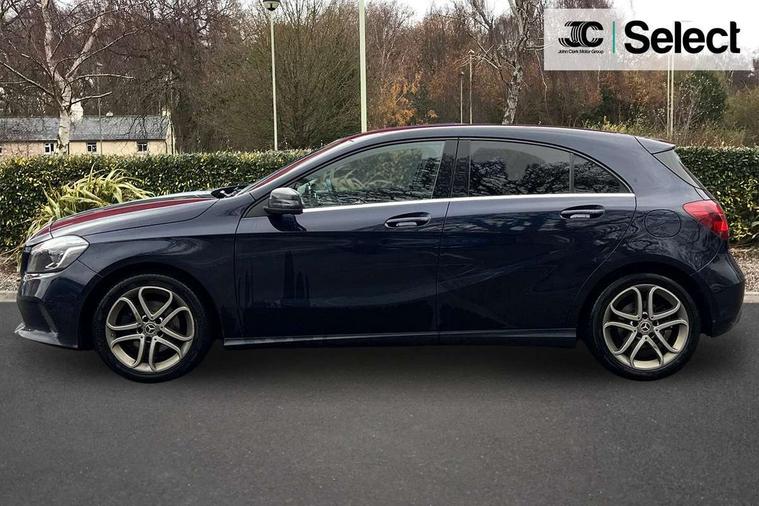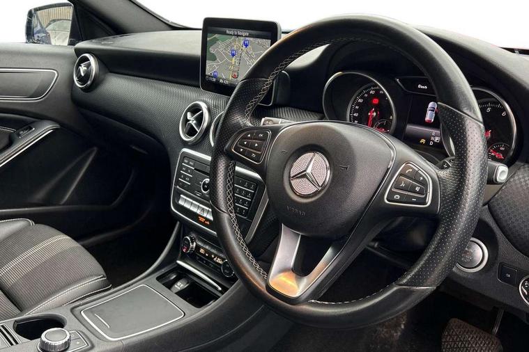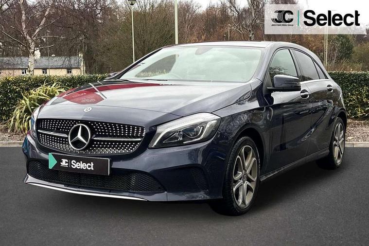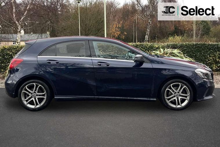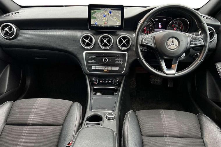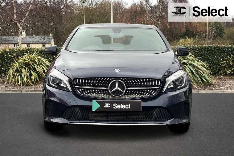 8" colour display screen, Attention assist, Bluetooth interface for hands free telephone, Bulb failure indicator, Collision prevention assist plus, DYNAMIC SELECT with a choice of driving modes (ECO, Comfort, Sport, Sport+ and Individual), External temperature gauge, Garmin Map pilot navigation system with SD Card, Low fluid warning light, Reversing camera, Service indicator (ASSYST PLUS), Smartphone integration with Apple CarPlay, Speed sensitive parameter assisted steering, Speedtronic cruise control, Trip computer, Comfort suspension, Media interface, Mercedes Audio 20 radio/single CD + telephone keypad, SD card slot, USB port, Adaptive brake lights, Body colour bumpers, Body colour door handles, Body colour side skirt, Body coloured door mirrors, Chrome beltline trim, Diamond radiator grille with black pins with one louvre in silver + chrome insert, Electric adjustable heated door mirrors, Electric front windows, Electric rear windows, Headlamp assist, Heated rear window with timer, LED daytime running lights, LED Headlights, LED tail lights, Privacy glass, Rain sensor windscreen wipers, Rear wiper, Twin Trapezoidal tailpipes, 1/3 to 2/3 split folding rear seats, 12V socket, 3 spoke perforated leather multifunction sports steering wheel, ARTICO man-made leather/Maringa cloth upholstery, Auto Mercedes-Benz child seat recognition sensor, Black headlining, Dual zone automatic climate control, Footwell lights, Front and rear reading lights, Front centre armrest with storage compartment, Front head restraints, Front sport seats, Gearshift paddles on steering wheel, Height adjustable front seats, Height/reach adjustable steering column, Illuminated door sills, Illuminated glovebox, Illuminated storage compartment, Isofix rear child seat preparation, Load securing rings in luggage compartment, Luggage compartment cover, Rear head restraints, Storage compartment under load area floor, Sunvisors with illuminated vanity mirrors, Twin front cupholders, Seat comfort pack - A Class, 3 rear 3 point seatbelts, ABS with Brake Assist, Active bonnet, Adaptive brake system, Black seat belts, Child proof door locks, Crash responsive emergency lighting, Drivers knee airbag, Dual stage driver/passenger airbags, Electronic parking brake, ESP with ASR, Front and rear seatbelt reminder, Front head airbags, Front passenger seat occupancy sensor, Front side airbags, Hill start assist, Tyre pressure monitoring system, Warning triangle and first aid kit, Window airbags, Alarm system/interior protection/immobiliser, Keyless ignition, Remote central locking, Checked pattern trim, Chrome air vent surrounds, 17" 5 twin spoke alloy wheels painted in black with high sheen finish, Tirefit sealant with electric air pump,