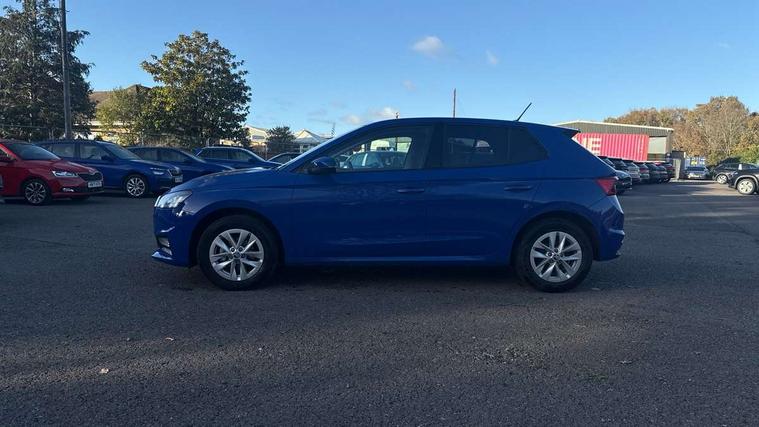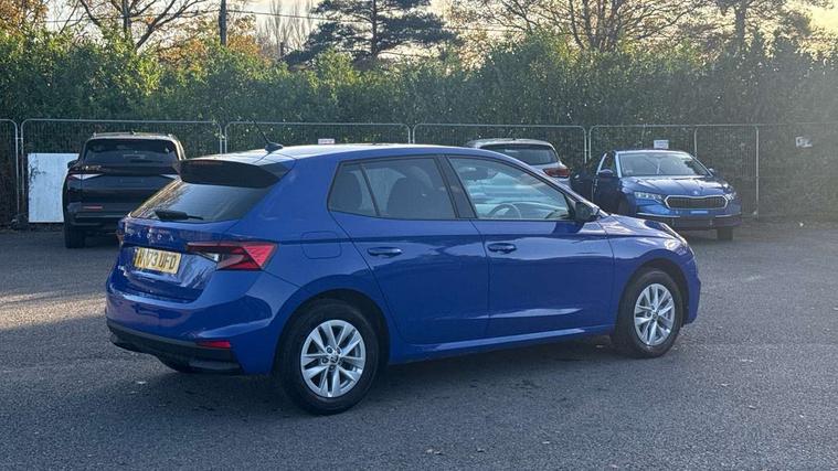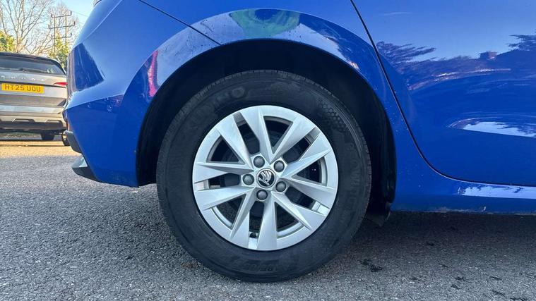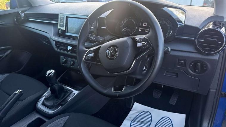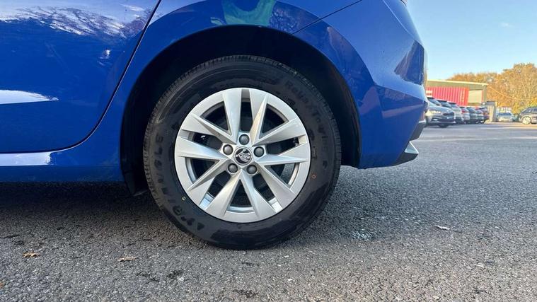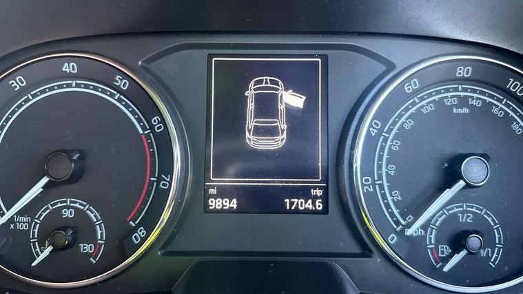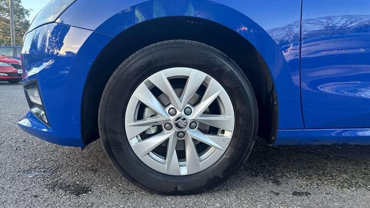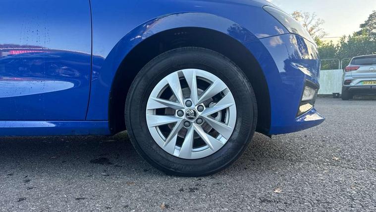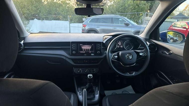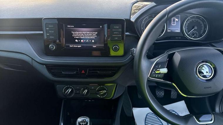 Bluetooth connection, Driver alert system - DAS, Electromechanical power steering, Exterior temperature gauge, Lane assist including road edge detection, Multifunction trip computer in black and white, Service interval indicator, Speed limiter, 2x USB-C in the front (for data transmission and charging), 4 speakers in front, Auxiliary socket for external MP3 player, DAB digital radio reception, Radio Swing with 6.5" colour display, Basic LED Headlights, Body colour door mirrors, Body coloured bumpers, Dimming rear view mirror with black frame, Door mirror integrated indicators, Electrically adjustable and heated door mirrors, Electrically adjustable front windows with function auto up/down, Front fog lights, Front window wiper intermittent control, Headlight range control - Automatic, Ice scraper in fuel cap, LED daytime running lights with coming and leaving home feature, Mechanical adjustable rear windows, Rain sensor, Rear LED fog light, Rear side wing doors, Rear window wiper with washing nozzles, Roof mounted spoiler, SKODA tailgate lettering in chrome, Third brake light, 2 reading lights in front and 2 reading lights in rear, 2 spoke leather multifunction steering wheel, 3 rear headrests, Backrest split and folding, Central console with fixed cup holder and storage box, Chrome handbrake release button, Fabric upholstery, Gearshift knob/handle in leather, Grain satin black interior door handles, Hand brake lever handle in leather, Height adjustable front headrests, Height adjustable front seats, Height adjustable steering wheel, ISOFIX and TopTether anchorage points to the outer rear seats, ISOFIX and TopTether on the front passenger seat, Luggage compartment lighting, Manual air conditioning, Manually adjustable lumbar support in front seats, Pollen filter, Rear seat bench unsplit, Single front passenger seat, Storm grey headlining, Sun visors with mirror and airbag label on passenger side, Ticket holder, 3-point height adjustable front seats belts with pretensioner and force limiter, Automatic warning lights in case of crash, Driver and passengers airbag with switch off function, e-Call+, ESC including ABS, MSR, ASR, EDS, HBA and XDS, Front and rear seat belt warning, FRONT ASSIST (AEB City and AEB Inter Urban), Front side airbags, Head airbags, One tone horn, Pedestrian protection, Three rear 3-points safety seat belts with pretensioner and force limiter including stop function for outer rear seat belts, Tyre pressure monitoring system, Anti-theft alarm system including immobiliser, interior monitoring, backup horn, and towing protection, Central locking with radio remote control, interior controls, SAFE function and 2 foldable keys, Black painted air vents, Glossy black decorative trim, Grain satin black central console cover, Grain satin black lower decorative trim, Satin black door and side trim panel in front, Anti-theft wheel bolts protection, Super-low rolling resistance tyres,