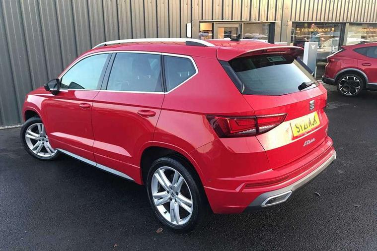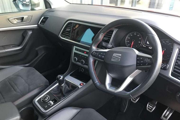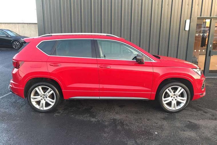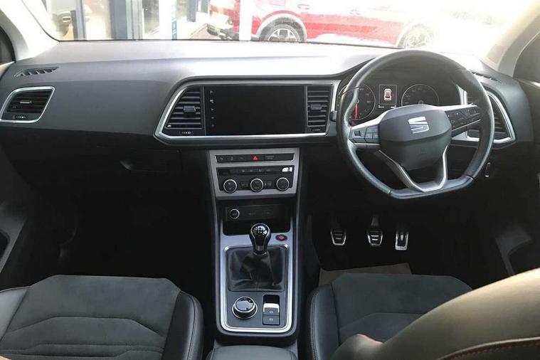 Cruise control system with speed limiter, Outside temperature gauge, Progressive power assisted steering, SEAT drive profile with driving experience button - Normal, Sport, Eco and Individual mode, steering and throttle response, Self parking functionality (includes front and rear parking sensors), Trip computer, Wireless full link smartphone integration, Wireless phone charger, Steering wheel mounted audio/phone controls, Body colour bumpers, Body coloured wheel arch surrounds, Chrome roof rails, Chrome side window trim, Cosmo grey front grille frame, Dark tinted rear windows, Daytime running lights, Door mirrors with welcome light silhouette, Dynamic headlight range control with self adjusting whilst driving, Electric adjustable/heated/folding door mirrors, Front and rear electric windows, Full LED headlamps with lens and LED front fog lamps with cornering function, Illuminated aluminium front door sill, LED rear tail lights with dynamic indicators, Rear fog lights, Rear spoiler, Rear wash/wipe, Simulated exhaust pipes in chrome frame, 12V socket in front, 60/40 split folding rear seat, Aluminium pedals, Dual zone climate control, Front and rear head restraints, Front centre armrest, Front seat back storage pockets, Height adjustable driver and passenger seat with lumbar adjustment, ISOFIX points in outer rear seats with top tether anchorage points, Leather steering wheel and gear knob, Microsuede upholstery with front sports seats, Multicoloured ambient lighting with LED interior illumination, Rear armrest and easy back seat release mechanism from boot, Storage compartment in roof console for sunglass, Storage compartment under driver's seat, Convenience pack - Ateca, Interior lighting pack - Ateca, Navigation system pack with DAB - Ateca, 3x3 point rear seatbelts, ABS, Traction control system (TCS), Electronic stability control (ESC) and Electronic differential lock system (XDS), Airbags - Driver and front passenger airbag with deactivation, front side, two curtain and driver's knee airbags, Electric parking brake with auto hold function, Front and rear seatbelt reminder, Front assist with autonomous emergency braking, Hill hold control, Tiredness recognition system, Traction control, Tyre pressure monitoring system, Alarm, Keyless entry, Locking wheel bolts, Chrome interior detailing, 18" Brillaint silver alloy wheels,