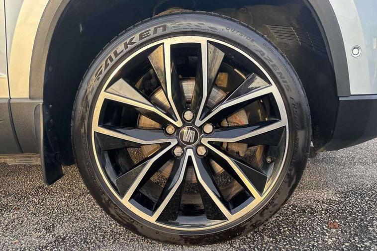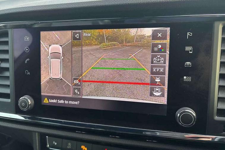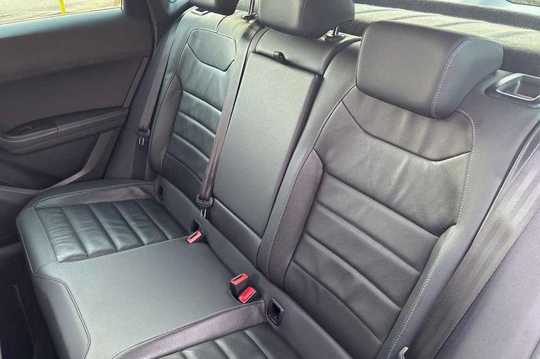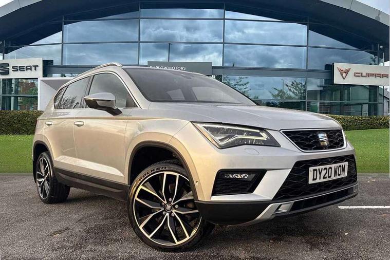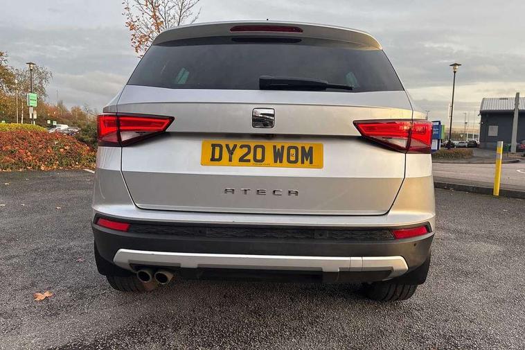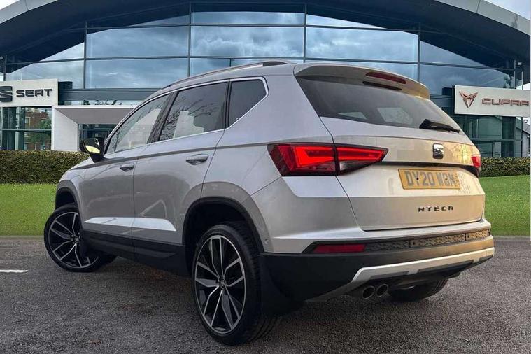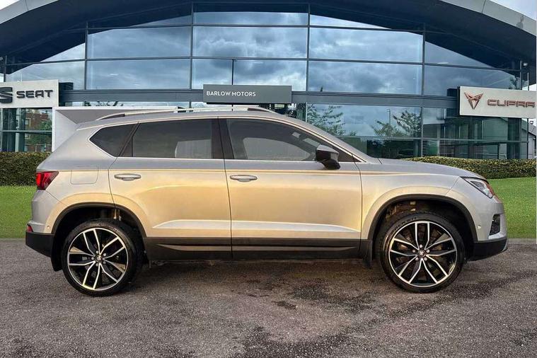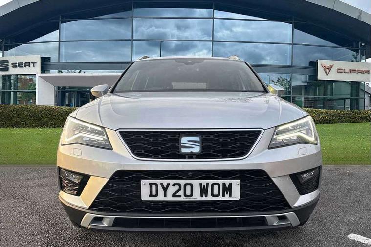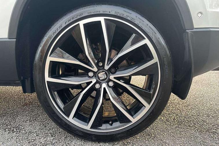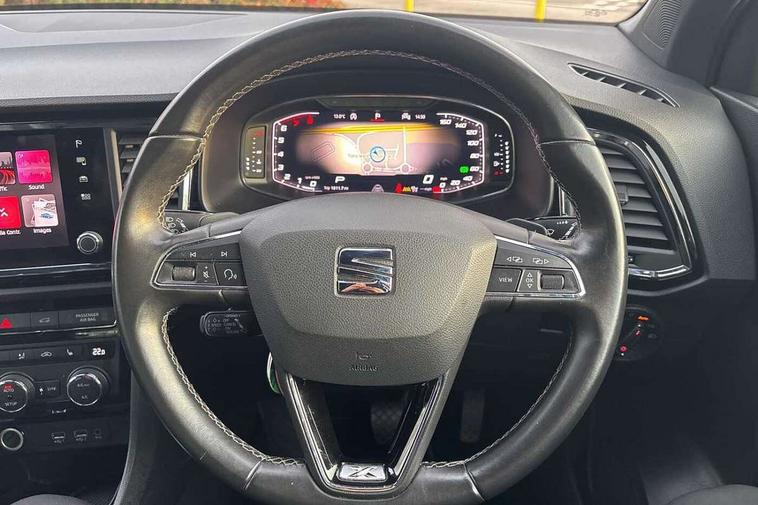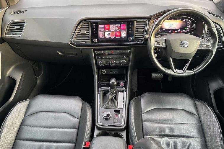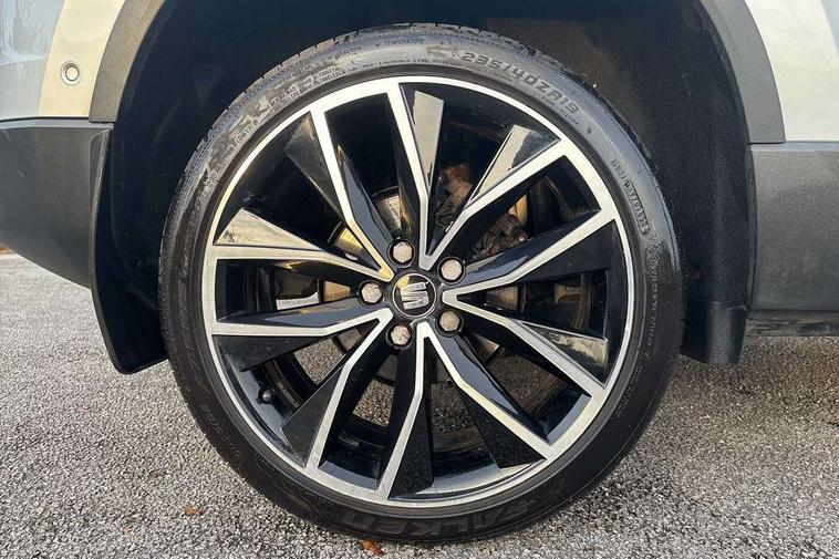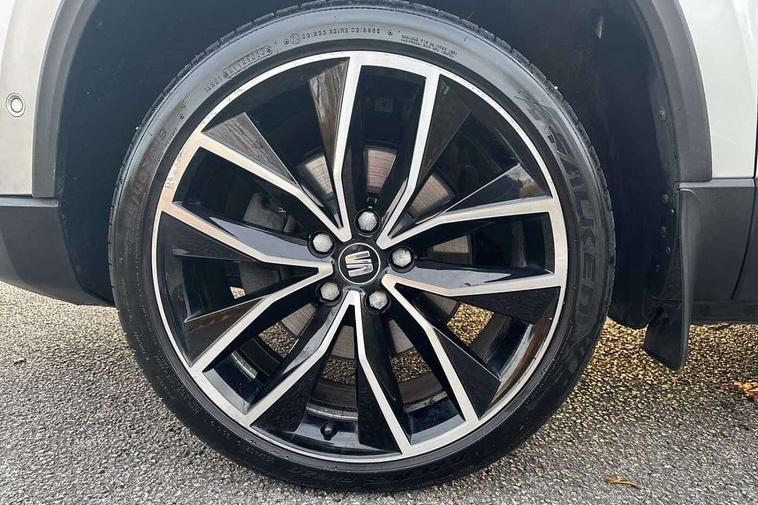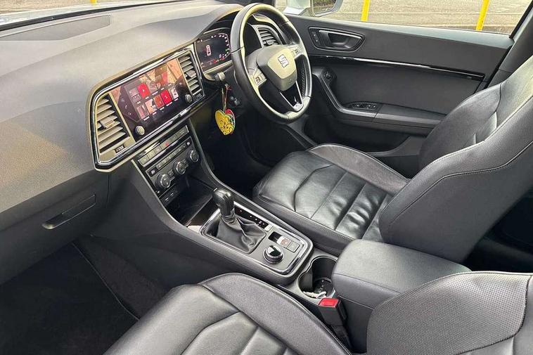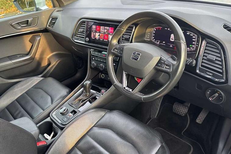 'Lights On' Reminder warning buzzer, Adaptive cruise control, Digital clock, Digital cockpit, Driver alert system, Electric tailgate with virtual pedal, Front assist city emergency braking and pedestrian protection, Full Link Smartphone Integration with Mirror Link, Apple Car Play, Google Android Auto, Low fuel warning light, Multi function display, Outside temperature gauge, Power assist steering, Rear view camera, Remote fuel flap release, RPM counter, Satellite navigation system, SEAT drive profile with driving experience button, SEAT logo boot release, Self parking functionality (includes front and rear parking sensors), Top view camera, Trip computer, Wash water level indicator, Comfort suspension, XDS electronic differential lock, SEAT USB media cable, Steering wheel mounted audio/phone controls, Aluminium front door sills, Armrest with air outlet in rear, Auto dimming rear view mirror, Auto headlights with automatic coming and leaving home function, Black wheel arch extensions, Body colour bumpers, Body colour door handles, Body colour door mirrors, Chrome front grille frame, Chrome roof rails, Chrome side window trim, Dark tinted rear windows, Door mirrors with welcome light silhouette, Electric adjustable/heated/folding door mirrors, Frameless interior mirror, Front and rear electric windows, Front grille in glossy black, Full LED headlights, Headlight washers, Heated windscreen, Illuminated aluminium front door sill with trim logo, LED daytime running lights, LED front fog lights, Rear fog lights, Rear LED tail lights, Rear wash/wipe, Twin chromed exhaust pipes, Visible dual exhaust pipes, 12V socket in front, 4 Lashing eyes in boot, 60/40 split folding rear seat, Adjustable front armrest with storage compartment, Ambient spot lighting and front footwell illumination, Black roof lining, Driver and passenger seats, height-adjustable, with lumbar adjustment and height-adjustable headrests, Driver and passenger sun visor, covered and illuminated mirror, driver sun visor with card holder, Dual zone climate control, Front and rear head restraints, Front courtesy lights, Front cupholders, Front reading lights, Front seat back storage pockets, Gear shift indicator, Heated front seats, Illuminated boot, Illuminated glovebox, Instrument lighting with brightness control, ISOFIX points in outer rear seats with top tether anchorage points, Leather steering wheel and gear knob, Leather upholstery with front sports seats, Multicoloured ambient lighting with LED interior illumination, Rear armrest and easy back seat release mechanism from boot, Rear reading lights, Steering wheel gearshift paddles, Storage box under drivers seat, Advanced Driving Assistance Pack - Ateca Xcellence, Convenience pack - Ateca, Navigation system pack - Ateca, Winter Pack - Ateca, 3x3 point rear seatbelts, ABS, Automatic post collision braking, Driver/Front Passenger airbags, Drivers knee airbag, Electronic parking brake with auto hold, Electronic stability control, ESP+EBA, Front and rear seatbelt reminder, Front passenger airbag deactivation, Front side airbags, Hill hold control, Tiredness recognition system, Traction control, Twin curtain airbags, Tyre pressure monitoring system, 2 folding remote keys with window open/close function, Immobiliser, Keyless entry and go and connectivity hub with wireless charger, Locking wheel bolts, Remote central locking, Volumetric alarm with back up horn, Chrome interior detailing, 19" Exclusive machined bi-colour alloy wheels,