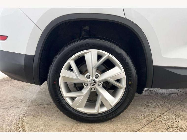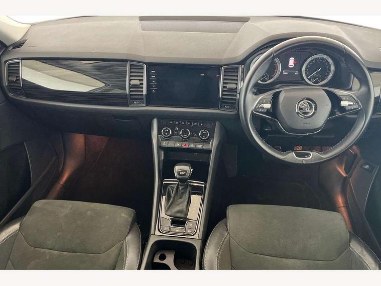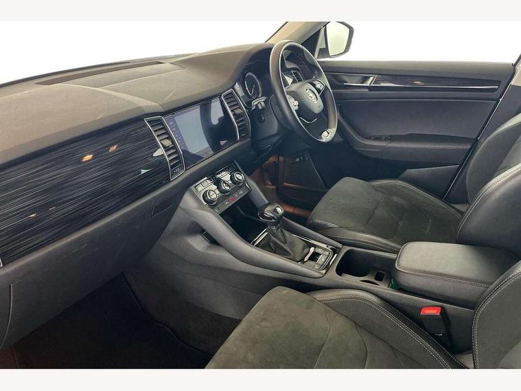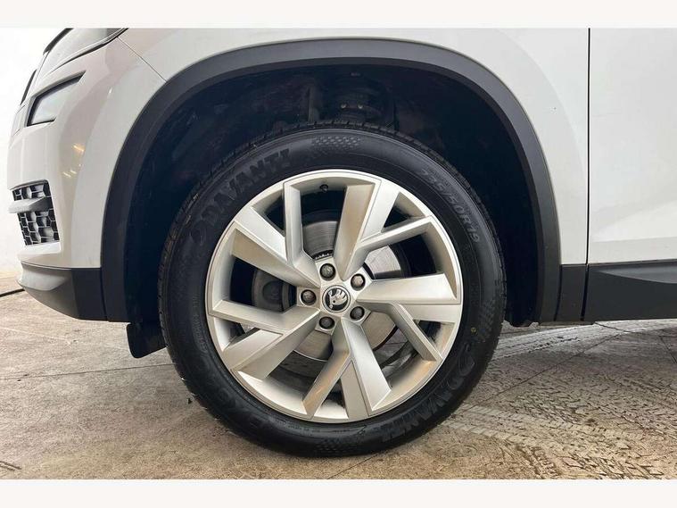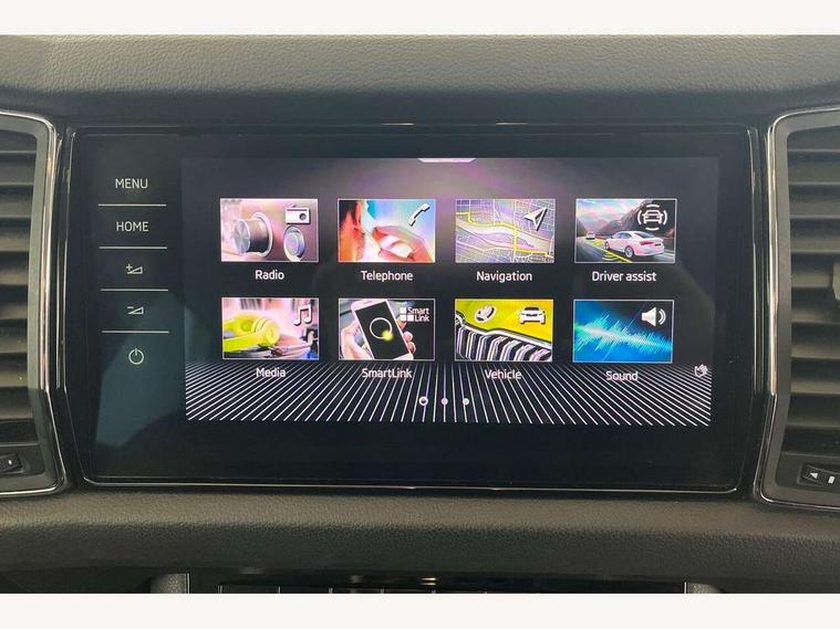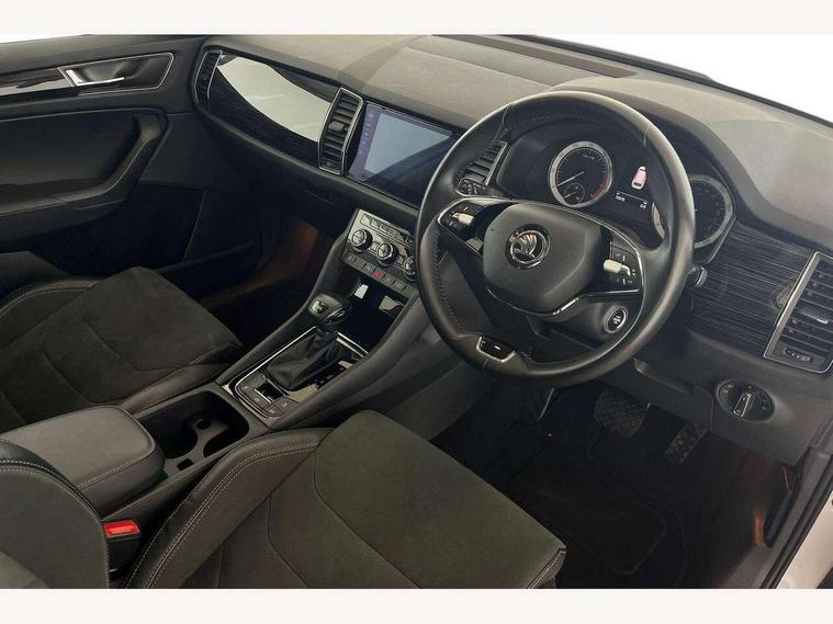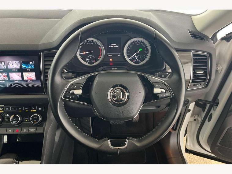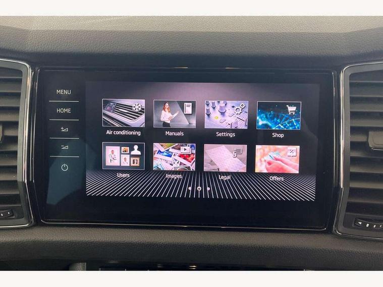 Bluetooth system, Digital voice enhancement, ECO Stop/start function, Exterior temperature indicator, Map care, Smartlink wireless for apple carplay and wired for android auto, Speed limiter, USB C Port x 2 in front centre console, Bolero Radio, DAB Digital radio, DVD System, Aero front windscreen wipers with intermittent function, Aero rear window wiper, Auto dimming rear view mirror, Automatic activation of hazard warning lights, Black electric window control buttons, Black wheel arch surrounds, Body colour bumpers, Body colour door mirrors and handles, Electric front and rear windows, Electrically adjustable, heated and folding door mirrors, Front and Rear door steps, Full LED Headlights with adaptive front light system and LED daytime running lights, Headlight washers, Heated rear window, Invisible tailpipe, LED front fog lights with static cornering light function, LED rear fog light, LED third brake light in rear spoiler, Light assistant (coming home/tunnel light), Radiator grille frame in matt black with chrome strip, Rain and light sensors, Rear spoiler, Safety reflectors on front and rear doors, Sunset privacy glass, 12V socket in boot, 2 rails with 2 hooks including 4 hooks for net programme, 4 foldable roof handles with rear coat hooks, 4 lashing points on luggage floor, 60:40 foldable rear seat with sliding adjustment and backrest angle adjustment, Bottle holders in door panel in the 1.5 litre front and 1 litre rear, Cargo storage compartments, Centre console with open storage box, cup holder and 12V socket, Chrome headlight control button, Chrome interior door handles, Coat hooks on B pillar, Covered storage compartment on driver side, Front and rear door armrest with black adductor trim, Front and rear height adjustable headrests, Front centre armrest with storage compartment, cup holder and 12V socket, Front courtesy lights, Gear shift lever with chrome frame and black gloss insert, Illuminated and cooled glovebox, Illuminated luggage compartment, Isofix child seat fittings in outer rear seats with top tether, Manually adjustable steering column, Net programme in boot (1x horizontal Net, 2x vertical Nets), Overhead glasses storage compartment, Pollen filter, Rear centre armrest with cupholders, Roll up luggage compartment cover with intermediate position, Small Bags on the inner sides of the front backrests, Storage compartment in lower middle instrument panel with closing, Three rear height adjustable headrests, Ticket holder on A Pillar, Umbrella in door panel, Chrome pack - Kodiaq, Auto door release and activation of warning lights, Driver and passenger airbags, Electronic parking brake with hill hold control, Emergency rear braking signal, ESC (incl. ABS+MSR+ASR+EDS+HBA+DSR+RBS+MKB), Front and rear three point safety belt on all seats, Front assist includes AEB city/urban, Front passenger airbag deactivation switch, Front side airbags, Fuel cut off safety device, Head and knee airbags, Rear disc brakes, Safety vest holder in door, Seat belt reminder for all seats, Tailgate unlocking from outside, Two tone horn, Tyre pressure monitor, Warning lights in front doors, Alarm with interior monitoring and tilt sensor with safe function, Immobiliser, Keyless entry and start system (KESSY), Remote central locking,