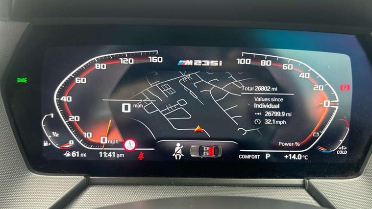 Active guard plus, Attentiveness assist, Auto start-stop, BMW ConnectedDrive online services, BMW Intelligent Personal Assistant, BMW Live Cockpit Professional with 10.25" high resolution instrument and control display, BMW Online services, BMW operating system with 7.0 mid interface, BMW Teleservices, Check Control warning system for monitoring of lights and door/luggage compartment open warning, Cruise control with braking function, Electro hydraulically controlled multi plate clutch in rear axle, Energy efficient operating strategy, iDrive controller with 7 short cut favourite buttons on centre console, Integrated navigation data with map data via USB +features such as 3D landmarks and micro city models, Integrated owners handbook, Intelligent voice assistant, Lane departure warning system, M Sport steering with M235i xDrive M performance specific settings, On board computer - average speed+fuel consumption, service interval, clock/date, odometer/trip meter, outside temperature display and ice warning, Optimum shift indicator, Personal Profile, Pull away assistant, Speed limiting function, 2 balance shafts, 8 speed sport automatic transmission with electronic selector lever, auto P function, coasting idle, race track, sport, gearchange display manual mode, Aluminium lightweight construction, BMW TwinPower twin-scroll Turbo four-cylinder petrol engine, Double VANOS, Drive performance control with ECO PRO comfort + sport mode, Electronic differential lock, Engine cover with M performance designation, High precision injection, Larger fuel tank capacity (50 litres), Launch control, M235i specific heavily de-throttled engine intake air guide, M235i specific high-performance cooling package, M235i specific larger turbocharger with integrated divert-air valve, Performance Control, Petrol Particulate Filter, Power transmission of front wheel drive on the rear axle via angle transmission on the front axle differential and two part cardan shaft, VALVETRONIC engine management, Variable, stepless and infinitely adjustable distribution of drive torque between the front and rear axles, xDrive intelligent all wheel drive with M235i specific reinforced components, 2x USB Type C ports (for charging and data transfer), 4G LTE Connectivity with hard wied 4G network sim card, DAB digital radio, MP3 players and RDS double tuner, Auto wipers, Automatically dimming rear view mirror, Body colour door handles, Direction indicator side lights integrated exterior mirrors, Electric windows - front and rear, with open/close fingertip control and trap release, Exterior mirrors - electrically folding with anti-dazzle, Fading support, Follow me home headlights, Front and rear bumper system with replaceable deformation elements, Front door sill finishers in black plastic with M235i designation, Heated, electrically adjustable exterior mirror aspheric on driver side, convex on passenger side, High gloss black B pillar finish, High gloss shadow line exterior trim, High level third brake light, LED daytime running lights, Lightweight engineering, M Performance exhaust system with valve control and minimised exhaust back pressure, M rear spoiler, Model designation on right side of tailgate includes xDrive designation onleft handside for M235i xDrive, Preparation for high beam assistant, Rain sensor with automatic headlight activation, Rear boot, Rear fog lights, Rear side wing doors, Reinforced crank drive, new pistons and adapted con rods, Reversing light in rear light cluster, Welcome lighting, 12V power socket in centre console, 2 cupholders in front centre console, 3 rear seat head restraints, 3 rear seats, 3 spoke M sports design leather steering wheel finished in nappa leather with specific M badge, Additional under floor storage in luggage compartment, Anthracite finished floor mats with contrasting surround, Anthracite headlining, Automatic two zone climate control air conditioning, Child seat ISOFIX attachment for two outer rear seats and front passenger seat with anchorage points, Conditioned based service, Driver and front passenger seat heating, Front and rear door pockets including bottle trays, Front and rear side armrests integrated into door trim, Front armrest foldable with integrated storage compartment, Front centre interior light over interior mirror and rear centre automatic interior light when door is opened/ignition switched off or via remote key, Front head restraints, Front M Sport seats, Front passenger seat, Glove compartment, Glovebox with light, Luggage compartment lighting, Manually adjustment steering wheel column, Multi-function controls for steering wheel, Shift-by-wire selector shift, Steering wheel paddles, Sun visors with vanity mirrors and insert tab, Through loading system with 40/20/40 split folding rear seat, Two lashing eyes, Additional interior lighting pack - 2 Series Gran Coupe, Connected pack professional - 2 Series Gran Coupe, Extended storage pack - 2 Series Gran Coupe, M Sport exterior styling aerodynamics pack - 2 Series Gran Coupe 235i, 2 tone horn, Airbag - Front driver and passenger, front and rear head, front side, curtain head protection, manual deactivation of front passenger airbag possible, Anti lock braking system (ABS) with cornering brake control, BMW emergency call, Brake drying, Braking readiness, City braking function, Crash sensor activating of airbags, Unlocking doors, hazard warning lights, interior light, safety battery terminal, Dynamic stability control + (DSC+), Dynamic Traction Control - DTC, Electrically operated hand brake, Integrated torsen mechanical limited slip differential on front axle, M Sport braking system in blue high gloss + blue painted brake calipers with M designation, M sport seatbelt, Rear brake discs, Rear child proof door locks, Seat belt security check for driver and front passenger, Seatbelt warning, Side impact protection, Three point seat belts on all seats including front belt stopper, pyrotechnic belt tensioners and belt forc