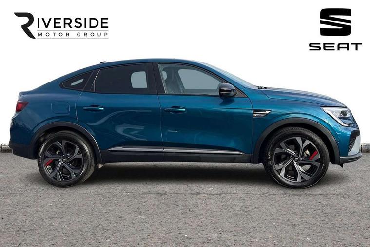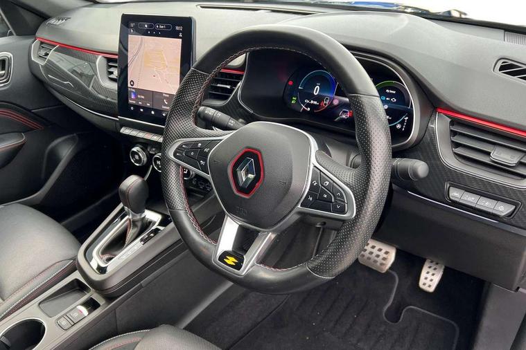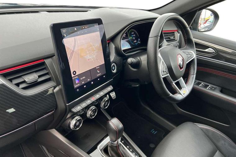 7" TFT Driver information display, Blind spot warning, Bluetooth system, EASY LINK 9.3" portrait touchscreen with navigation, Google search and traffic information, eCall emergency call system, Eco mode, EV button to activate pure mode, Front and rear parking sensors, Gear change indicator, Lane departure warning, Lane keep assist, Multi-sense - 3 driving modes and 8 ambient lighting, Rear cross traffic alert, Rear view camera, Renault automatic emergency assist, Smartphone integration compatible with Apple CarPlay and Android Auto, Traffic sign recognition with over speed prevention, Trip computer, Variable assistance electric power steering, Wireless phone charger, DAB radio, USB port, 3rd brake light, Auto dimming rear view mirror, Automatic headlights, Automatic high / low beam, Automatic windscreen wipers with rain sensor, Black side door protection with gun metal insert, Body coloured bumpers, C-shaped LED front signature lighting, Chrome decopart on wing (fender molding) with R.S. Line badge, Double chromed exhaust tailpipes elements, Extra tinted rear windows and tailgate, Frameless rear view mirror, Front and rear electric windows, Front bumper with F1 blade and honeycomb front grille, Front driver window with one touch facility and anti-pinch function, Front grille with chrome on upper part, Full LED headlights, Glossy black door mirror and lower window lining, Gun Metal front and rear skid plates, Heated rear window, R.S. Line badges on front wing and hatch door, Rain sensor, Rear windscreen wiper, Shiny black shark fin antenna, Side mirrors adjustable electrically, electrically foldable, with defrosting and temperature sensor, automatically foldable at vehicle closure, 3 seat bench in 2nd row, 60:40 split and fixed base rear seats, Aluminium pedals, Automatic climate control with combined filter, humidity sensor and AQS, Black interior roof lining, Carbon style dashboard, Central console with storage, Driver's seat height adjustment, Electrically adjustable front seats, Front and rear head restraints, Height and reach adjustable steering wheel, ISOFIX child seat fixing points on rear outermost seats, LED front and rear roof lights, Passenger seat height adjuster, R.S. line black suede-leather upholstery with red/grey stiching, R.S. Line perforated leather steering wheel with red/black harmony and R.S. Line badge, Rear air vents, Red inserts on air vents, Single front passenger seat, Parking Pack - Hands-free parking & flank protection - Arkana, Winter pack - Arkana, 3x3 point rear seat belts, ABS+EBA, Active emergency braking system, B Brake Mode - One pedal driving with increased regenerative braking, Distance warning alert, Driver airbag, Driver and passenger front and side airbag deactivation, Driver and passenger side airbags, Driver height adjustable seat belt, Electronic parking brake with auto hold, ESC (Electronic Stability Control), Front and rear no seatbelt warning sound, Front curtain airbags, Front head airbags, Hill start assist, Passenger airbag, Tyre pressure warning light, Anti drill door locks and locking fuel cap, Central door locking, Deadlocking system, Hands free keycard with Keyless access and start, RAID (Renault Anti-Intruder Device) automatic door locking, Rear side wing door and window child locking function (front driver door control panel), Superlocking, Thatcham alarm, 18" Silverstone diamond alloy wheels with red inserts,